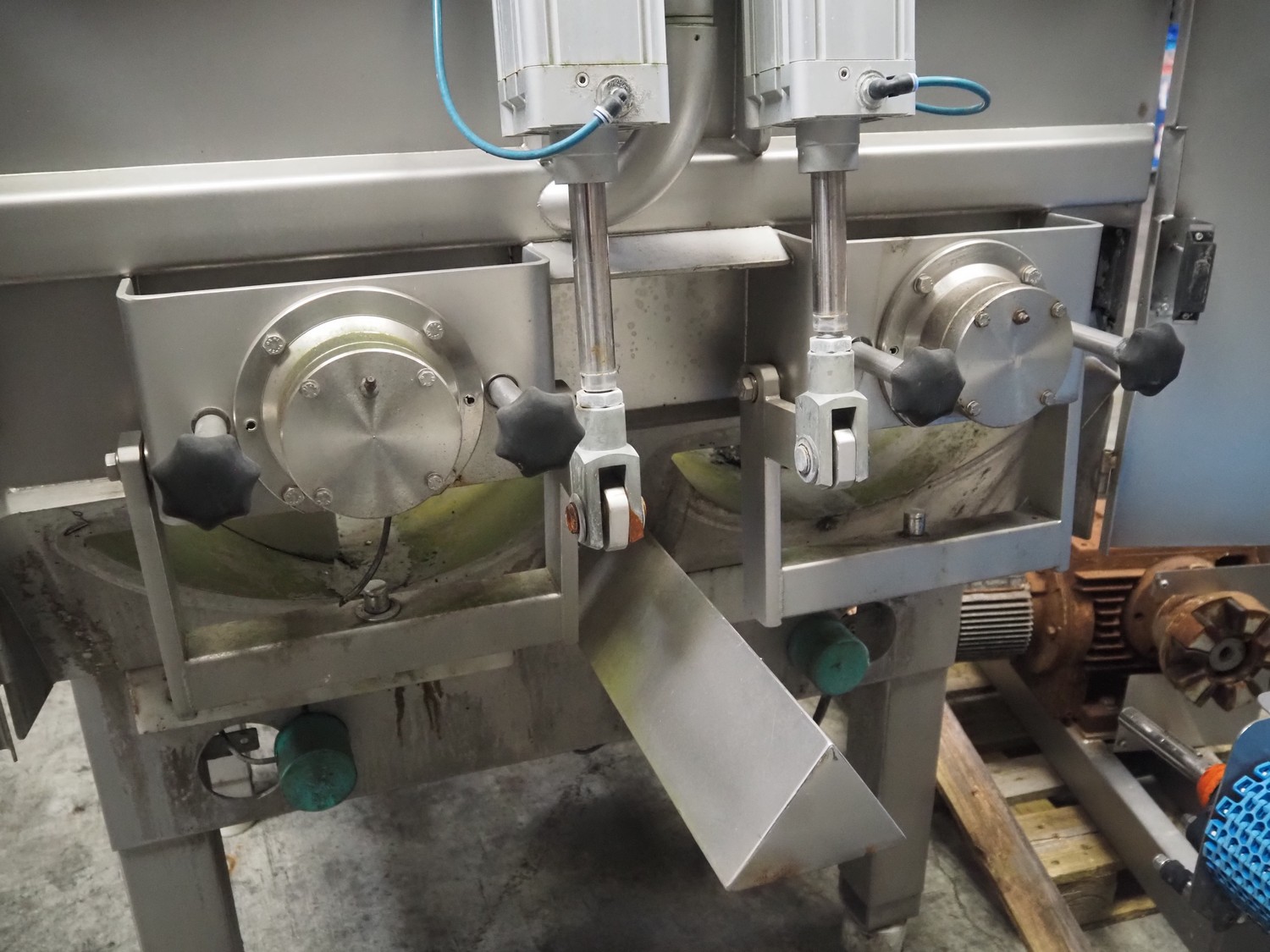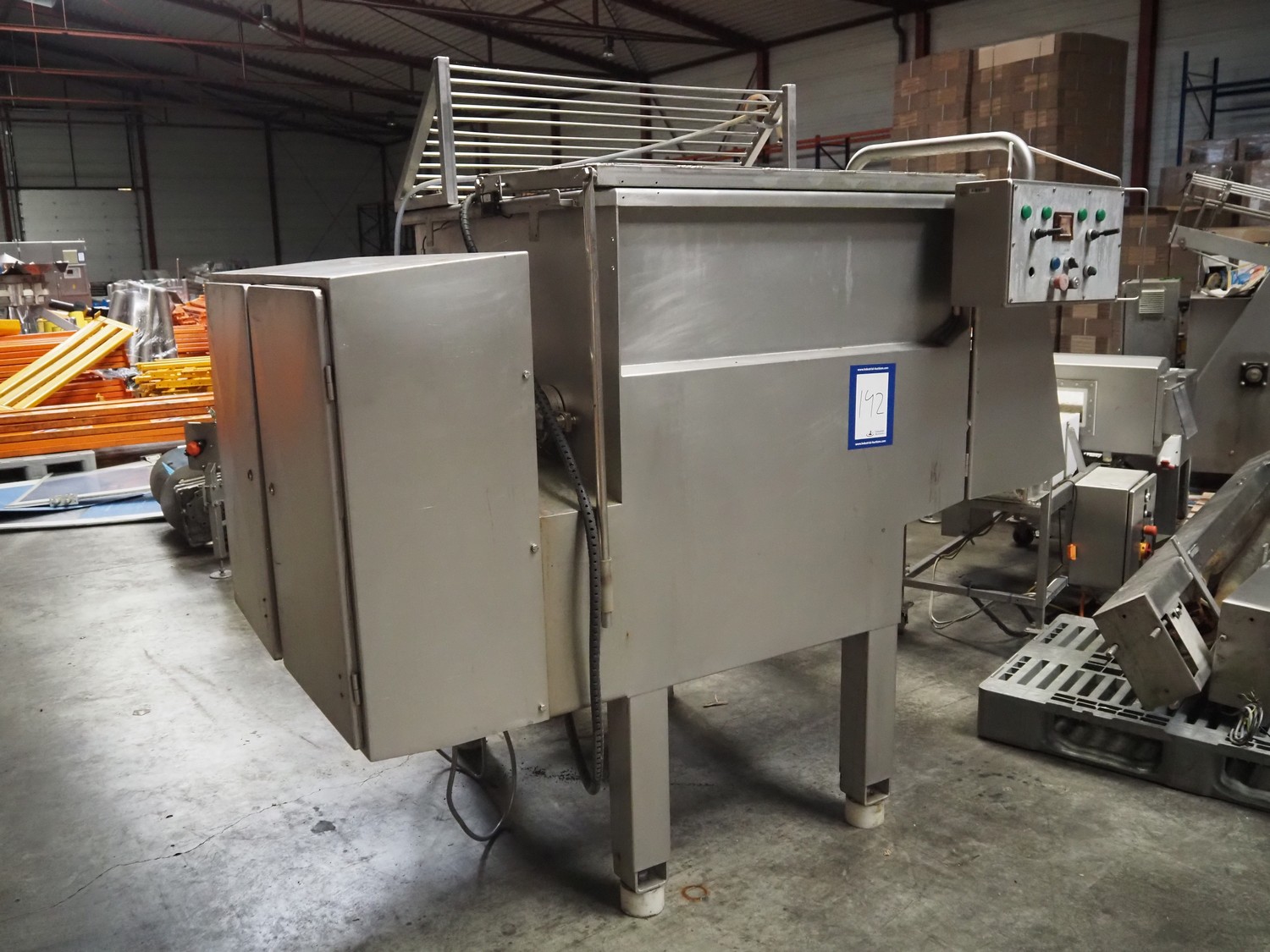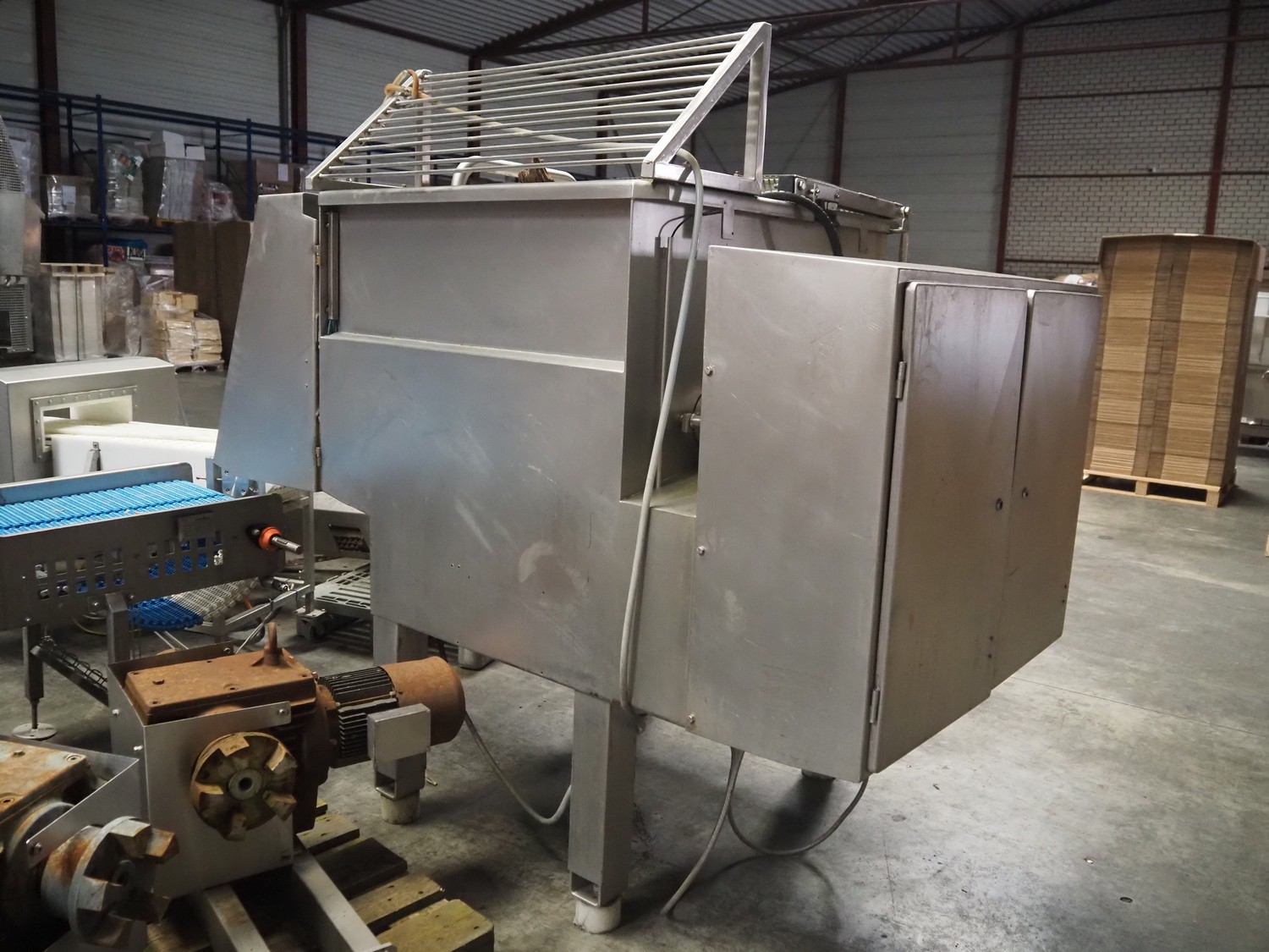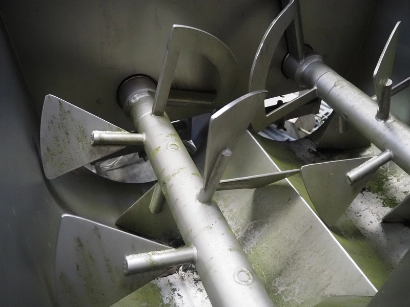 Double shaft paddle mixer, inside dimensions: 1000 mm x 1000 mm x 700 mm, total dimensions: 1400 mm x 2000 mm x 2000 mm.