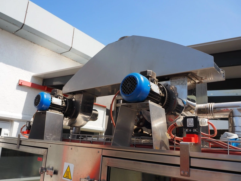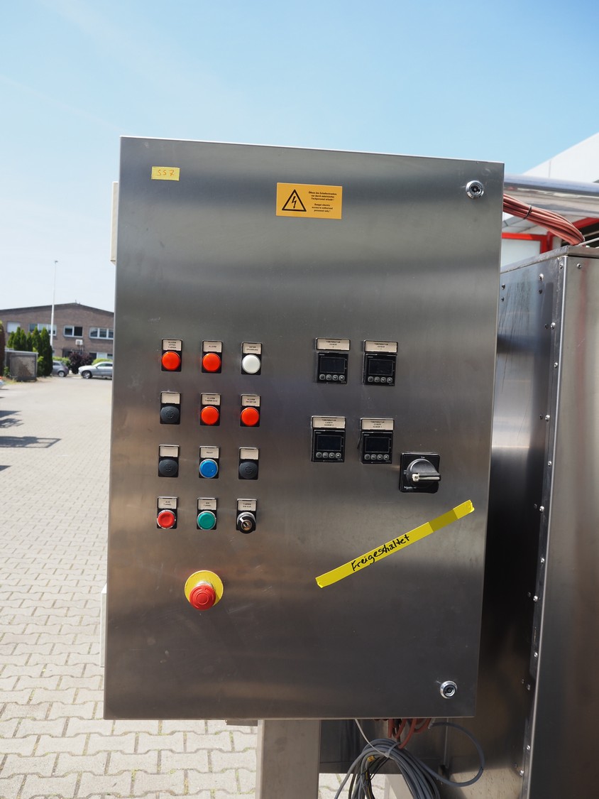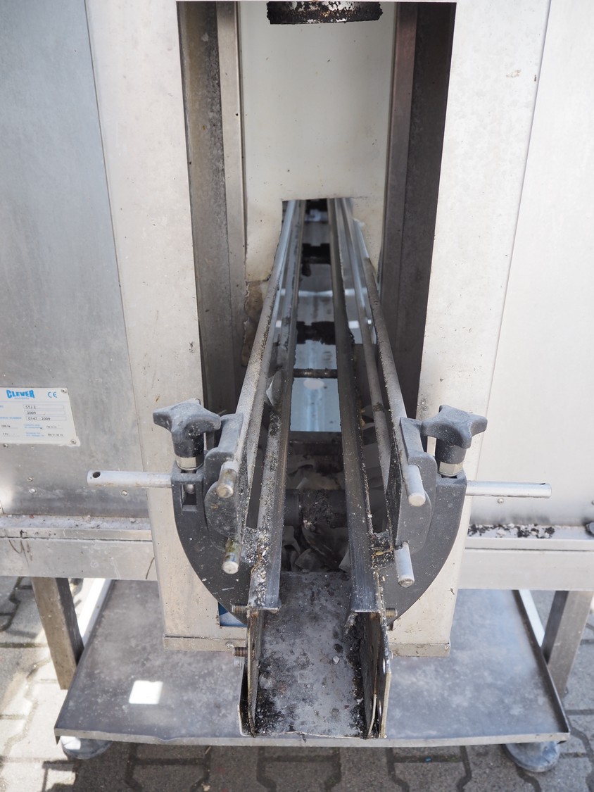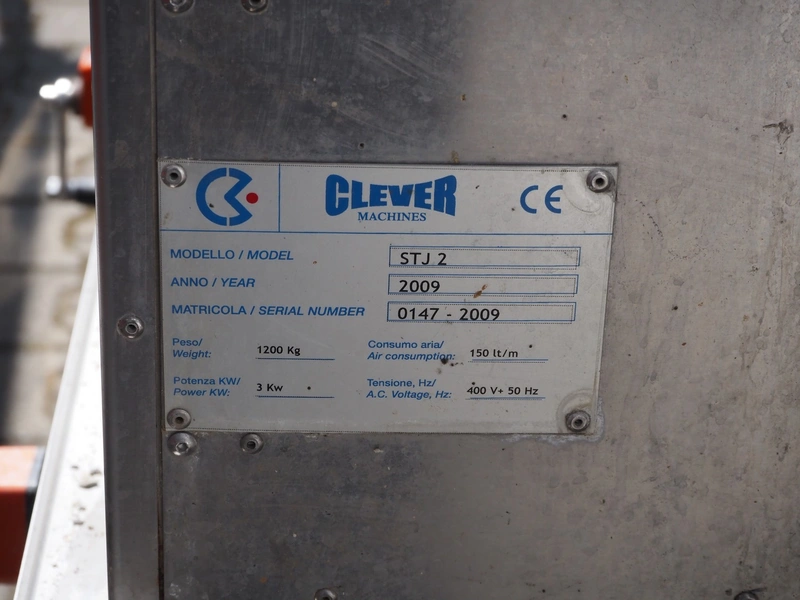 Clever Machines shrink tunnel, type: STJ 2, serial number: 0147 – 2009, year of construction: 2009, 400 V, 50 Hz, 3 kW, weight: 1200 kg, belt width: 85 mm, film width: 105 mm, steam heated, V.I.M.E.C. blowers, total dimensions: 4200 mm x 1100 mm x 2310 mm.