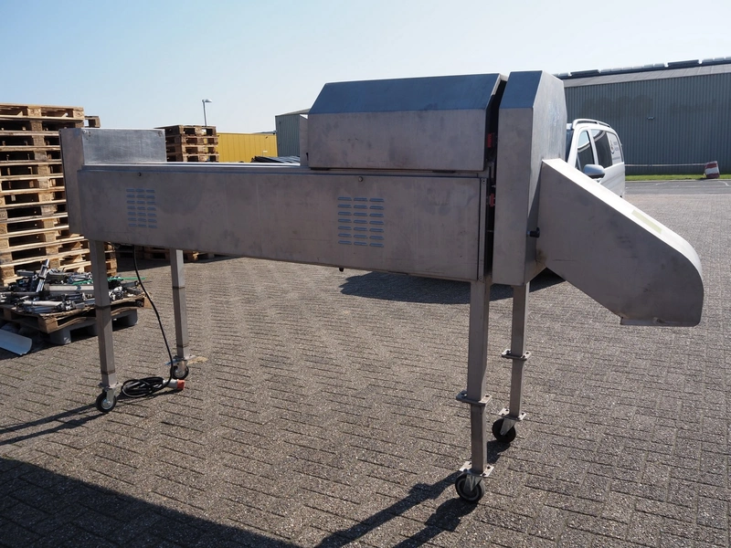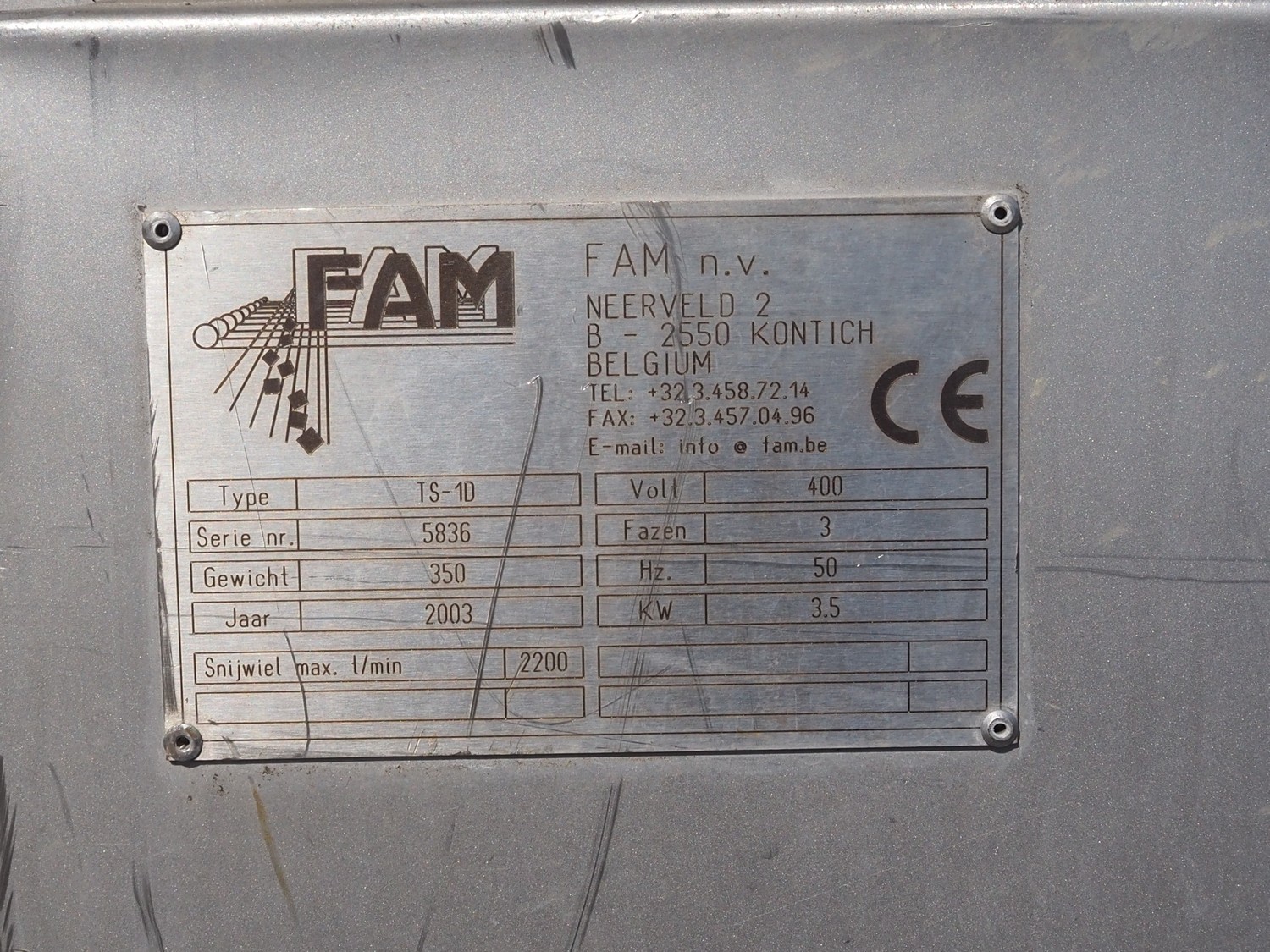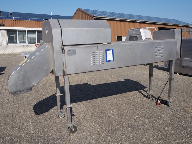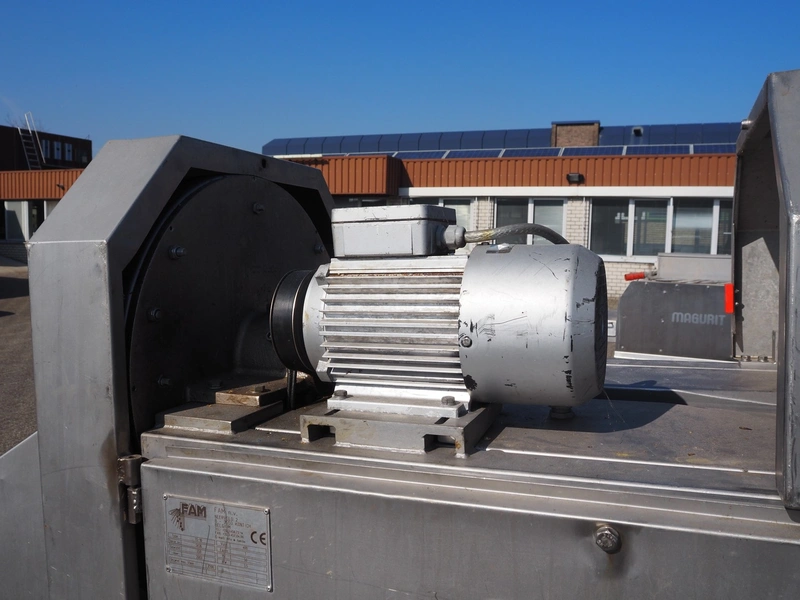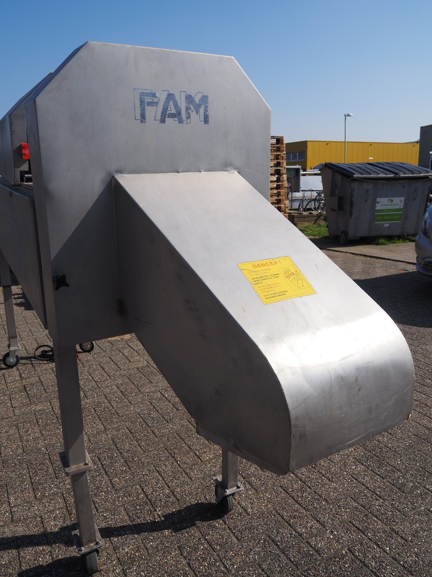 FAM mobile slicer, type: TS-1D, serial number: 5836, year of construction: 2003, 400 V, 3 Ph, 50 Hz, 3.5 kW, weight: 350 kg, plastic belt, belt width: 85 mm, clearance: 100 mm x 150 mm, total dimensions: 3300 mm x 750 mm x 1750 mm.