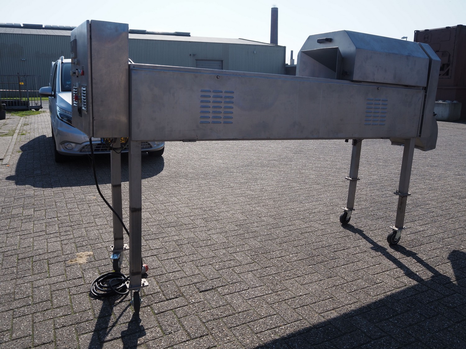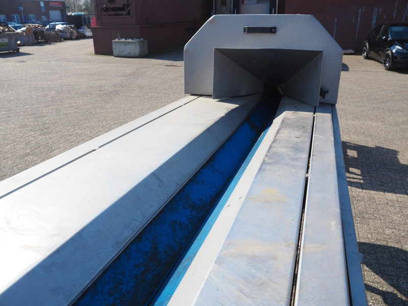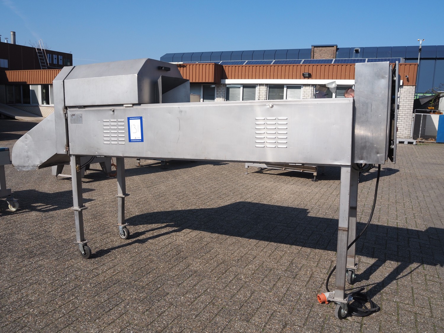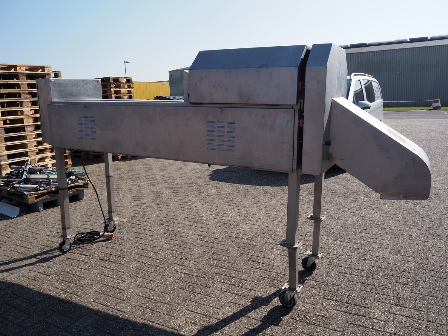 FAM mobile slicer, type: TS-1D, serial number: 5836, year of construction: 2003, 400 V, 3 Ph, 50 Hz, 3.5 kW, weight: 350 kg, plastic belt, belt width: 85 mm, clearance: 100 mm x 150 mm, total dimensions: 3300 mm x 750 mm x 1750 mm.