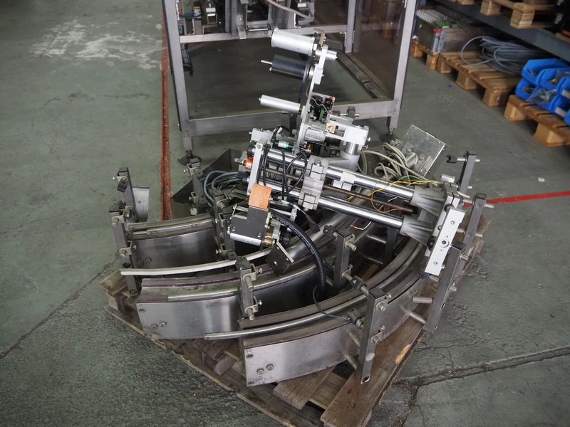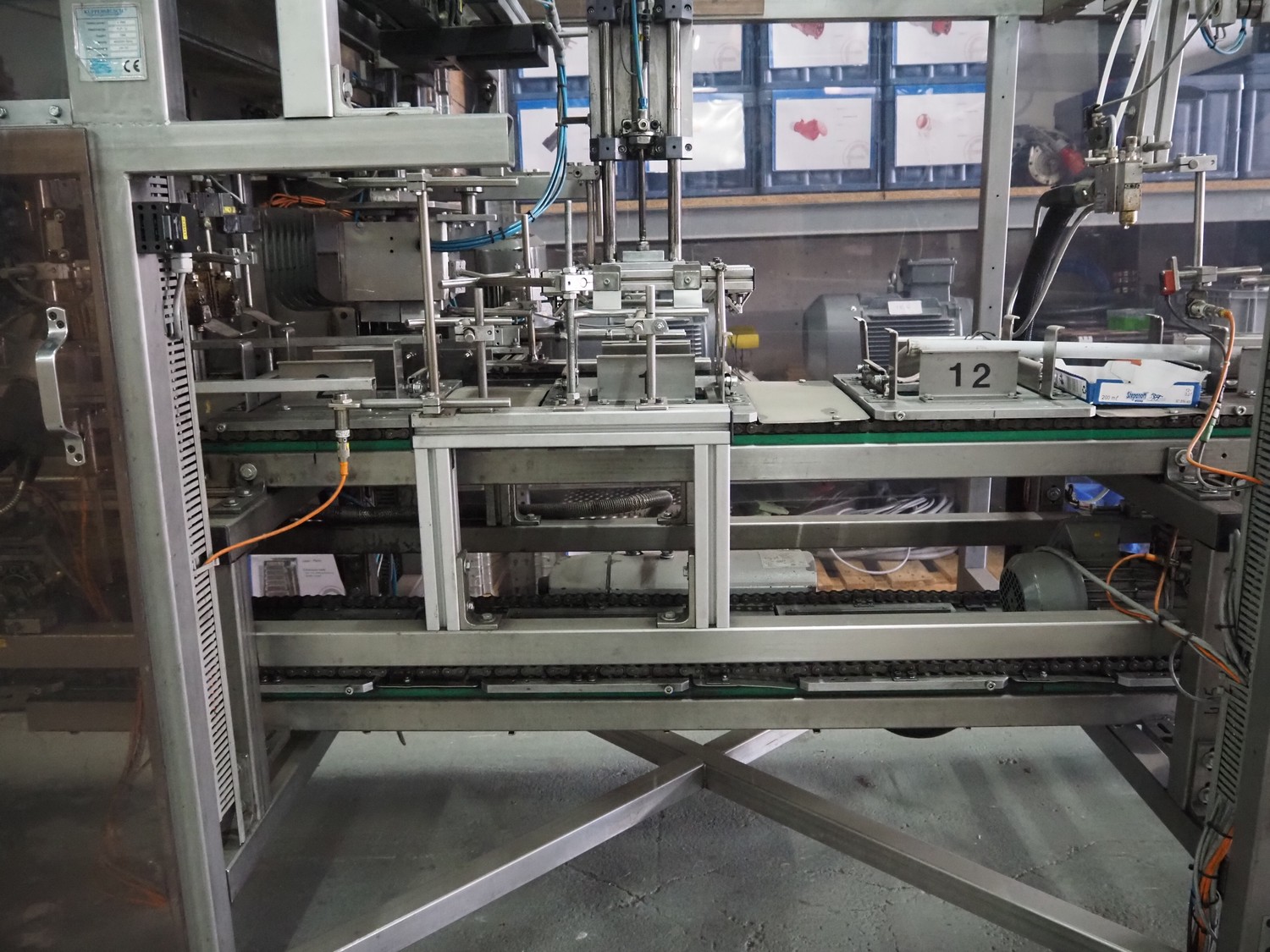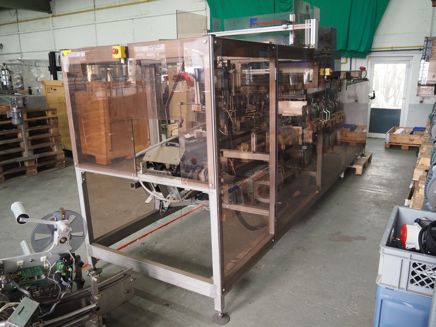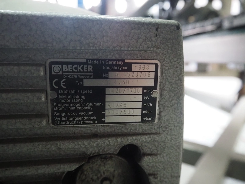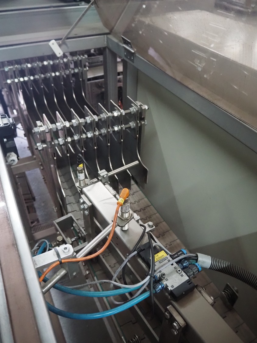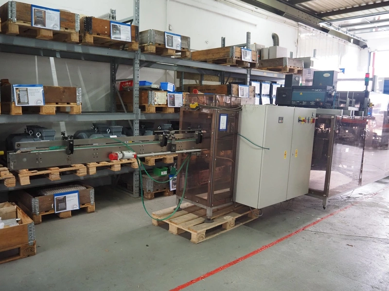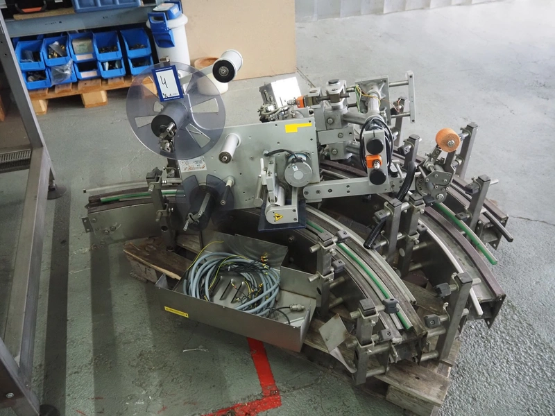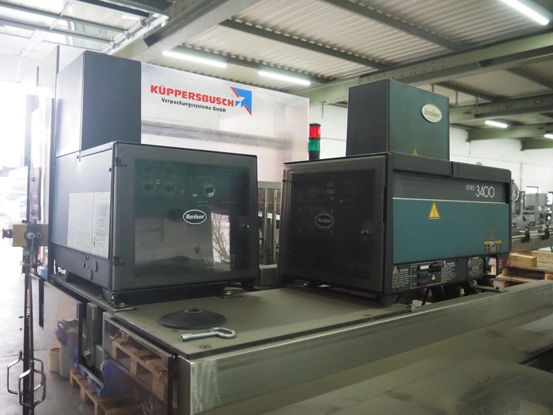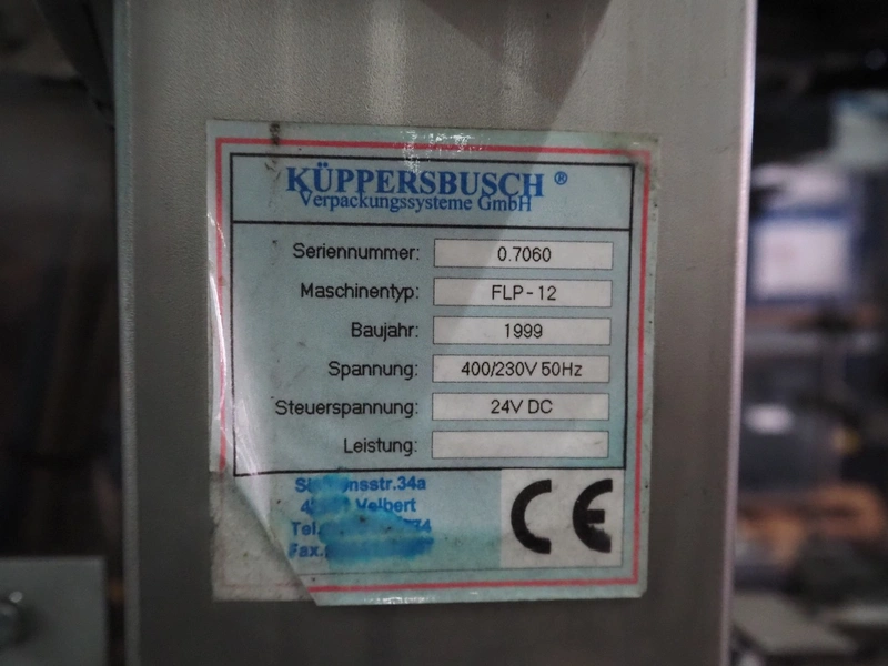 Küppersbusch verpackungssysteme GmbH tray folding and filling machine, type: FLP-12, serial number: 0.7060, year of construction: 1999, 400/230 V, 50 Hz, Becker vacuum pump, type: VT. 4.40, capacity: 40/48 m³/h, 2 Nordson glue units, unit number: 3400-2EA43/R, plastic belt with 6 lanes, belt width: 80 mm, lane width: 37 mm, tray width: 220 mm x 155 mm, total dimensions: 7000 mm x 1350 mm x 2180 mm. Including pallet with labelling machine, dimensions: 1500 mm x 1000 mm x 800 mm.