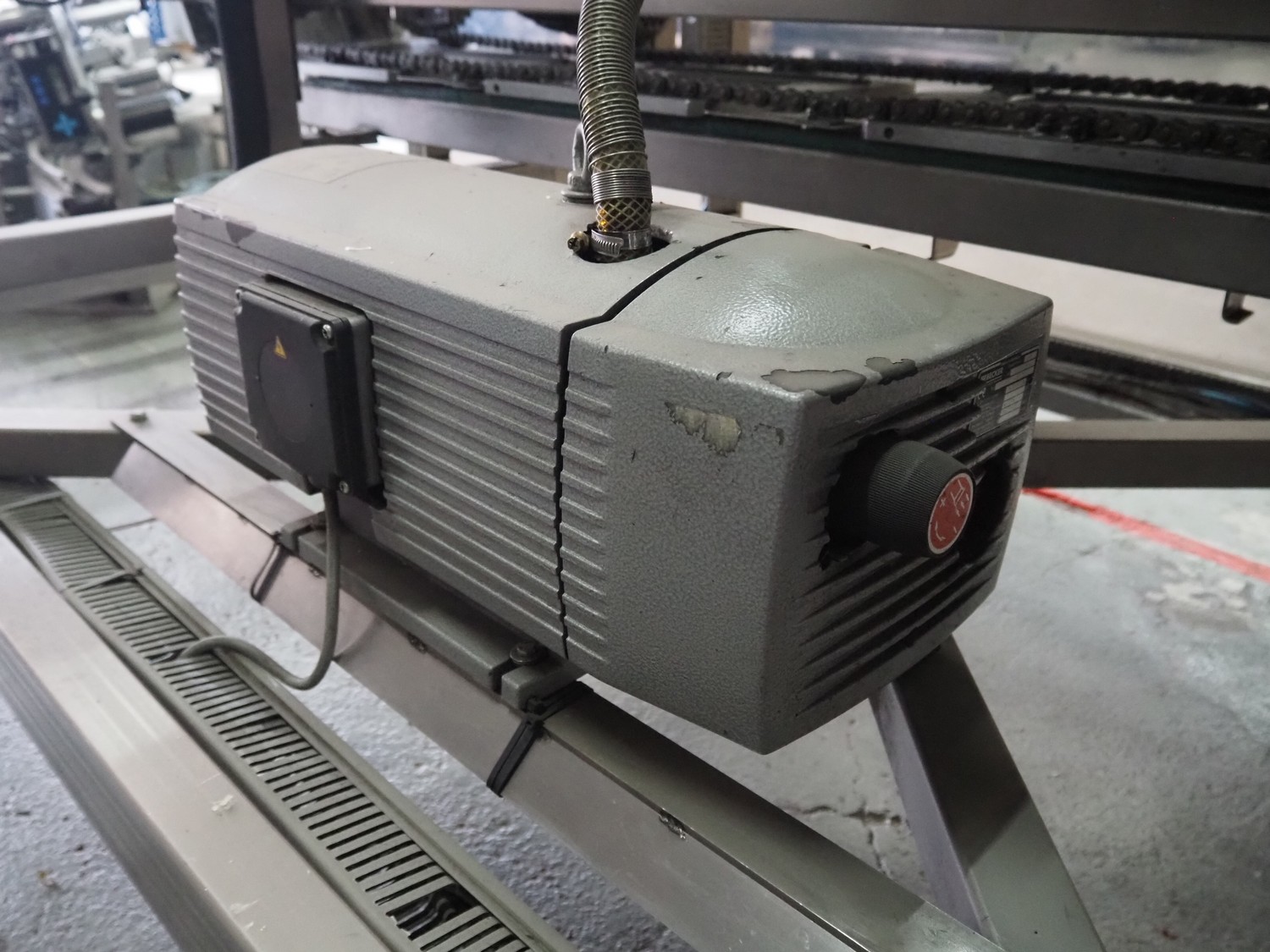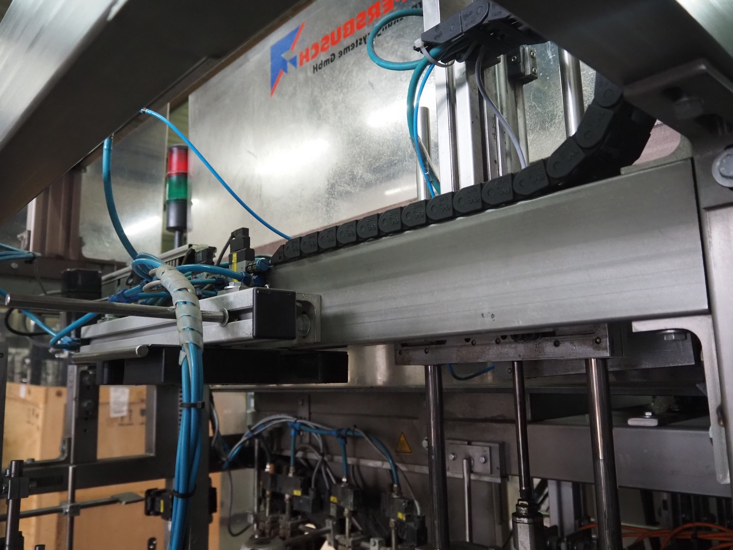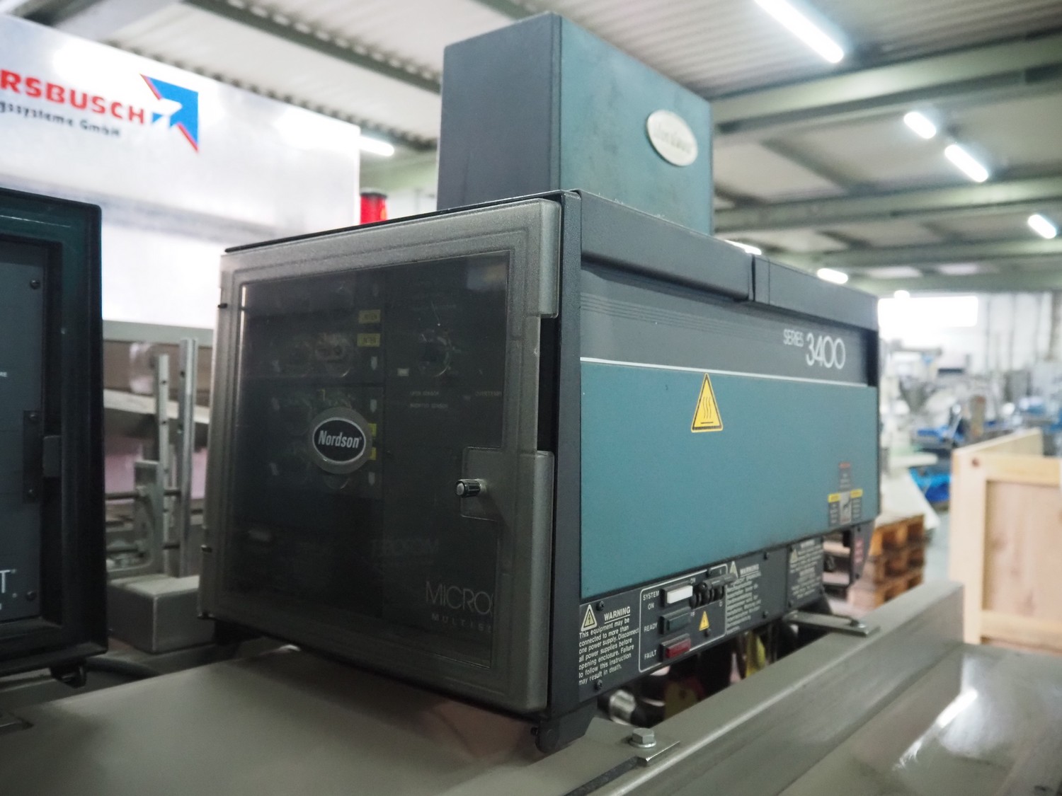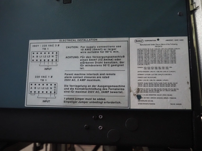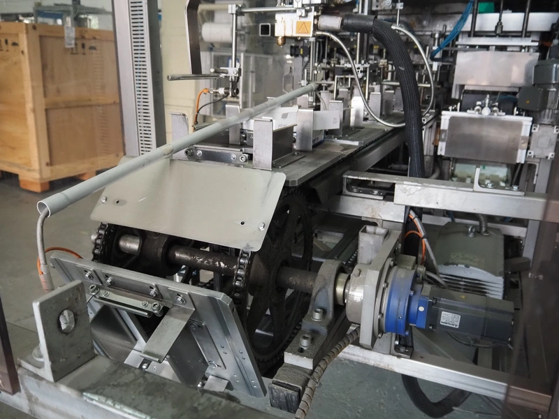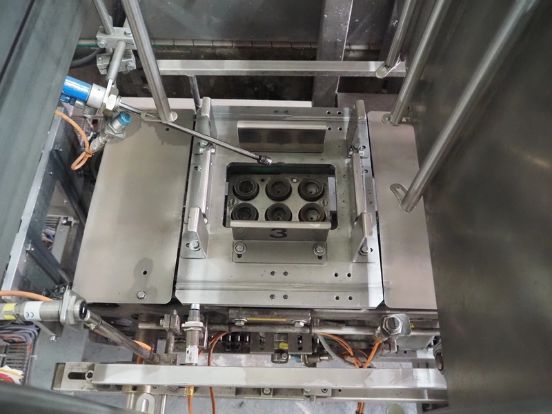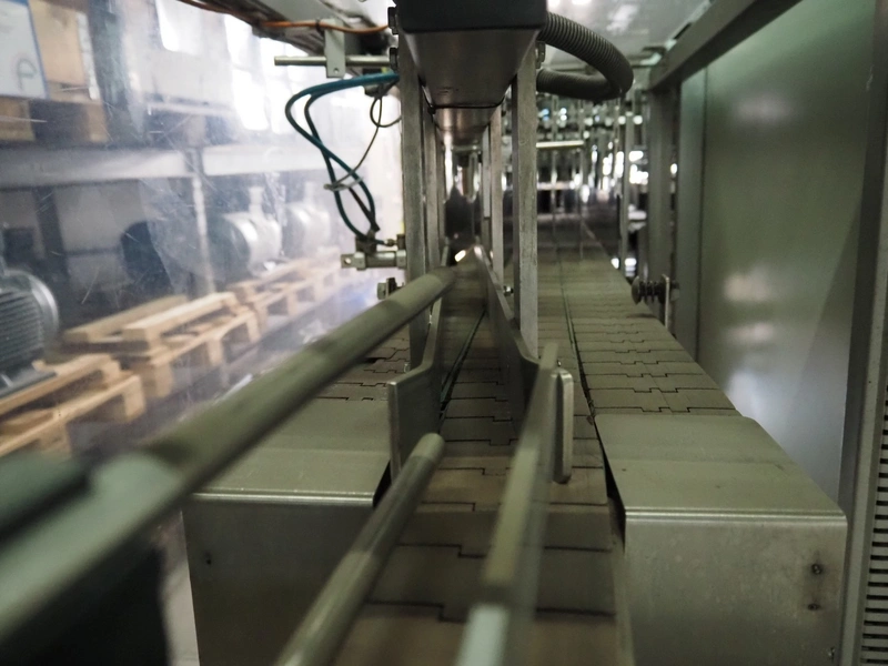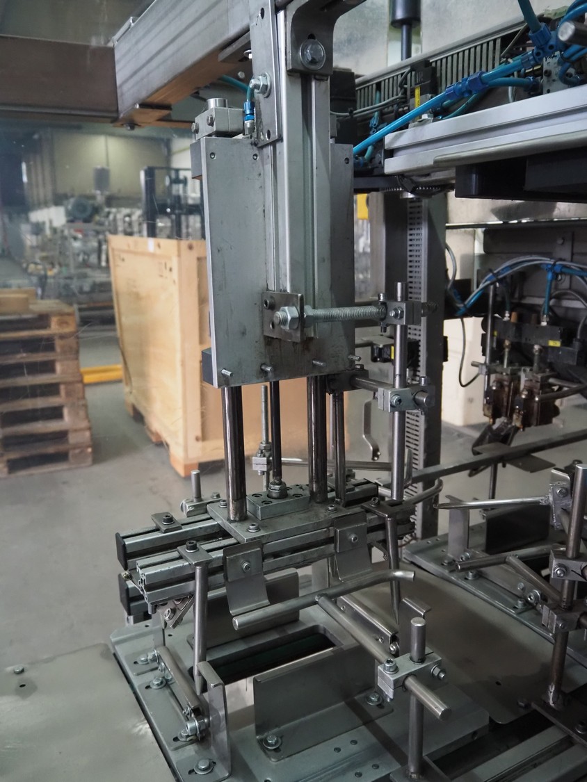 Küppersbusch verpackungssysteme GmbH tray folding and filling machine, type: FLP-12, serial number: 0.7060, year of construction: 1999, 400/230 V, 50 Hz, Becker vacuum pump, type: VT. 4.40, capacity: 40/48 m³/h, 2 Nordson glue units, unit number: 3400-2EA43/R, plastic belt with 6 lanes, belt width: 80 mm, lane width: 37 mm, tray width: 220 mm x 155 mm, total dimensions: 7000 mm x 1350 mm x 2180 mm. Including pallet with labelling machine, dimensions: 1500 mm x 1000 mm x 800 mm.