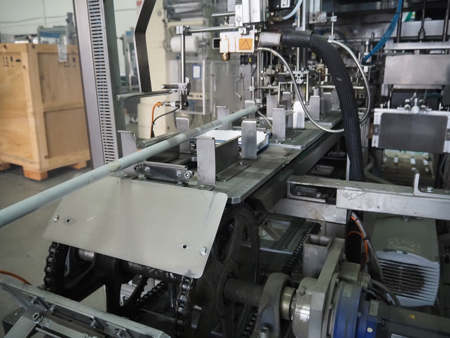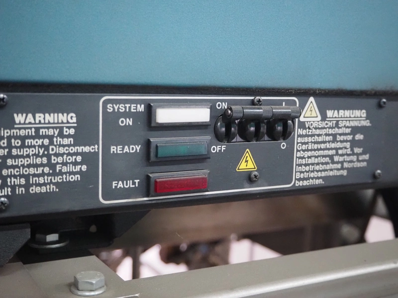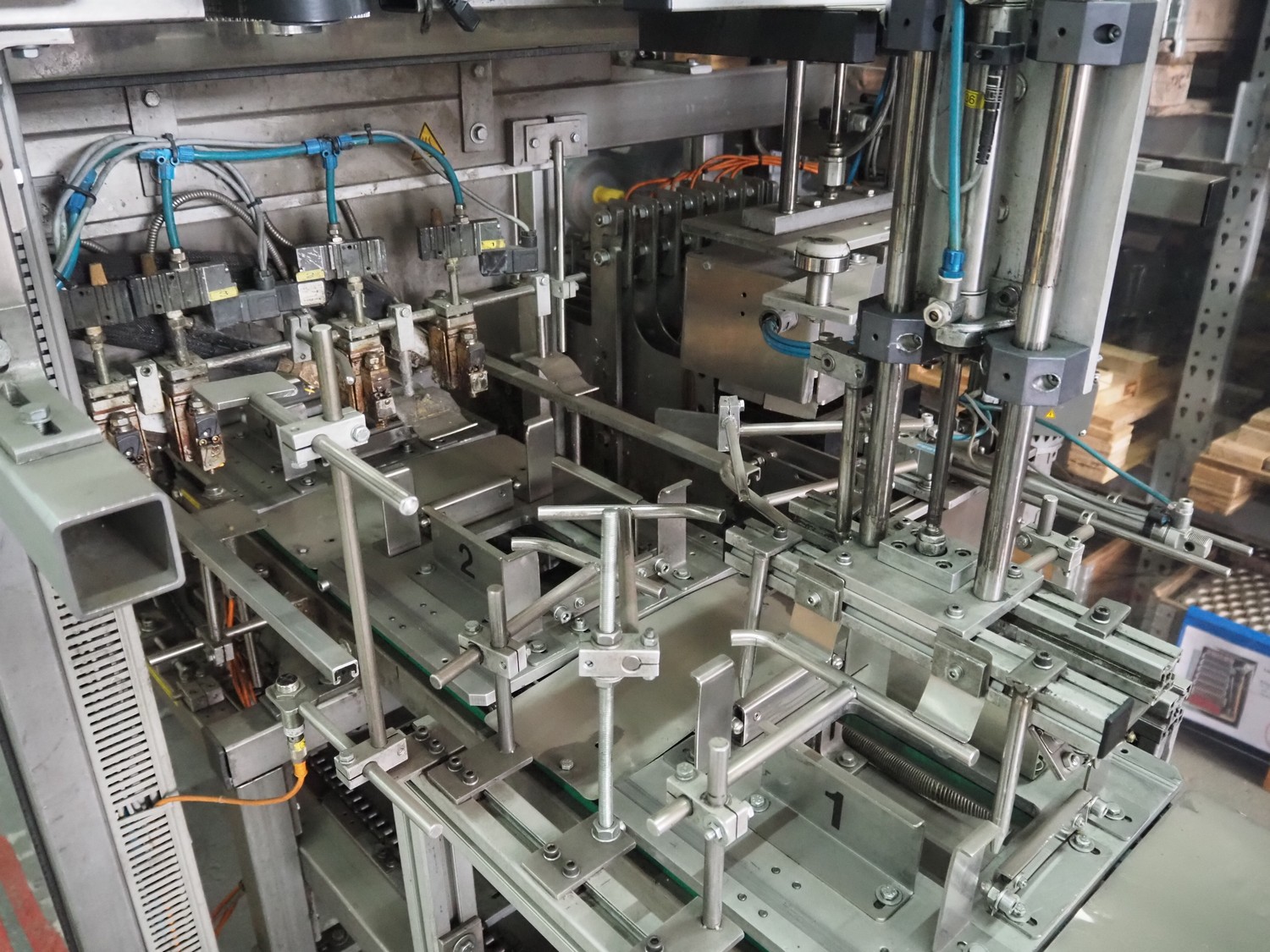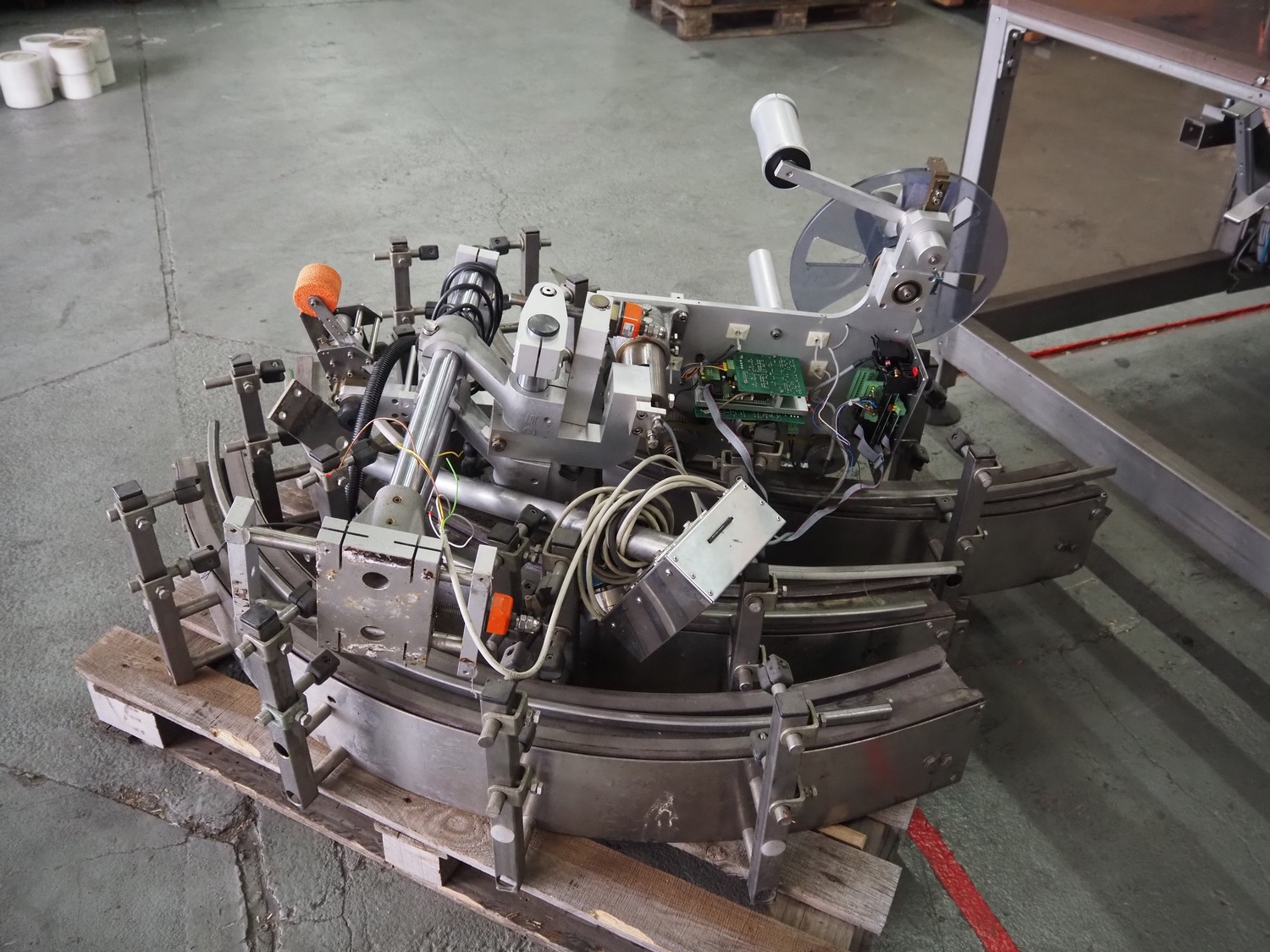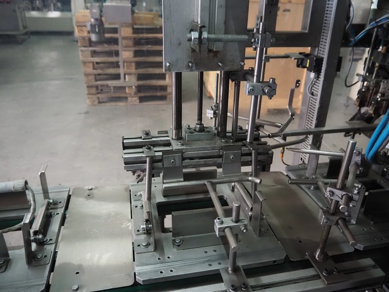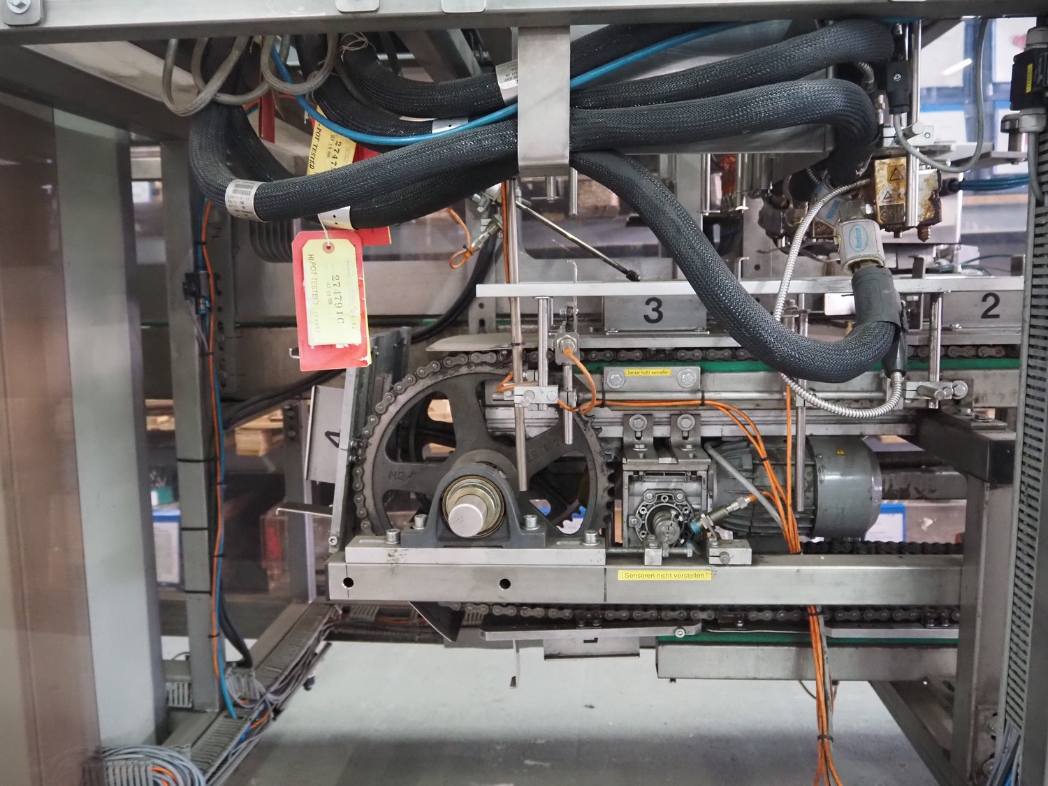 Küppersbusch verpackungssysteme GmbH tray folding and filling machine, type: FLP-12, serial number: 0.7060, year of construction: 1999, 400/230 V, 50 Hz, Becker vacuum pump, type: VT. 4.40, capacity: 40/48 m³/h, 2 Nordson glue units, unit number: 3400-2EA43/R, plastic belt with 6 lanes, belt width: 80 mm, lane width: 37 mm, tray width: 220 mm x 155 mm, total dimensions: 7000 mm x 1350 mm x 2180 mm. Including pallet with labelling machine, dimensions: 1500 mm x 1000 mm x 800 mm.