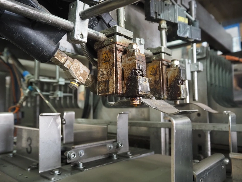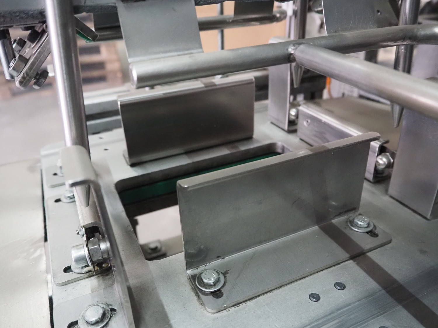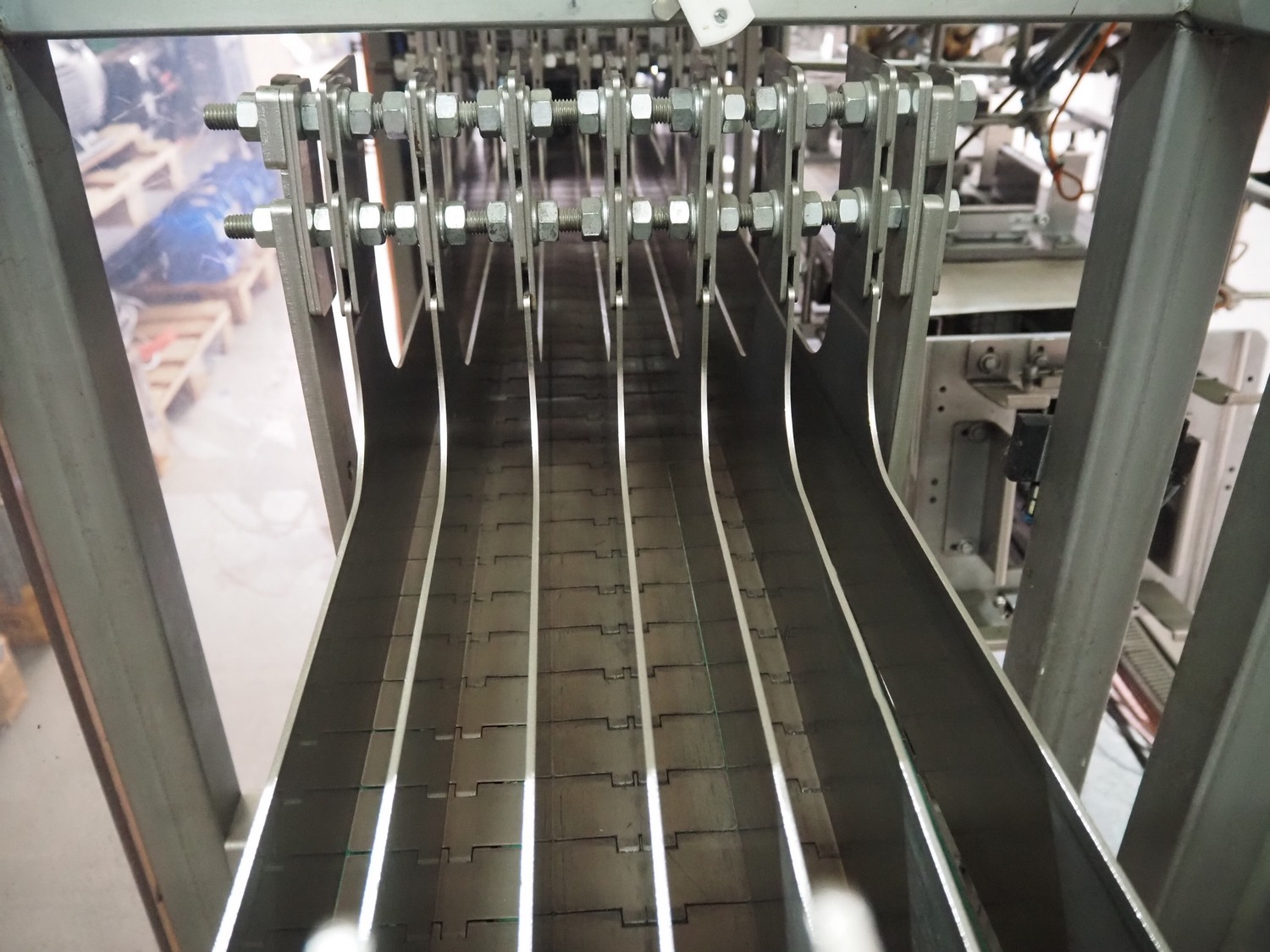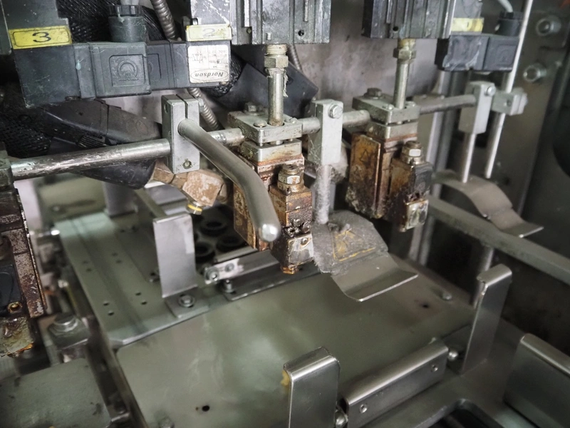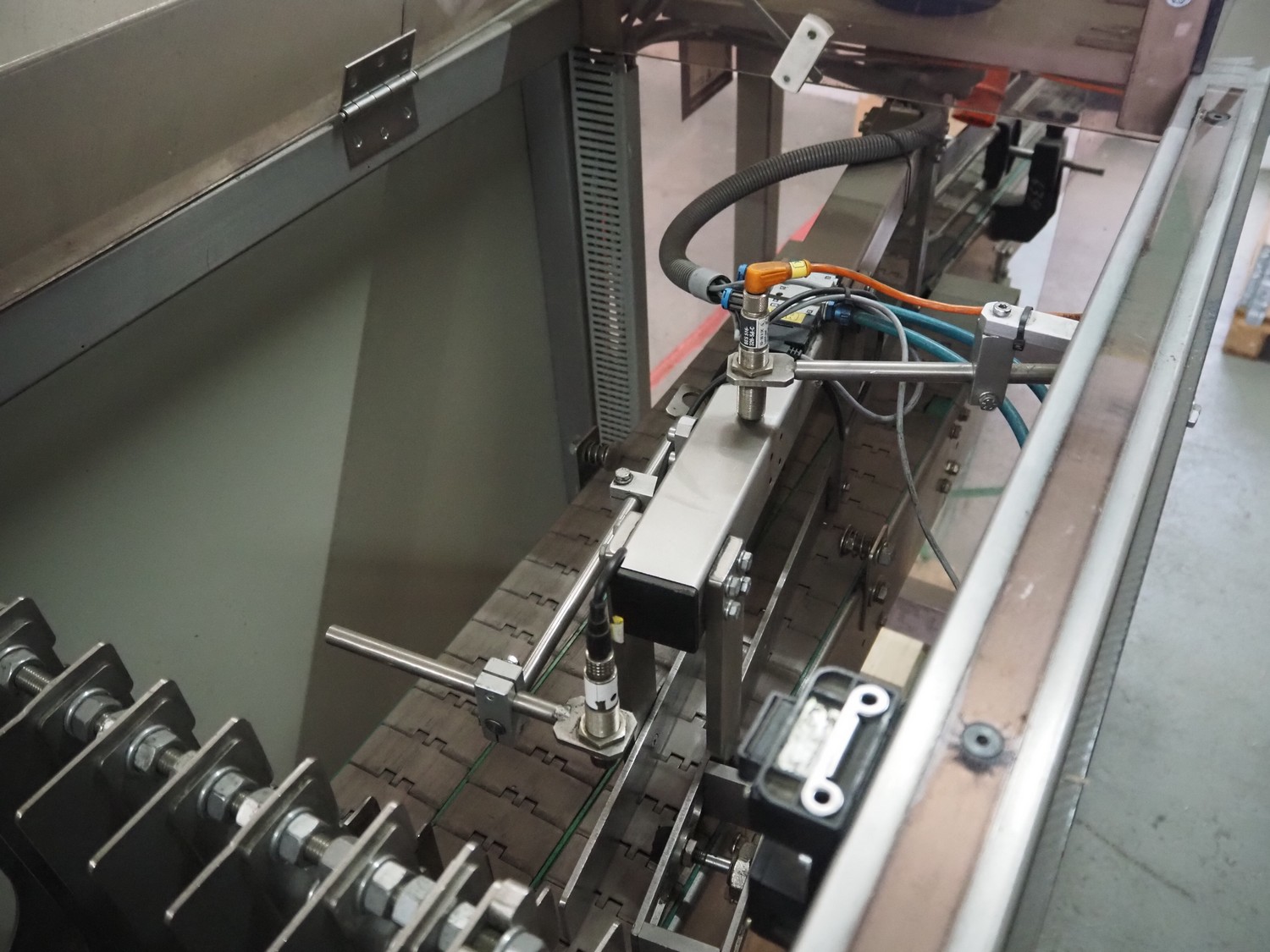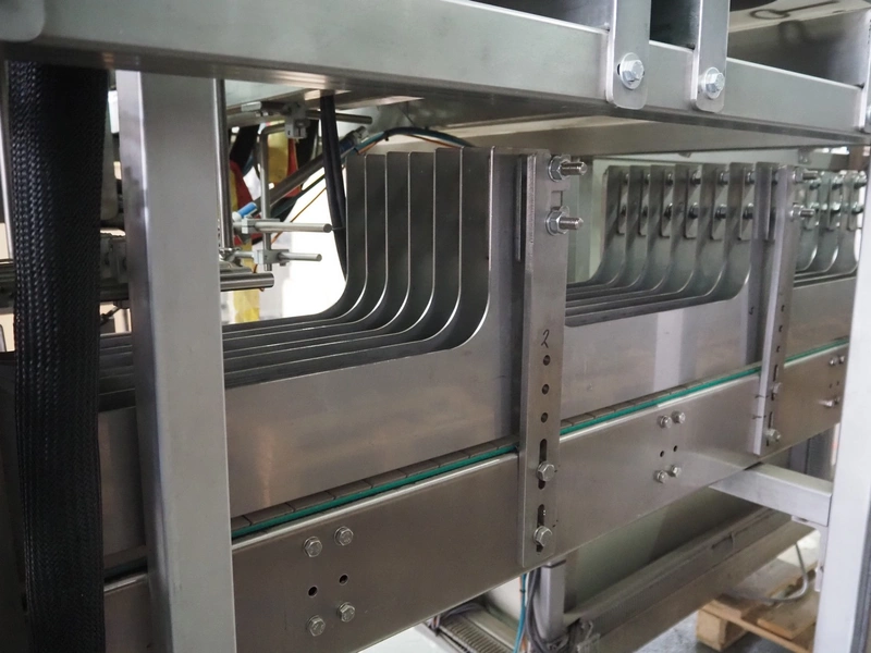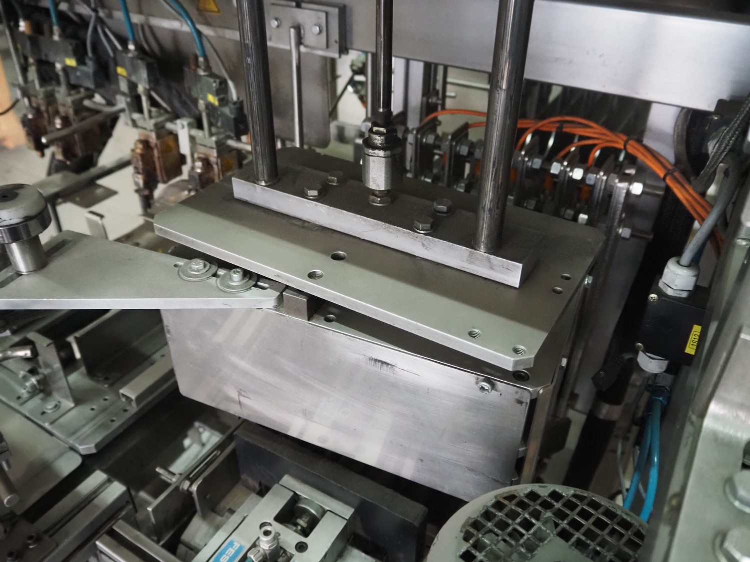 Küppersbusch verpackungssysteme GmbH tray folding and filling machine, type: FLP-12, serial number: 0.7060, year of construction: 1999, 400/230 V, 50 Hz, Becker vacuum pump, type: VT. 4.40, capacity: 40/48 m³/h, 2 Nordson glue units, unit number: 3400-2EA43/R, plastic belt with 6 lanes, belt width: 80 mm, lane width: 37 mm, tray width: 220 mm x 155 mm, total dimensions: 7000 mm x 1350 mm x 2180 mm. Including pallet with labelling machine, dimensions: 1500 mm x 1000 mm x 800 mm.