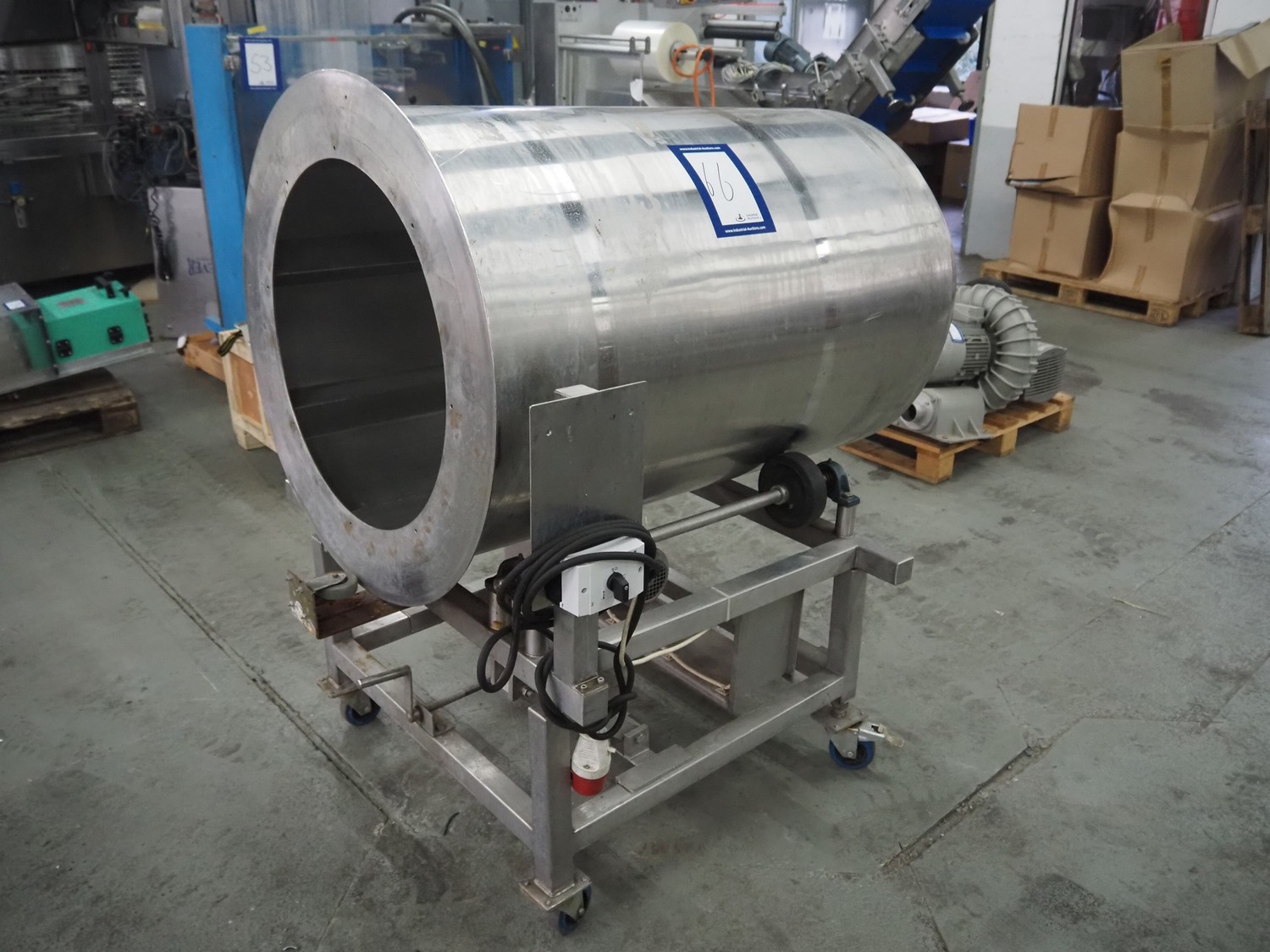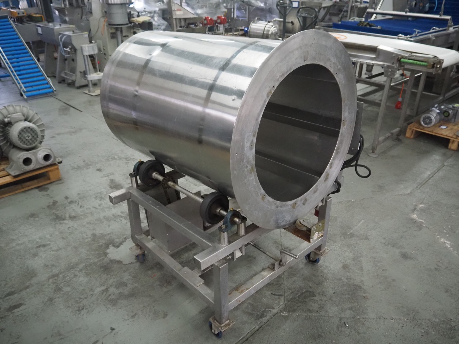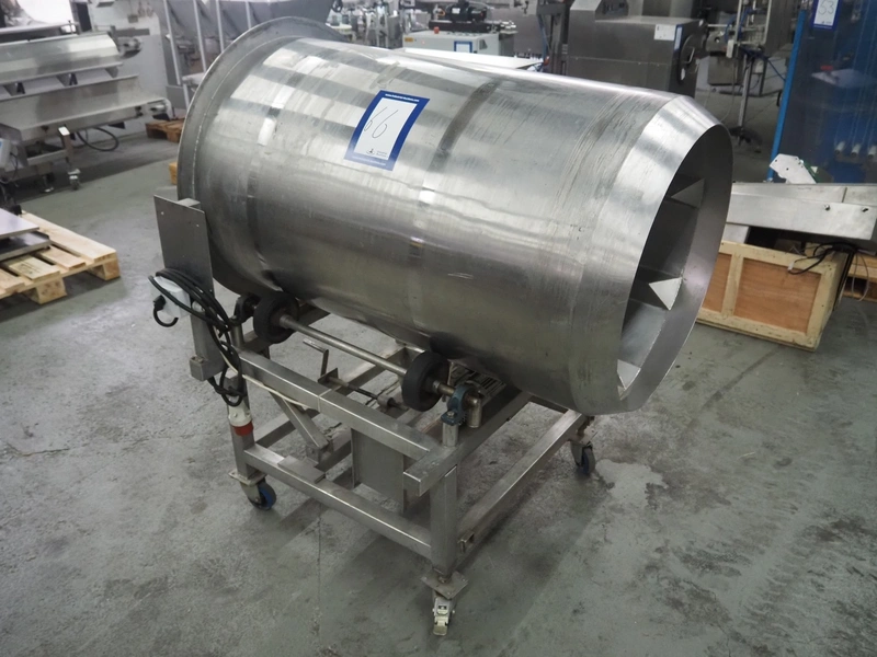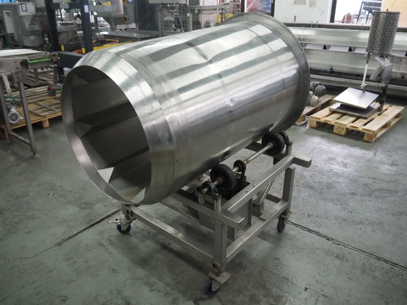 Mobile s/s tumbler, inside dimensions: Ø 650 mm x 1200 mm, total dimensions: 1250 mm x 1100 mm x 1500 mm.