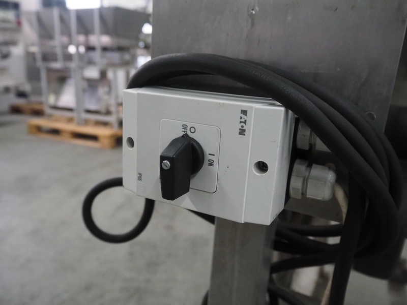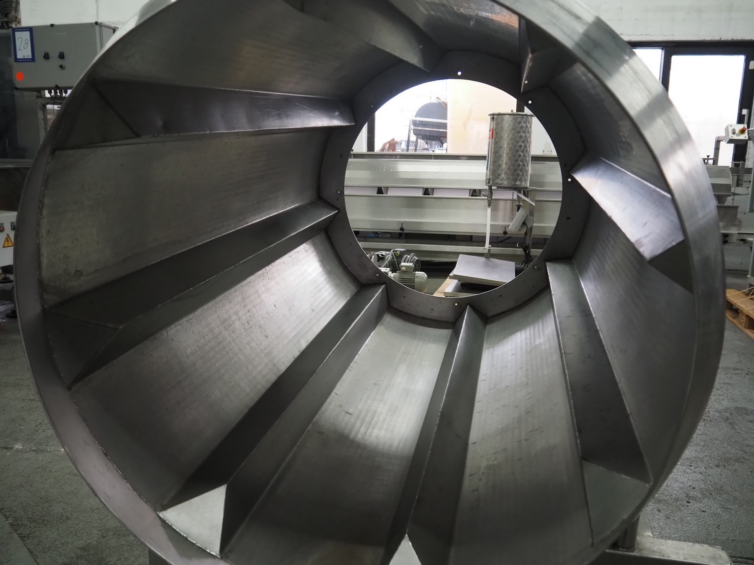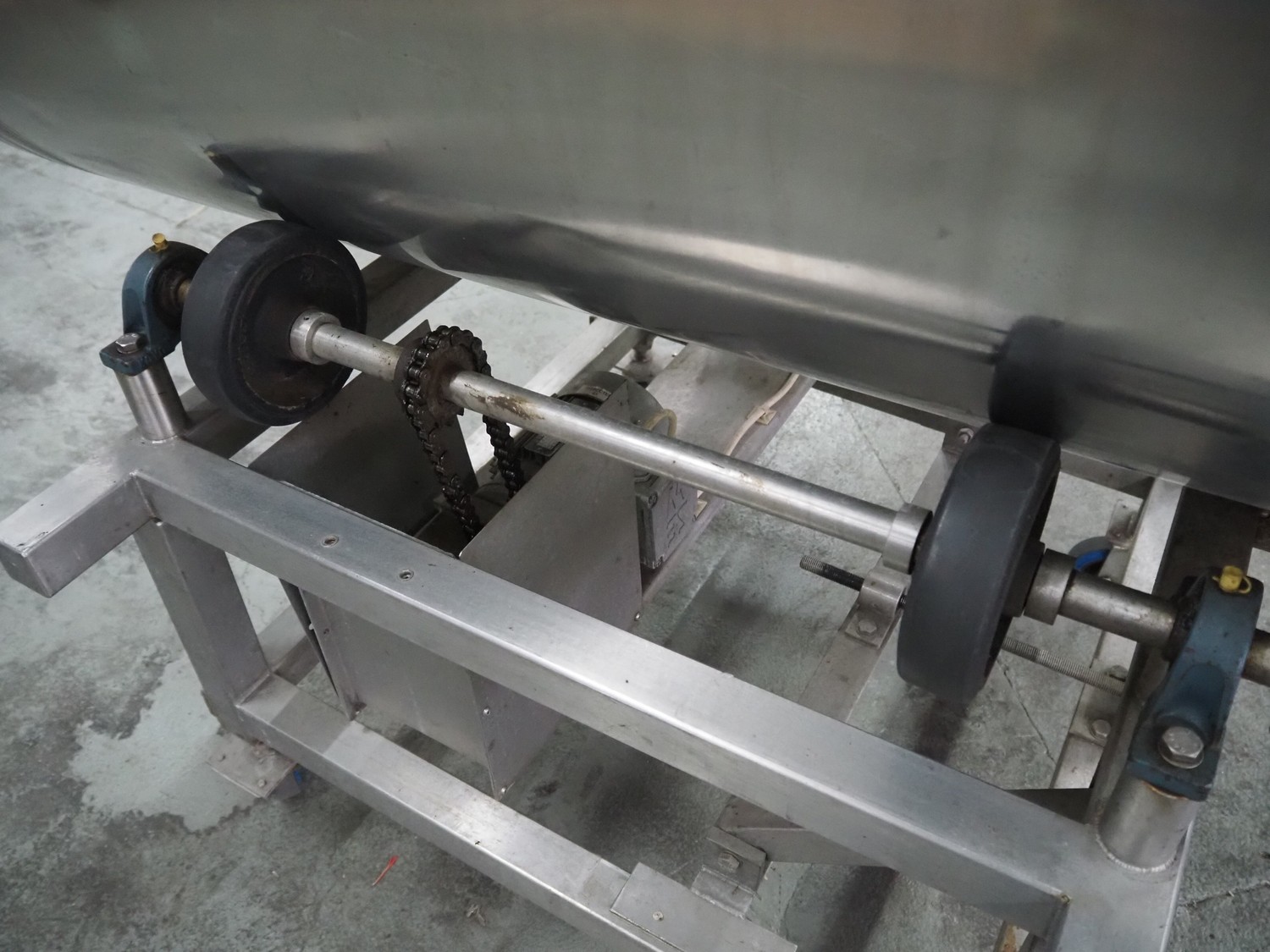 Mobile s/s tumbler, inside dimensions: Ø 650 mm x 1200 mm, total dimensions: 1250 mm x 1100 mm x 1500 mm.