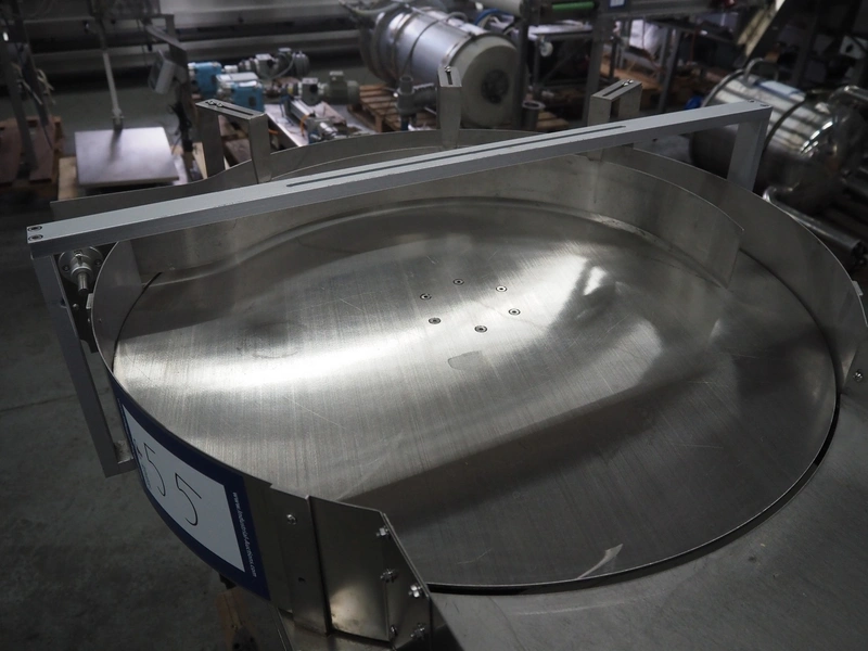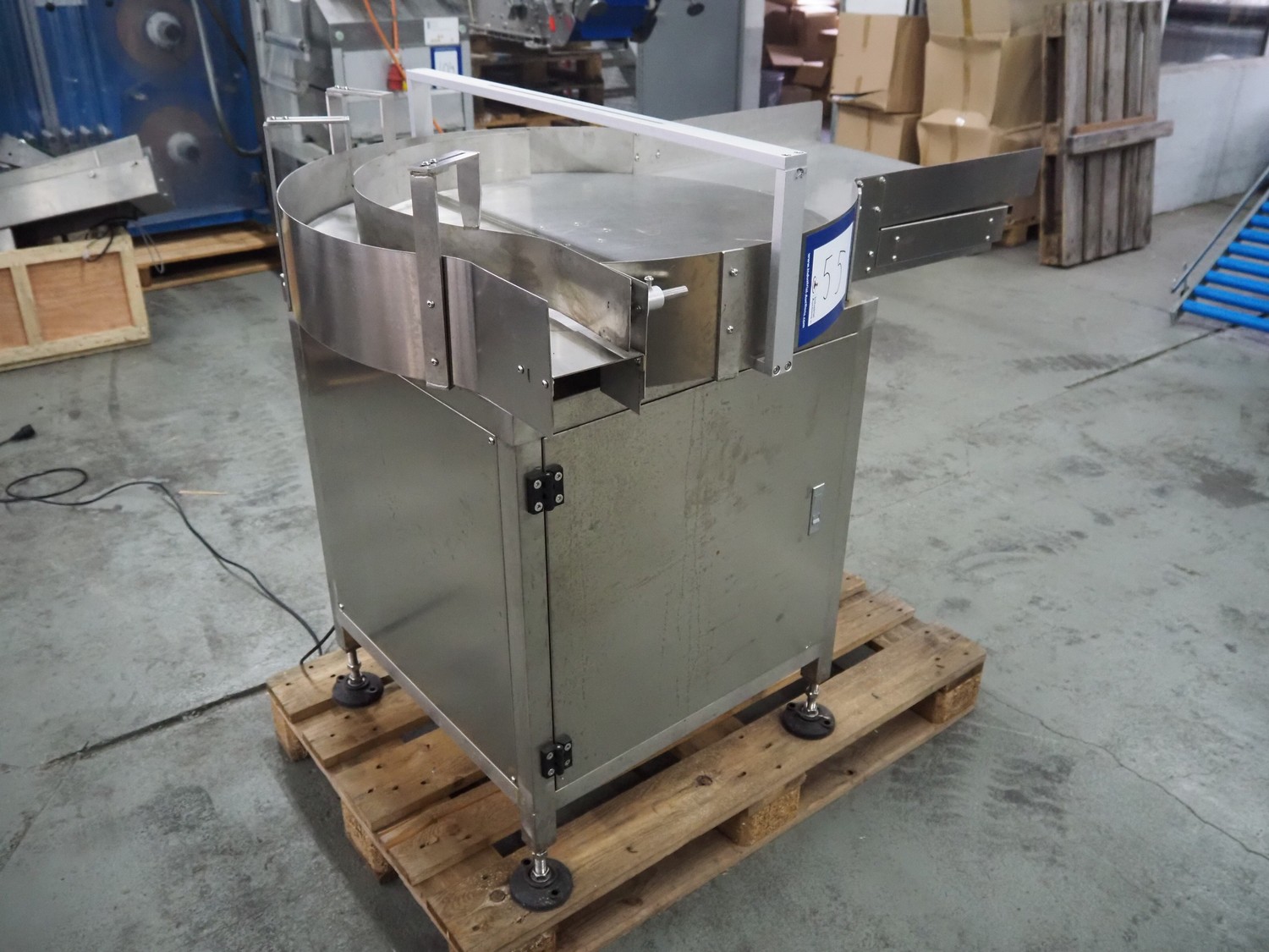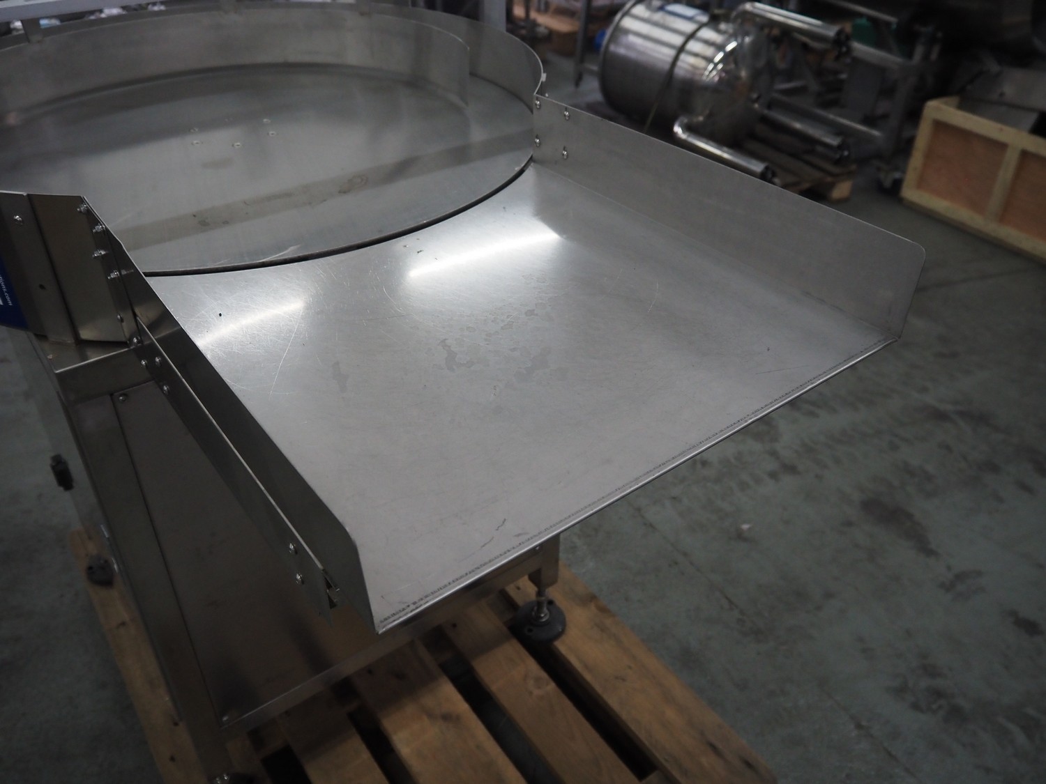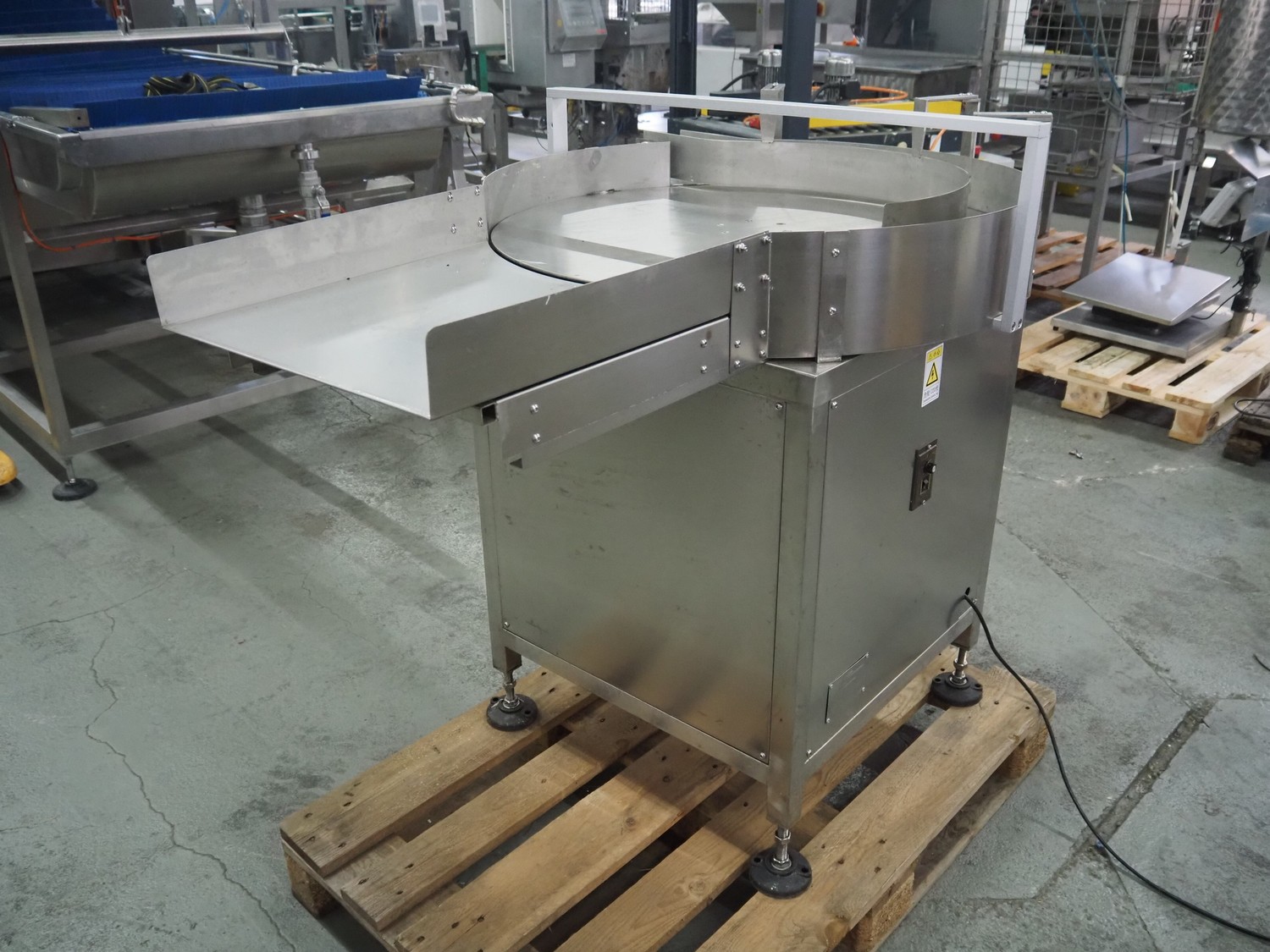 S/s turning table, type: Round bottle unscrambler, model: TGM-LP10, year of construction: 10-2020, 220 V, 50 Hz, 120 W, table diameter: 800 mm, total dimensions: 1200 mm x 870 mm x 1100 mm.