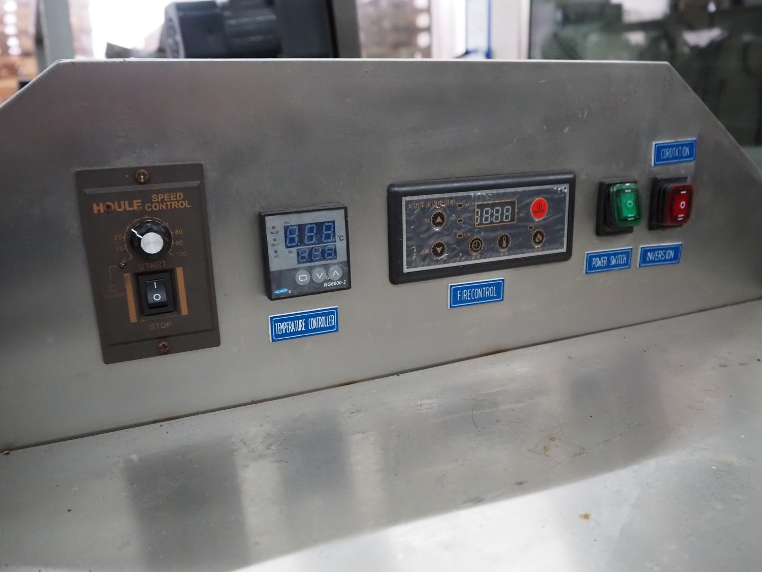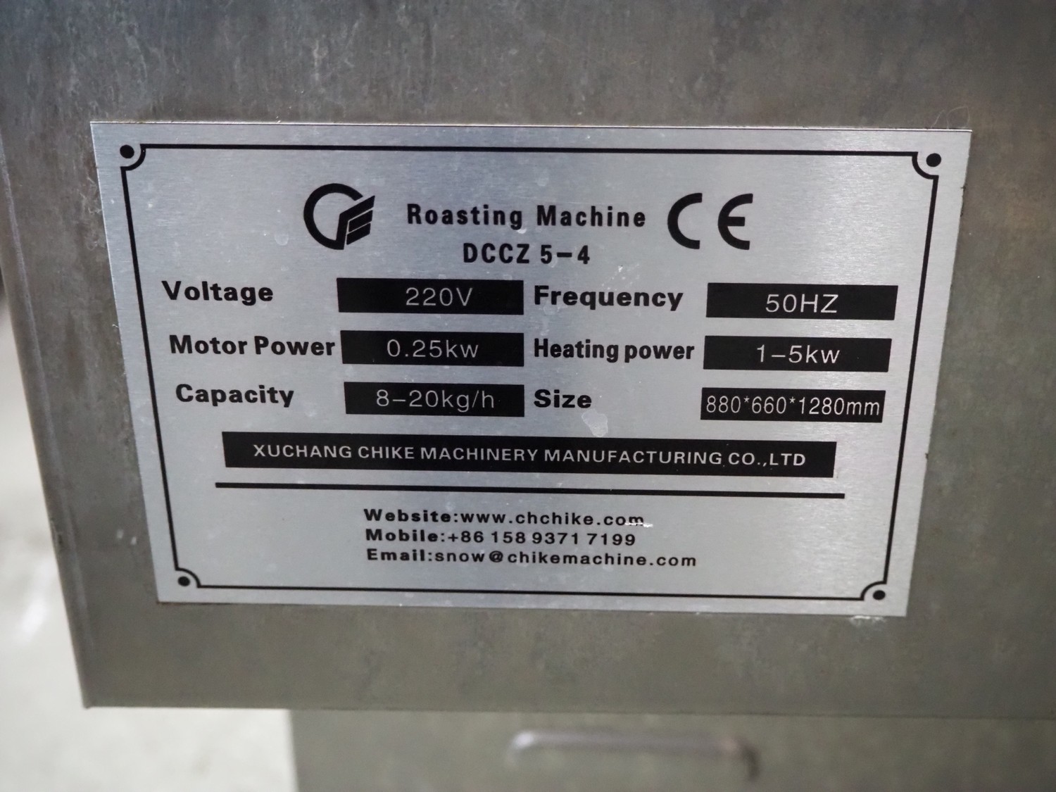 Xuchang Chike Machinery Manufacturing Co., Ltd mobile roasting machine, type: DCCZ 5-4, 220 V, 50 h, 1-5 kW, capacity: 8-20 kg/h, dimensions: 940 mm x 660 mm x 1270 mm.