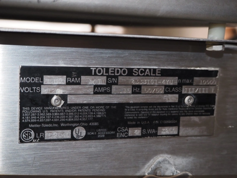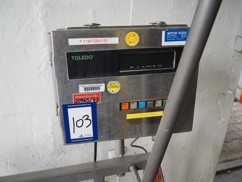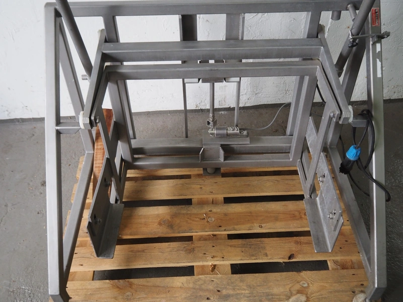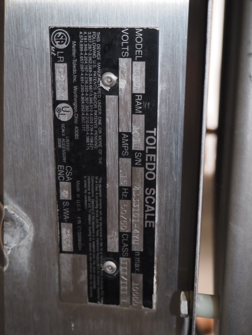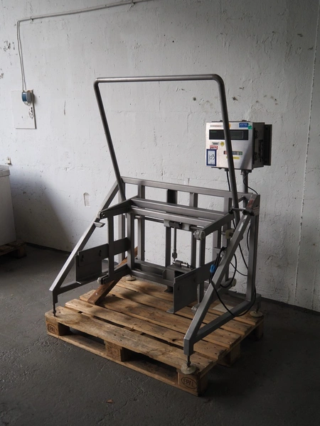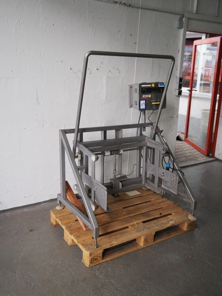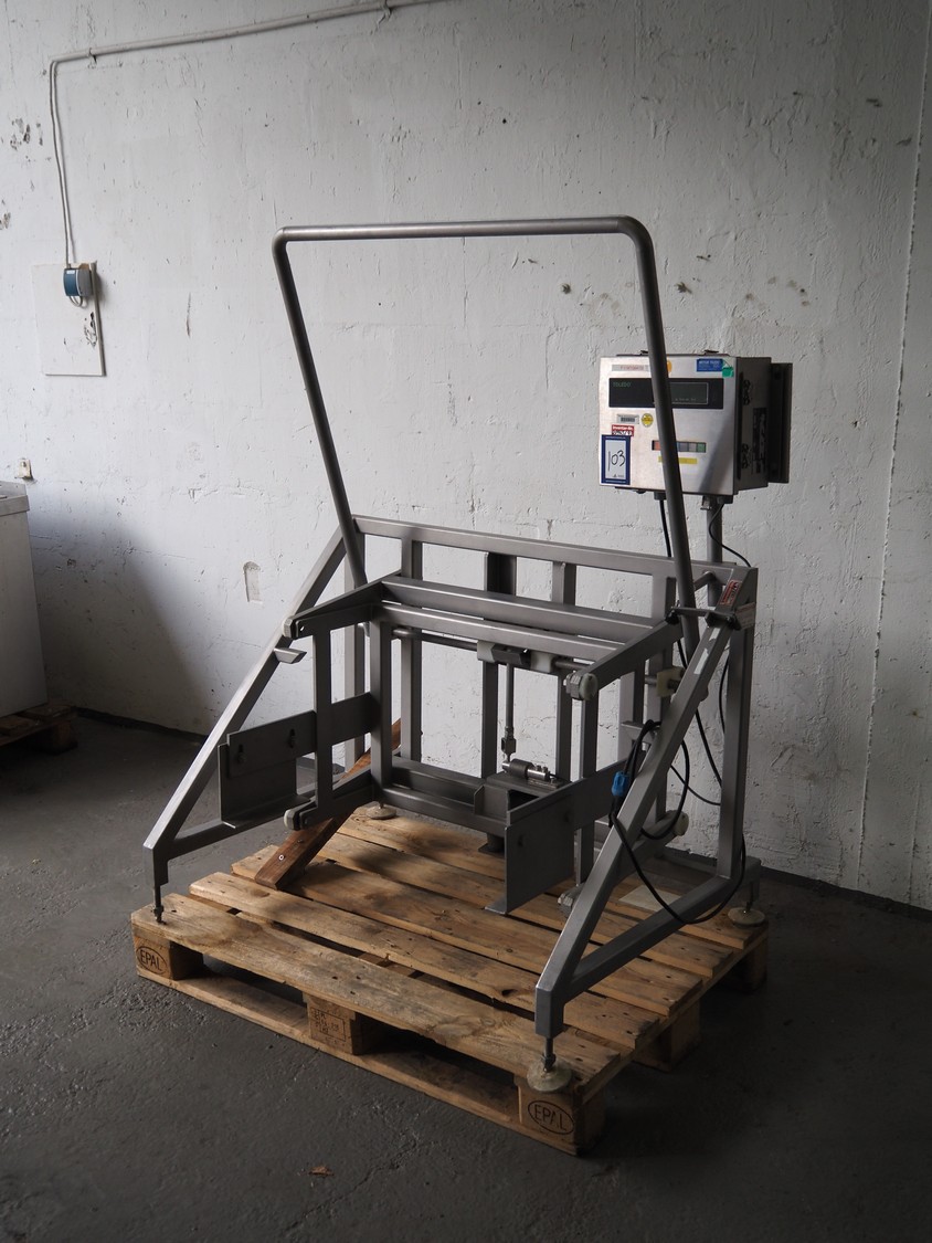 KG Lyften AB weighing device for 200 liter meat bins, type: SKV 200 ESV, number: 7877 with Toledo weighing device, model: 8140, serial number: 4333101-4YU, 120 V, 50/60 Hz, 0.15 A, dimensions: 1150 mm x 840 mm x 1500 mm.