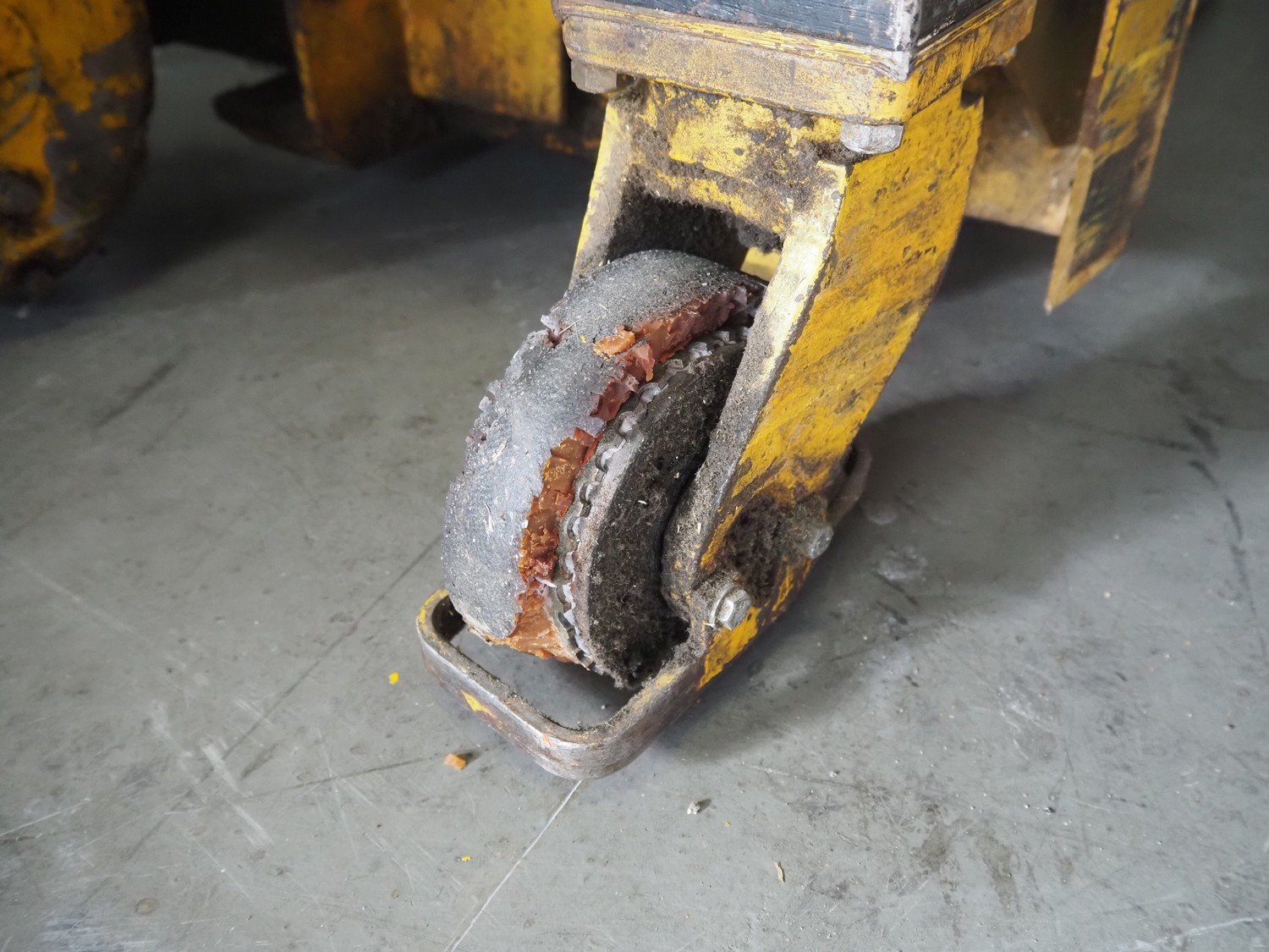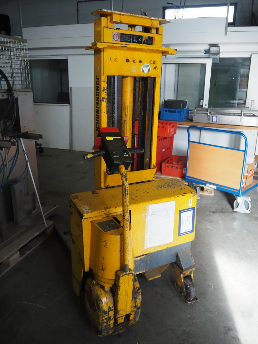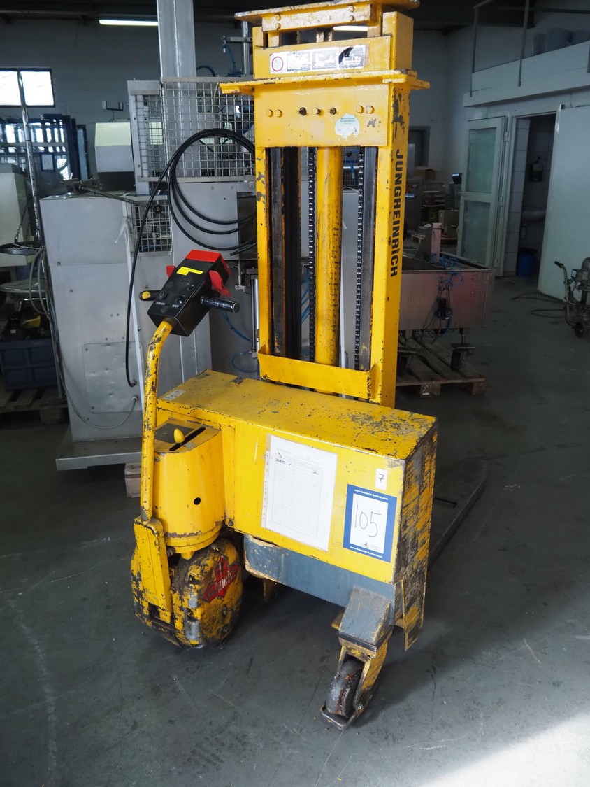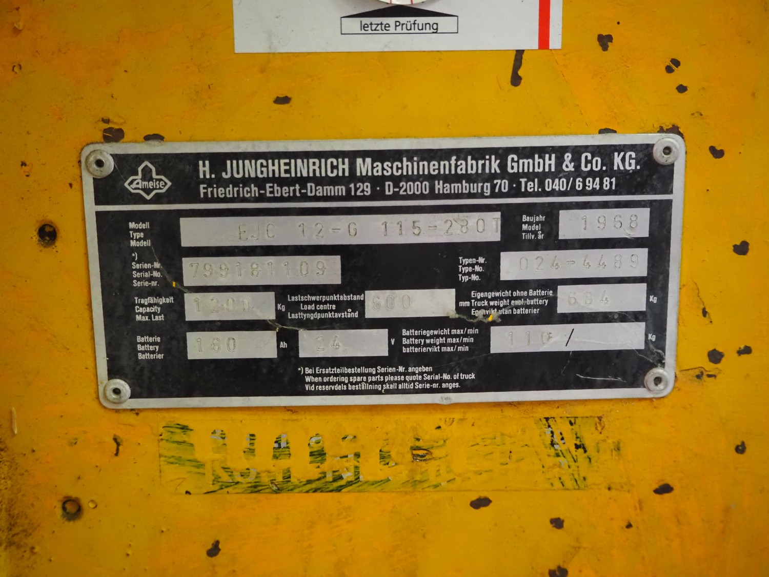 Jungheinrich electrical pallet lifter, model: EJC 12-G 115-280T, type: 024-4489, serial number: 799181109, year of construction: 1968, capacity: 1200 kg, weight without batter: 684 kg, battery weight: 110 kg, 24 V, 160 Ah, fork dimensions: 1150 mm x 180 mm, distance between forks: 195 mm, total dimensions: 1900 mm x 850 mm x 1900 mm. Not in working condition.