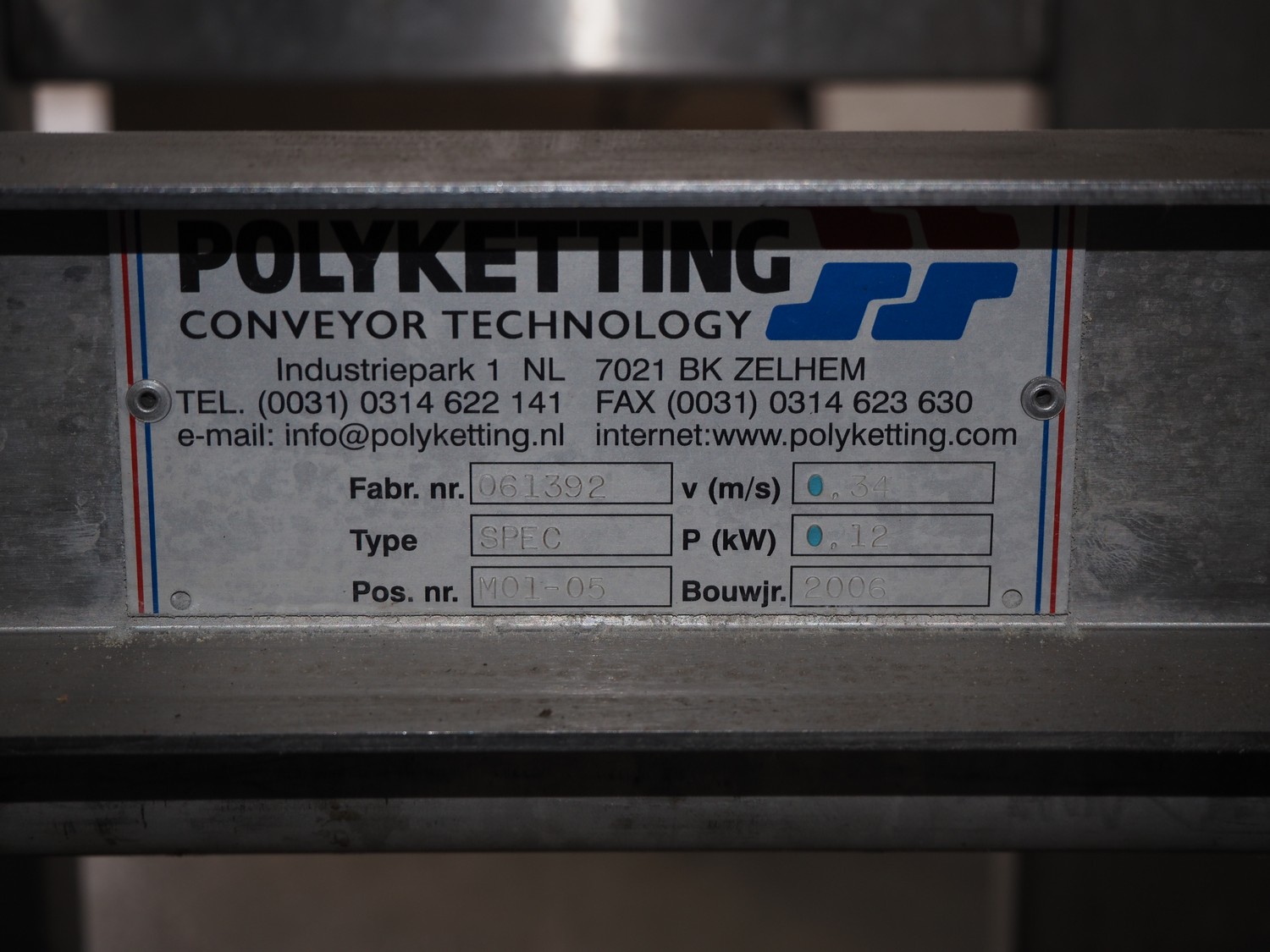 Polyketting Conveyor Technology elevating belt, type: SPEC, number: 061392, year of construction: 2006, 0.12 kW, elevating from 630 mm to 1200 mm, total dimensions: 1000 mm x 500 mm x 1480 mm.
