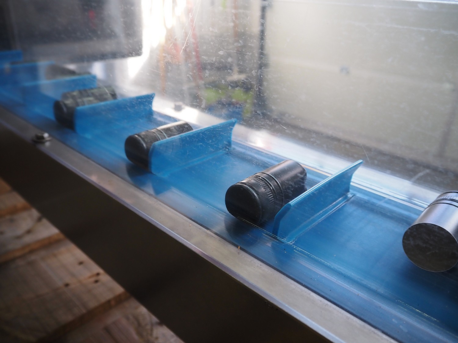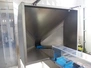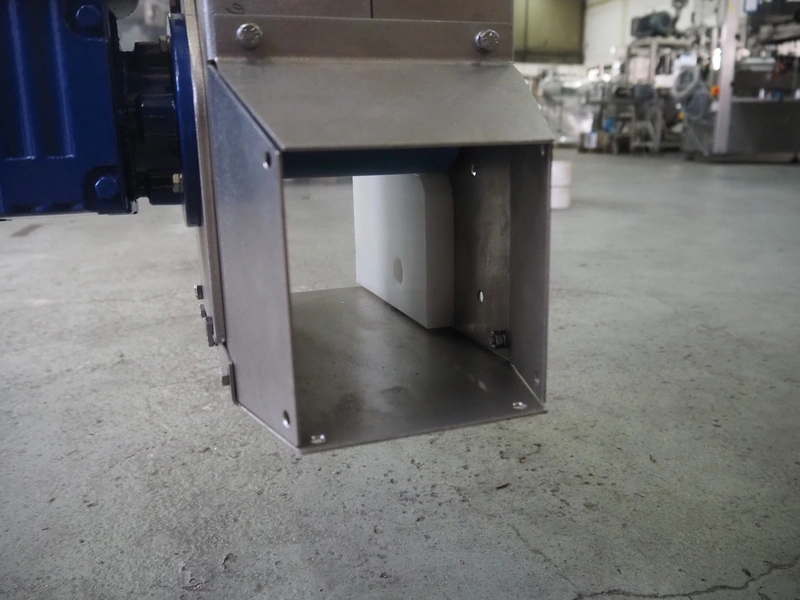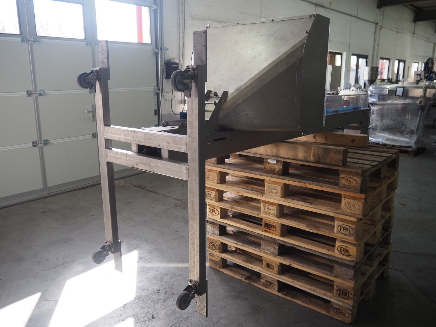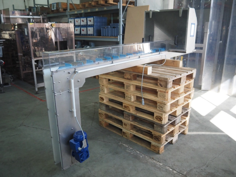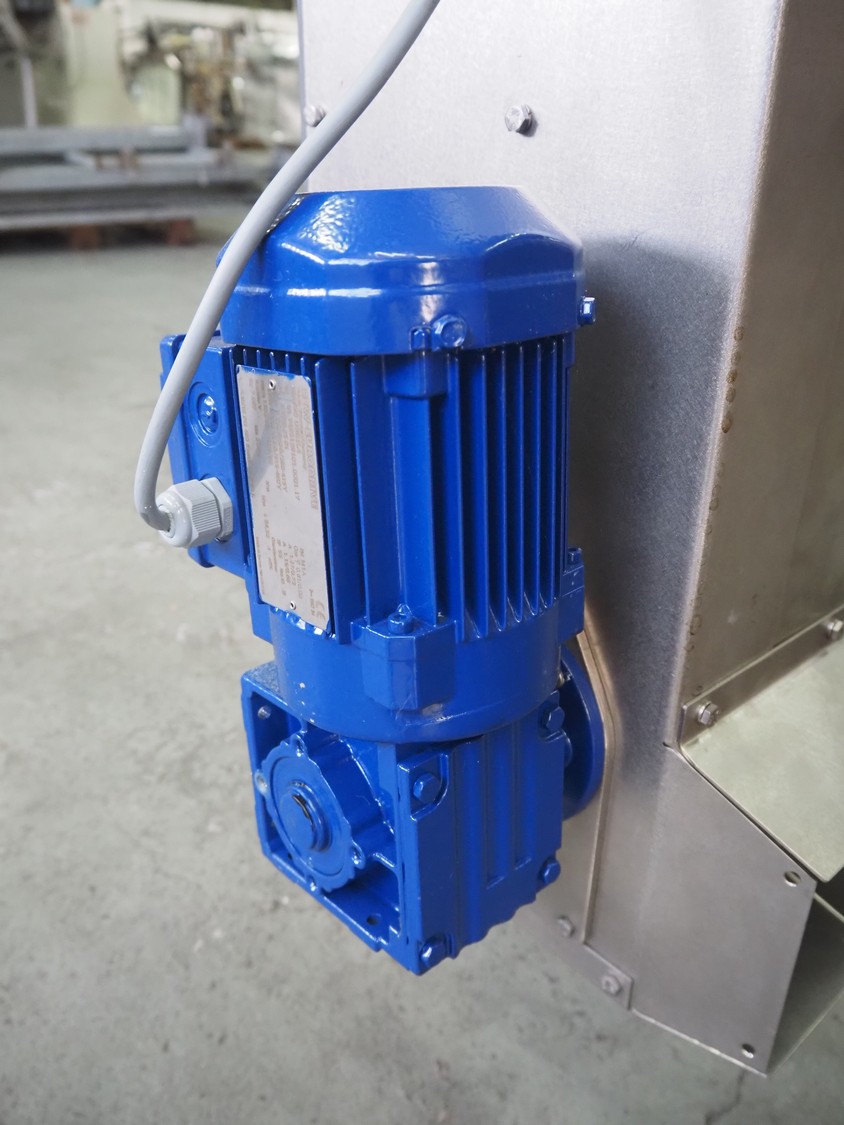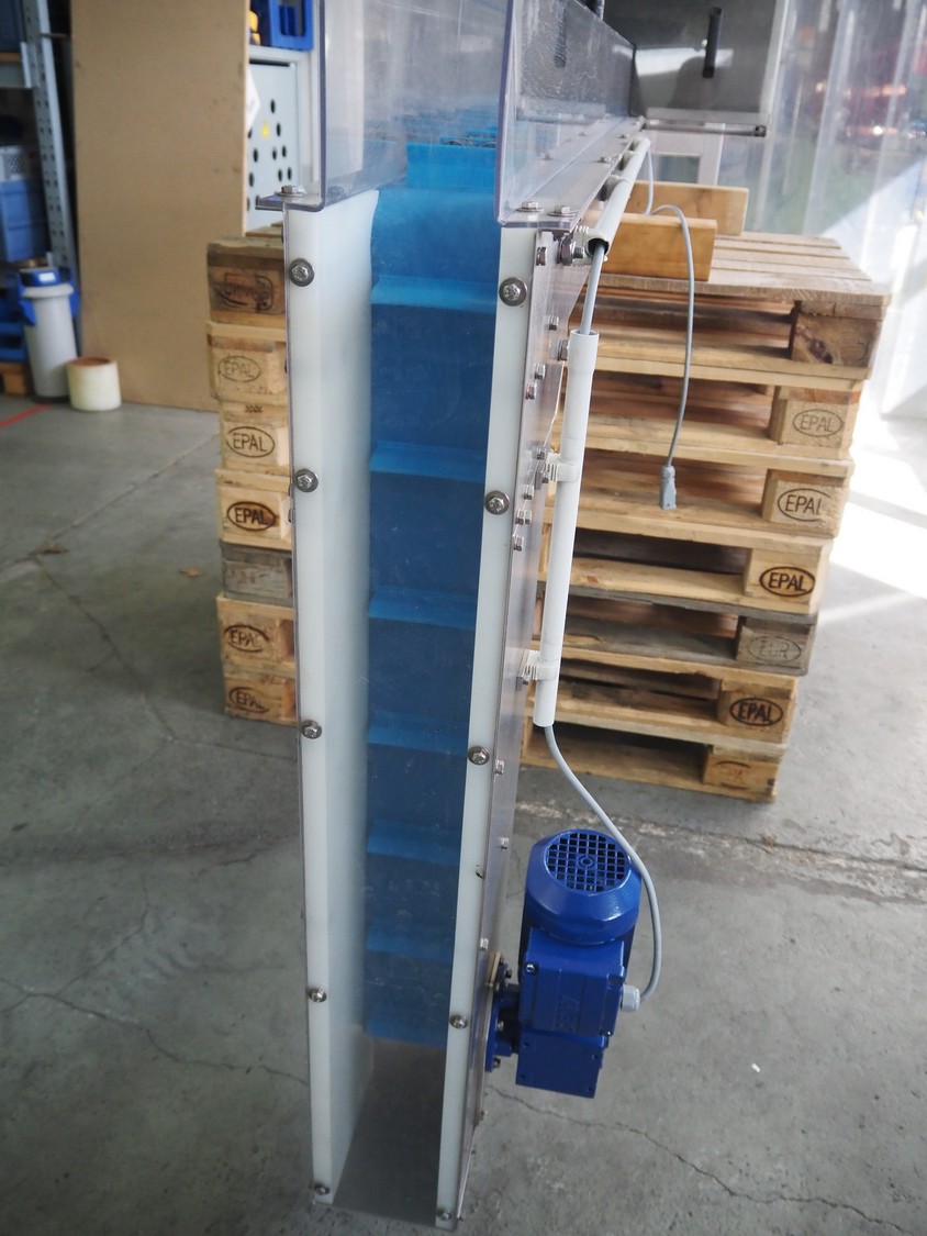 Mobile s/s elevating belt, with infeed funnel, plastic belt with dividers, belt width: 100 mm, distance between dividers: 140 mm, divider height: 30 mm, elevating height: 2850 mm, total dimensions: 3150 mm x 760 mm x 1850 mm.