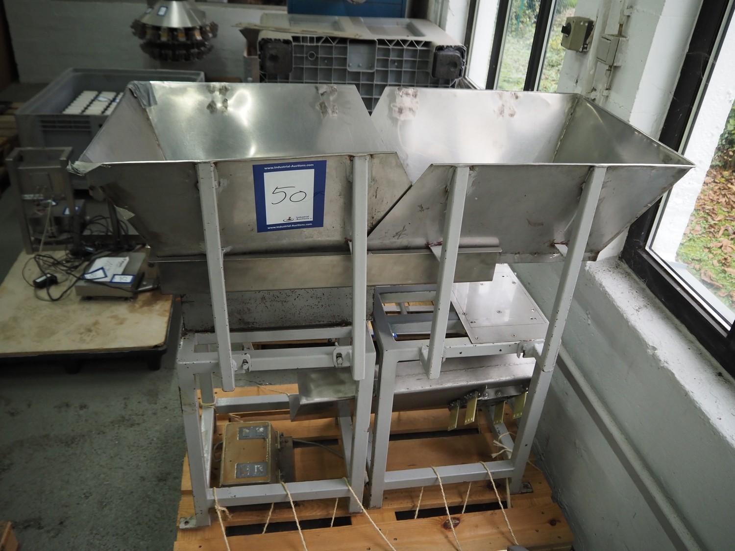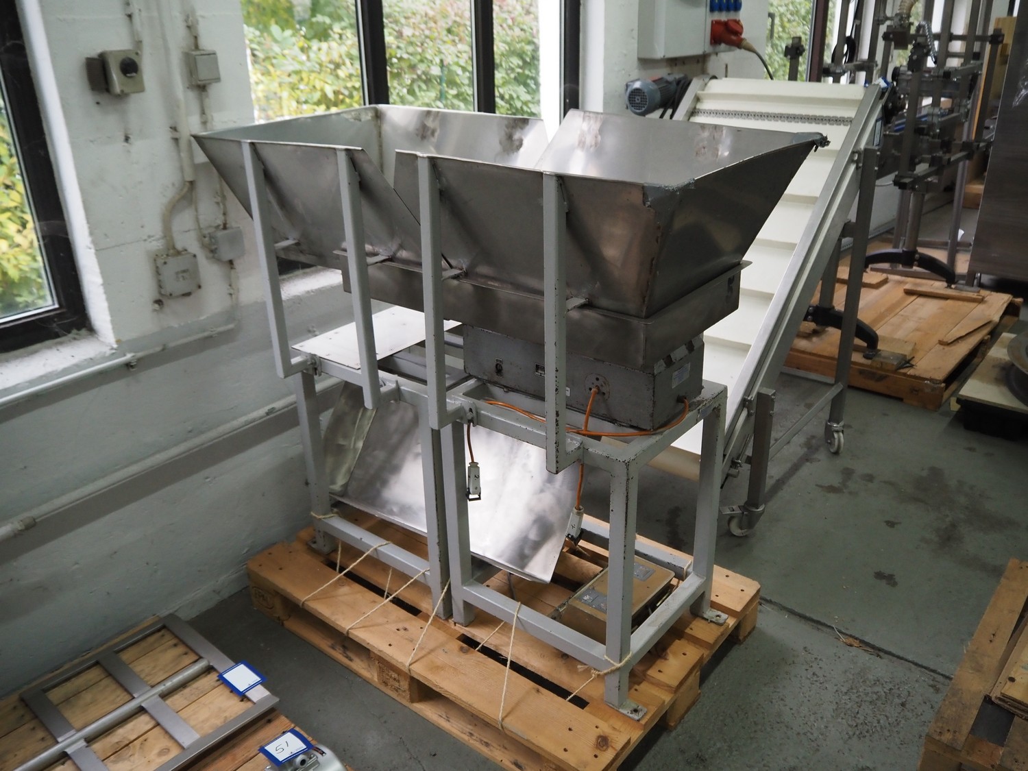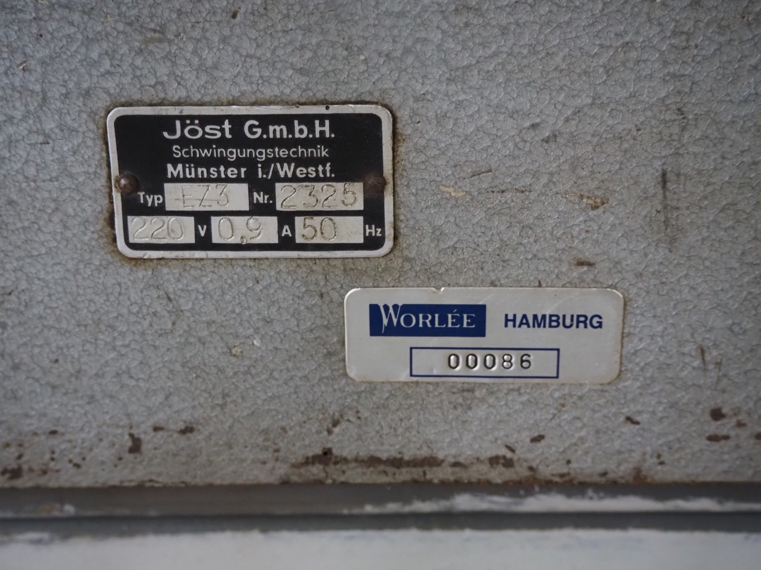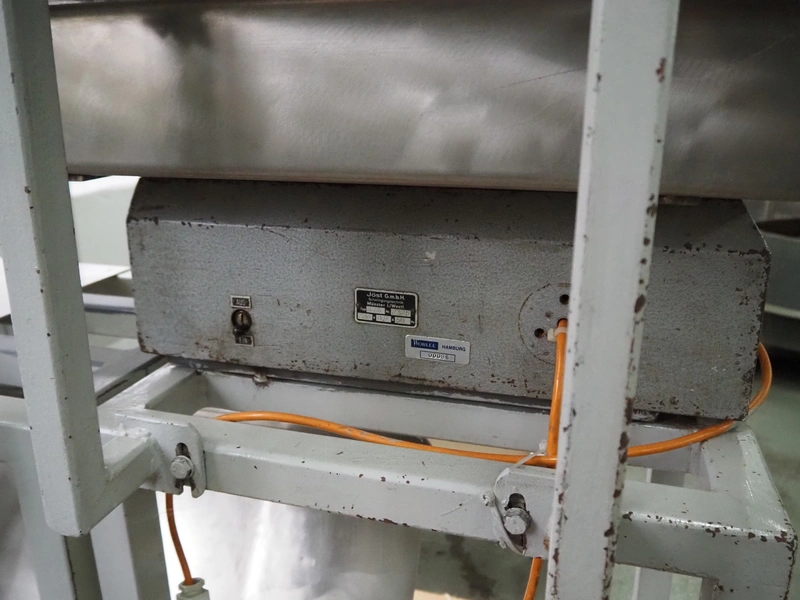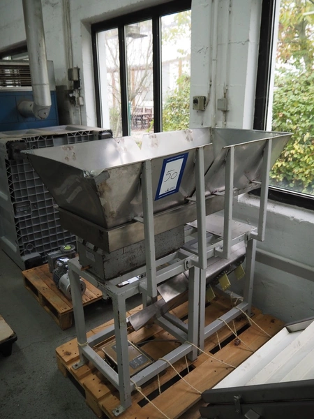 2 Jost vibrating gutters, type: EZ3, number: 2325, 220 V, 50 Hz, 0.9 A, gutter width: 400 mm, total dimensions: (2x) 850 mm x 640 mm x 1180 mm.