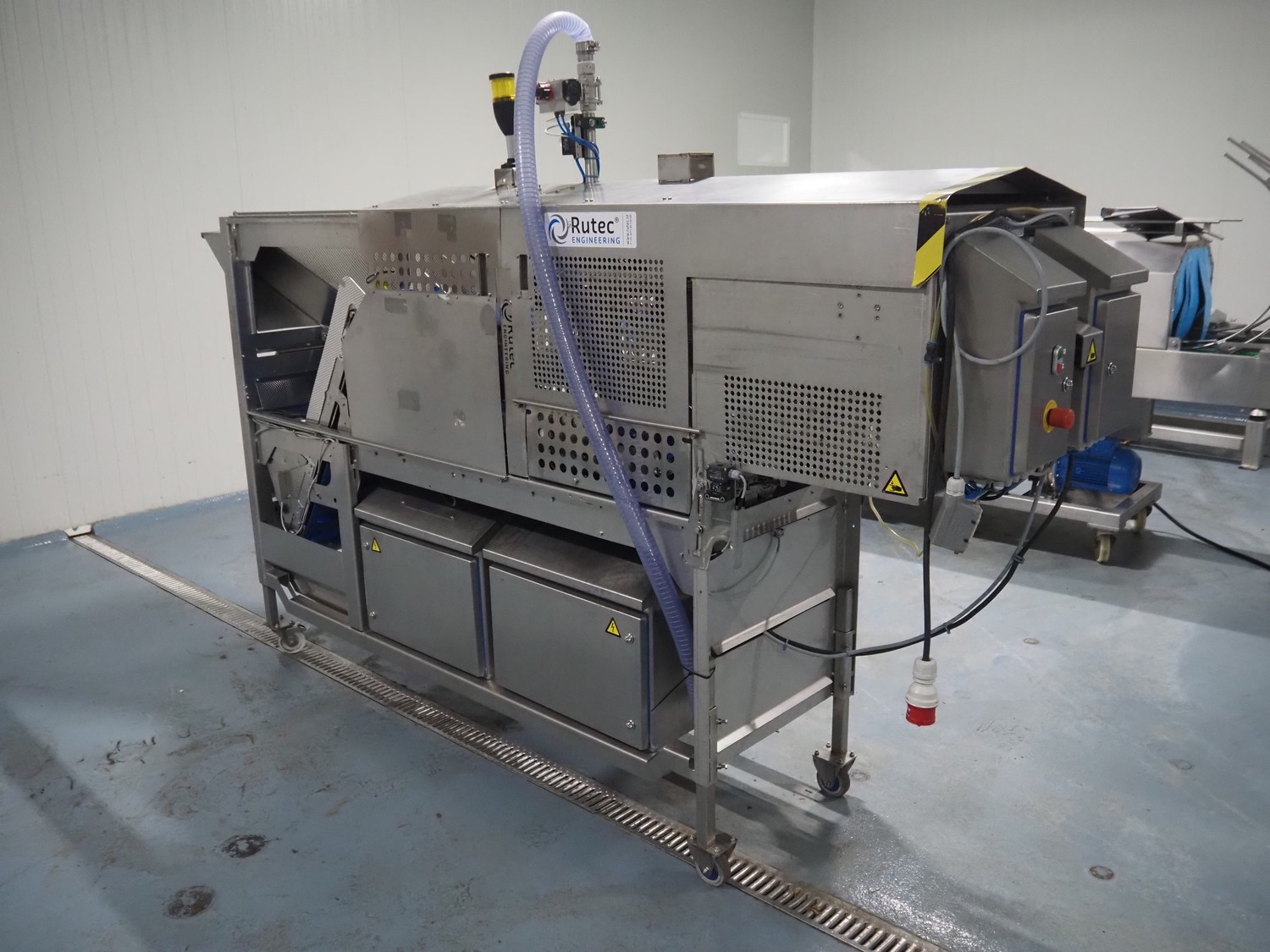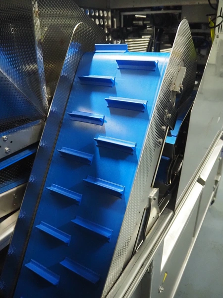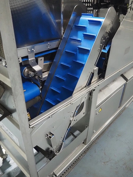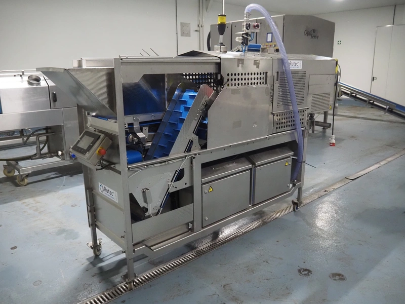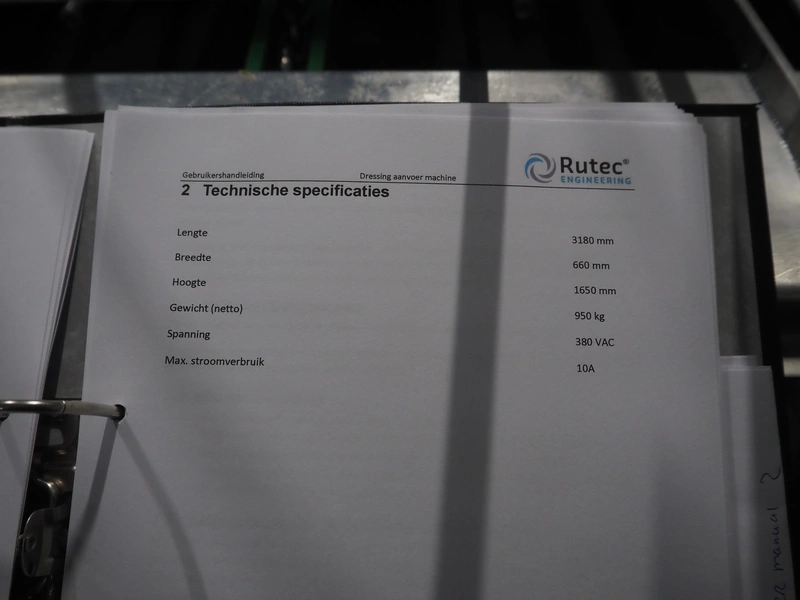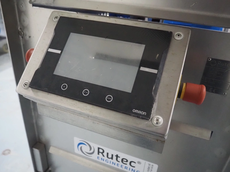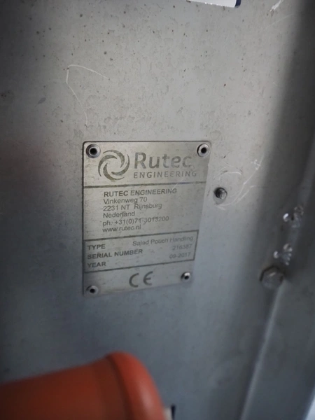 Rutec Engineering mobile feeding system, type: Salad Pouch Handling, serial number: 216387, year of construction: 09-2017, 380 Vac, 10 A, 950 kg, belt width: 250 mm, total dimensions: 3150 mm x 700 mm x 2000 mm.