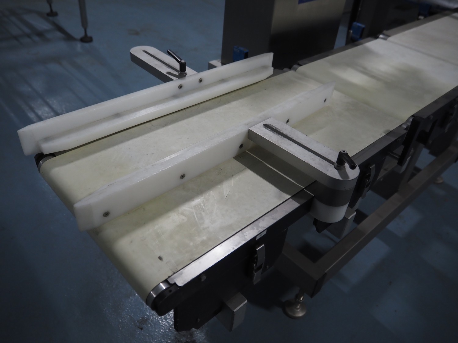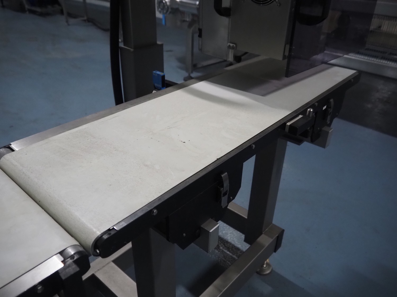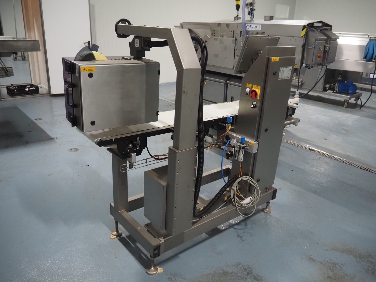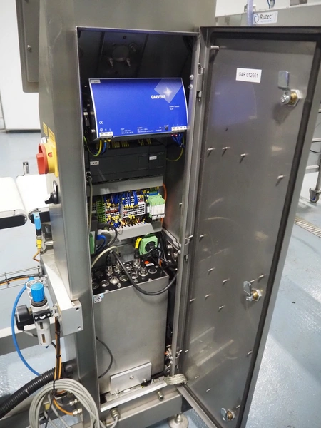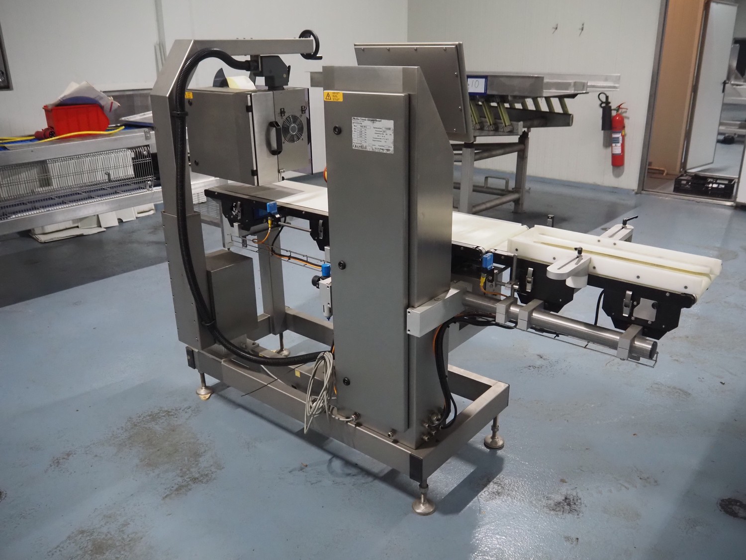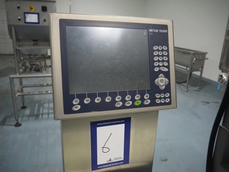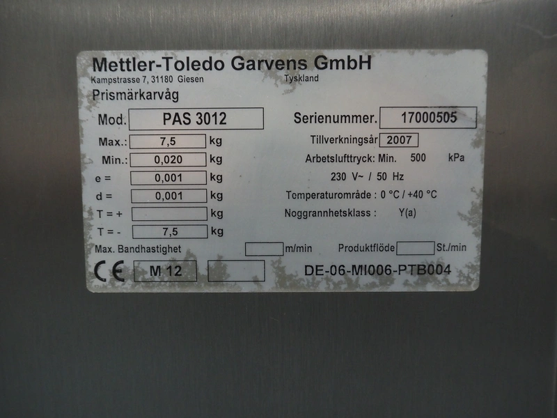 Mettler-Toledo Garvens GmbH checkweigher with labeller, type checkweigher: PAS 3012, serial number: 17000505, year of construction: 2007, 230 V, 50 Hz, maximum: 7.5 kg, minimum: 0.020 kg, e=: 0.001 kg, d=: 0.001 kg, T=-: 7.5 kg, plastic belt, belt width: (3x) 300 mm, total dimensions: 2250 mm x 850 mm x 730 mm.