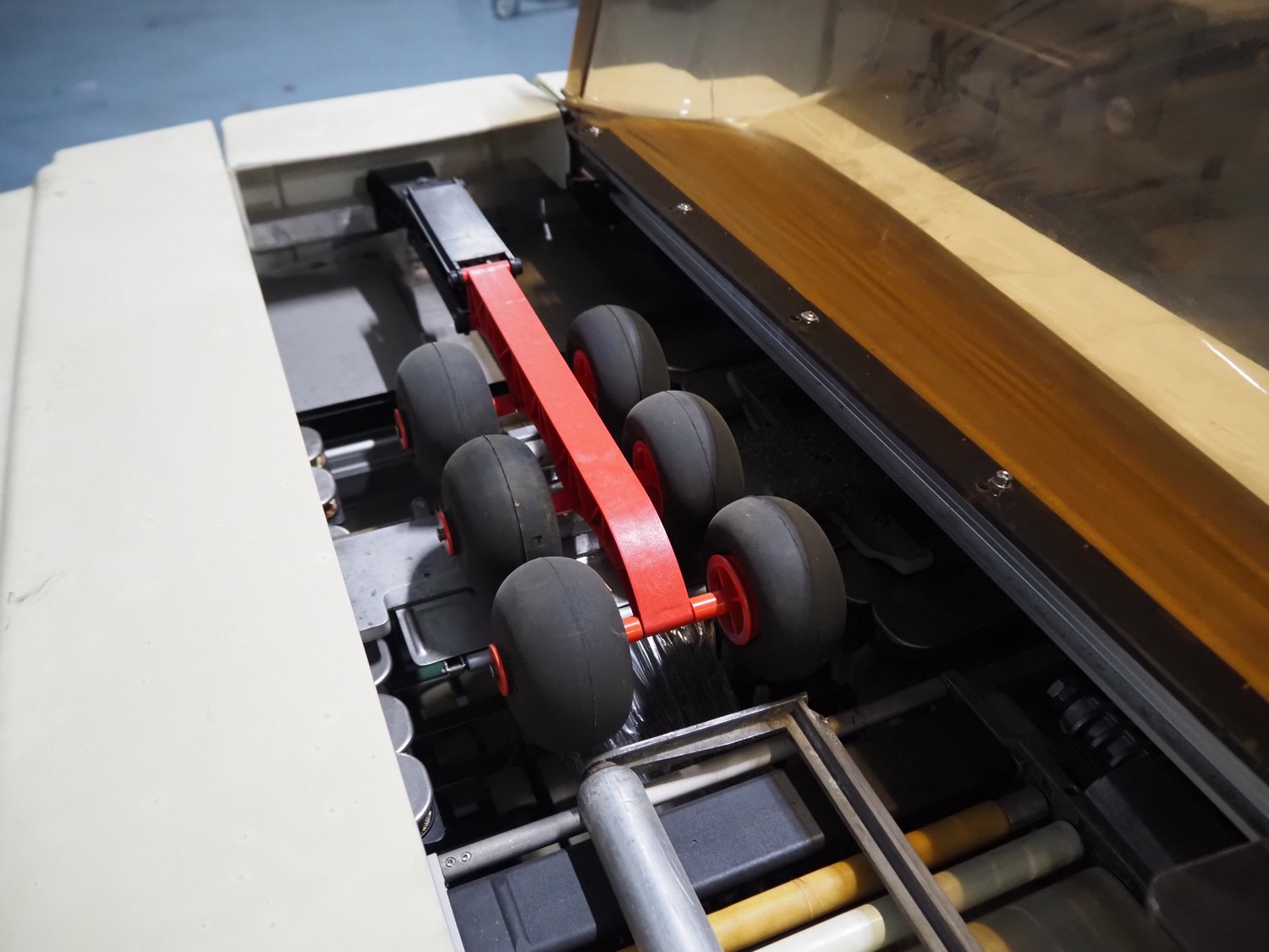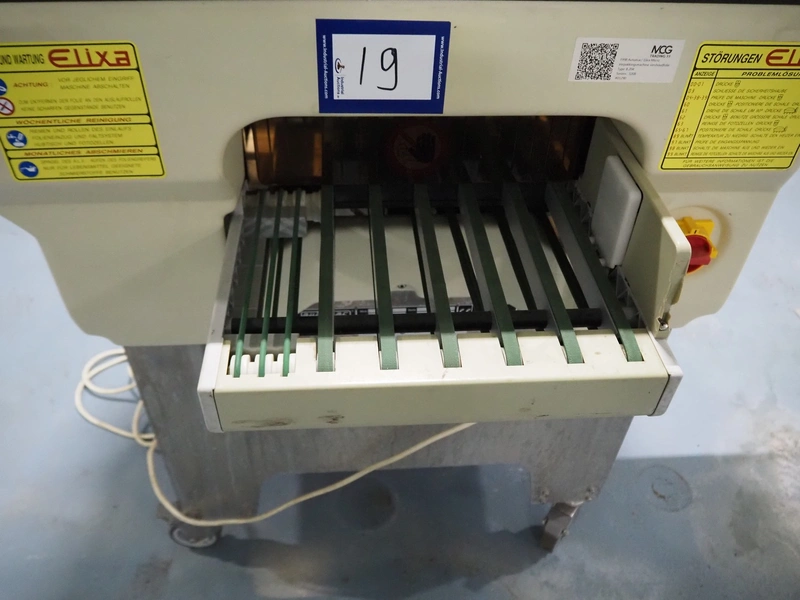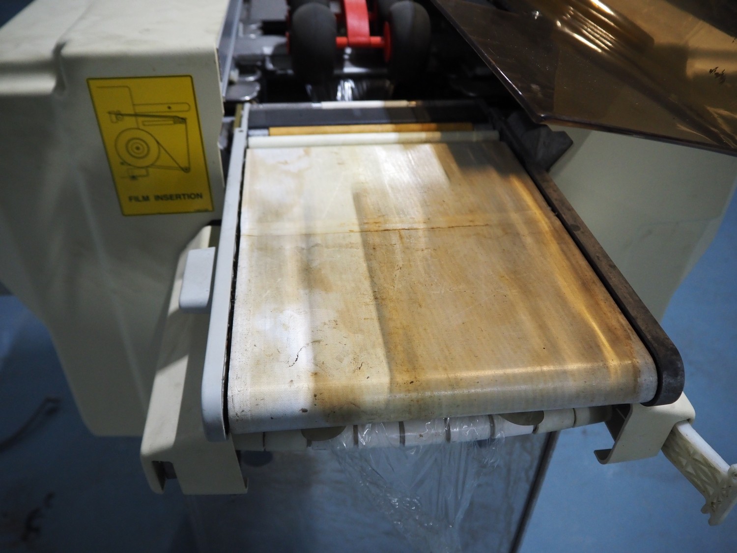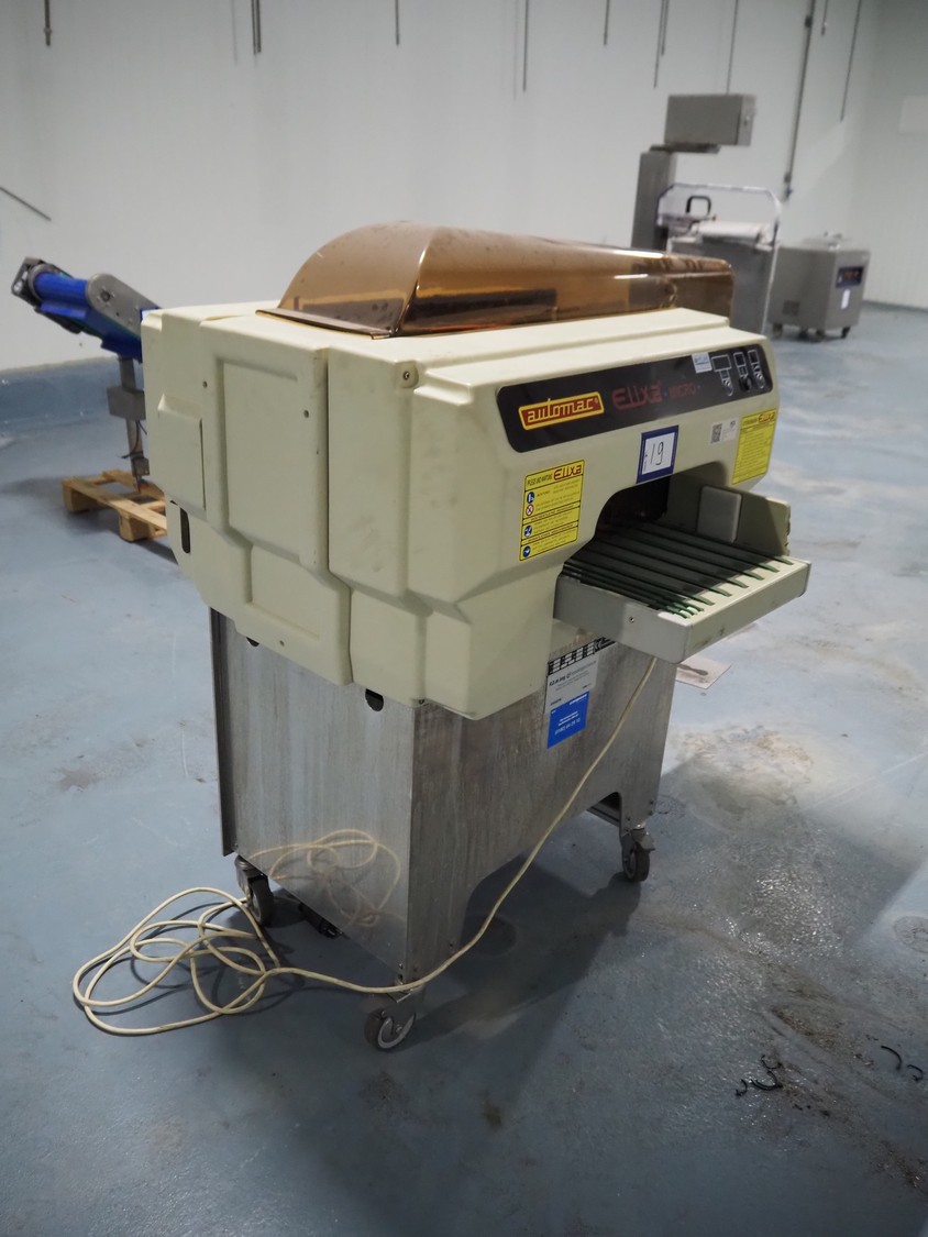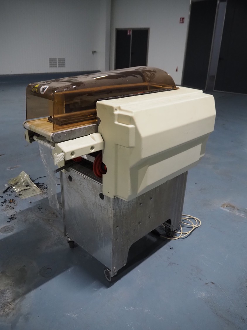 Automac S.P.A. mobile packaging machine, model: B.204, number: 3208, year of construction: 1998, 230 V, 2 Ph, 50 Hz, 1.95 kW, weight: 150 kg, string infeed belt, belt width: 330 mm, plastic outfeed belt, total dimensions: 1150 mm x 1050 mm x 1350 mm.