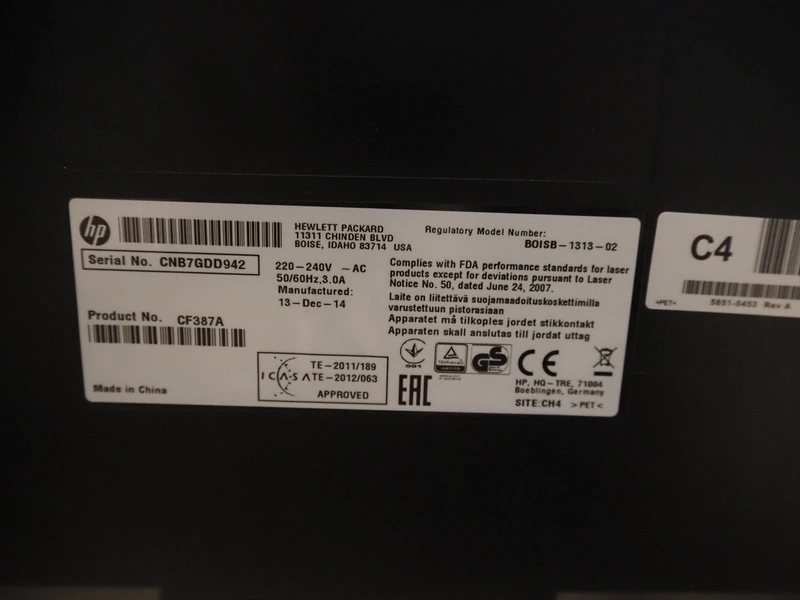 HP printer, model: BOISB-1313-02, serial number: CNB7GDD942, year of construction: 13-December-2014, 220-240 V, 50/60 Hz, 3.0 A, dimensions: 450 mm x 400 mm x 500 mm.
