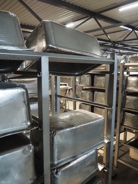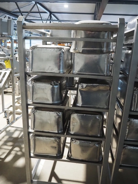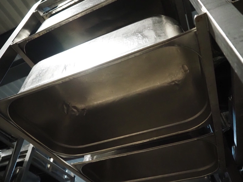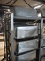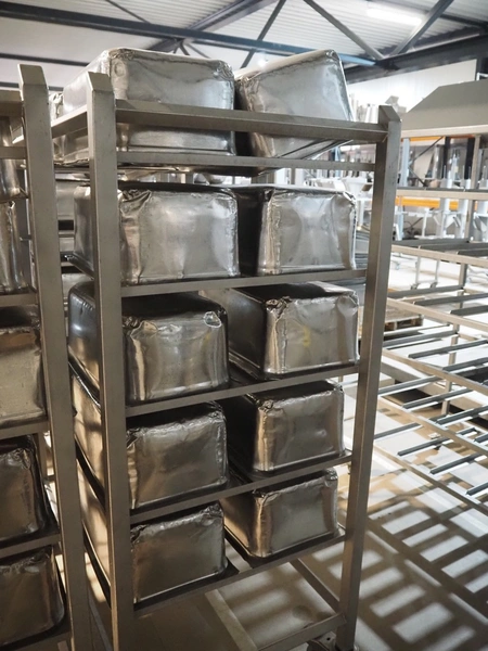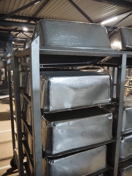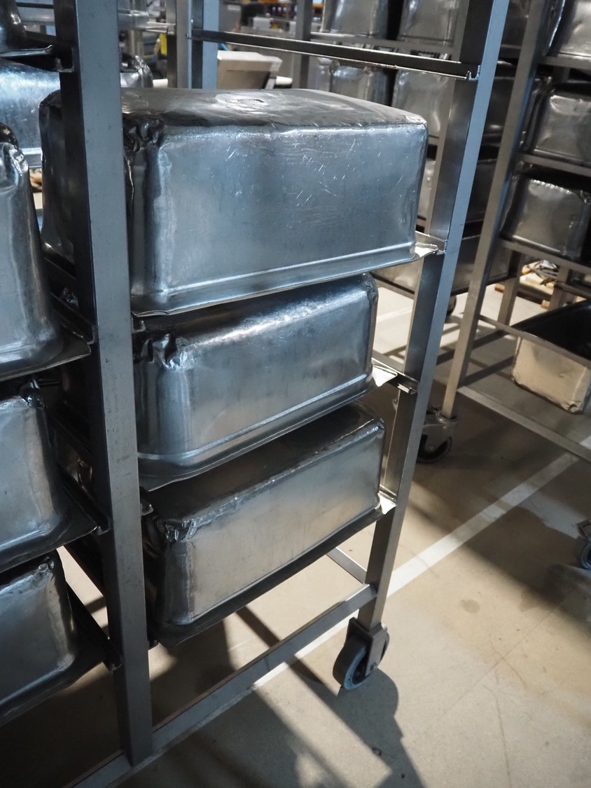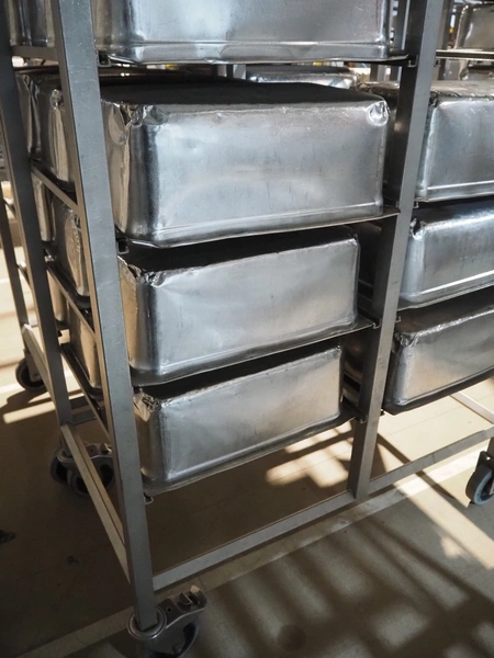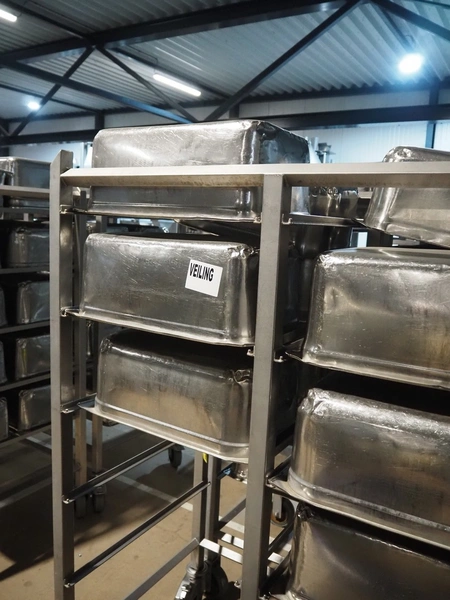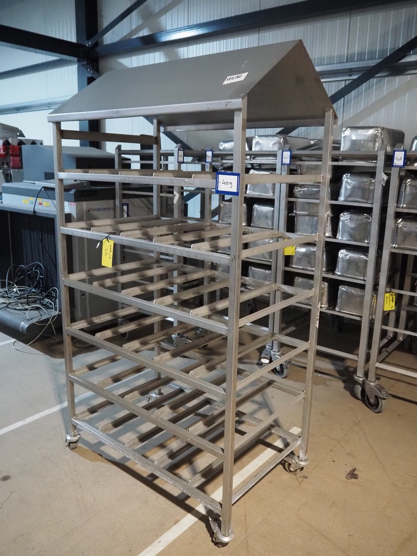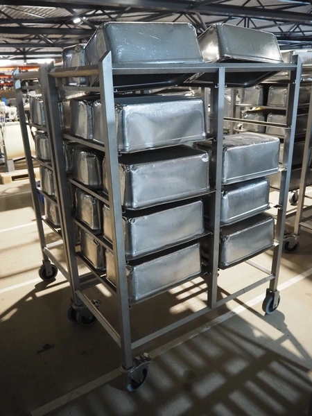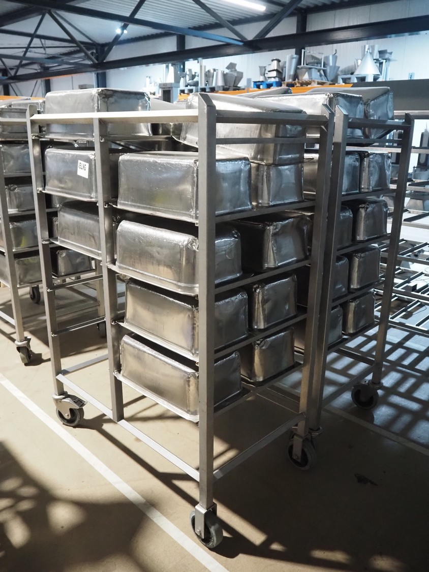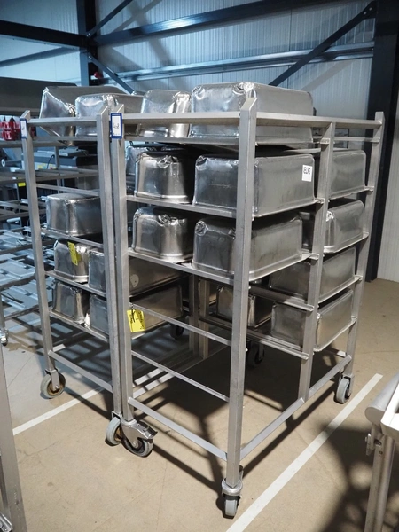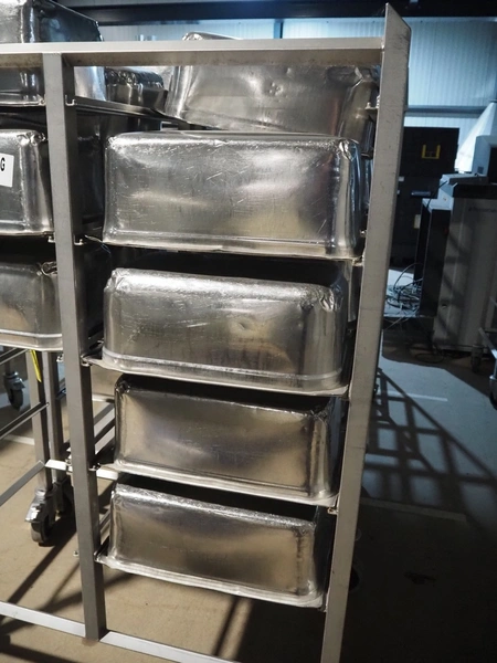 2 s/s trolleys, 2x 5 floors, dimensions each floor: 700 mm x 540 mm, total dimensions: (2x) 1210 mm x 700 mm x 1710 mm. Including large amount of s/s 1/1 gastronorm bins.
