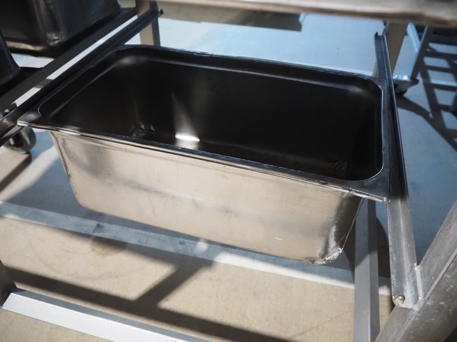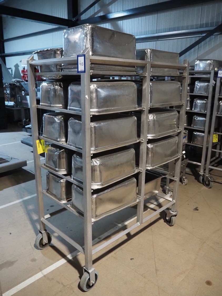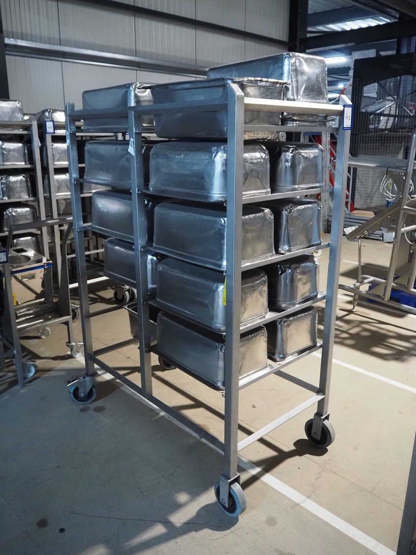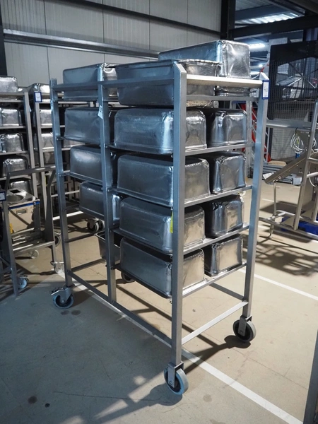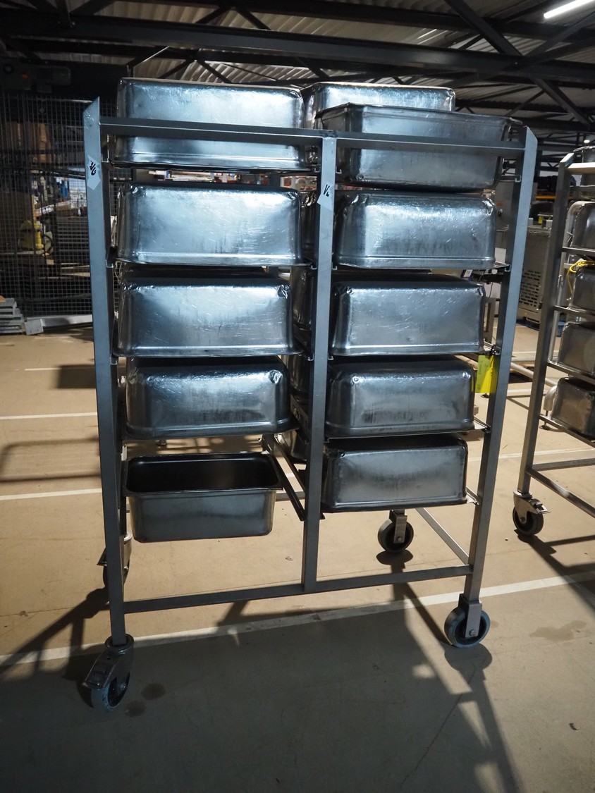 S/s trolley, 2x 5 floors, dimensions each floor: 700 mm x 540 mm, total dimensions: 1210 mm x 700 mm x 1710 mm. Including large amount of s/s 1/1 gastronorm bins.