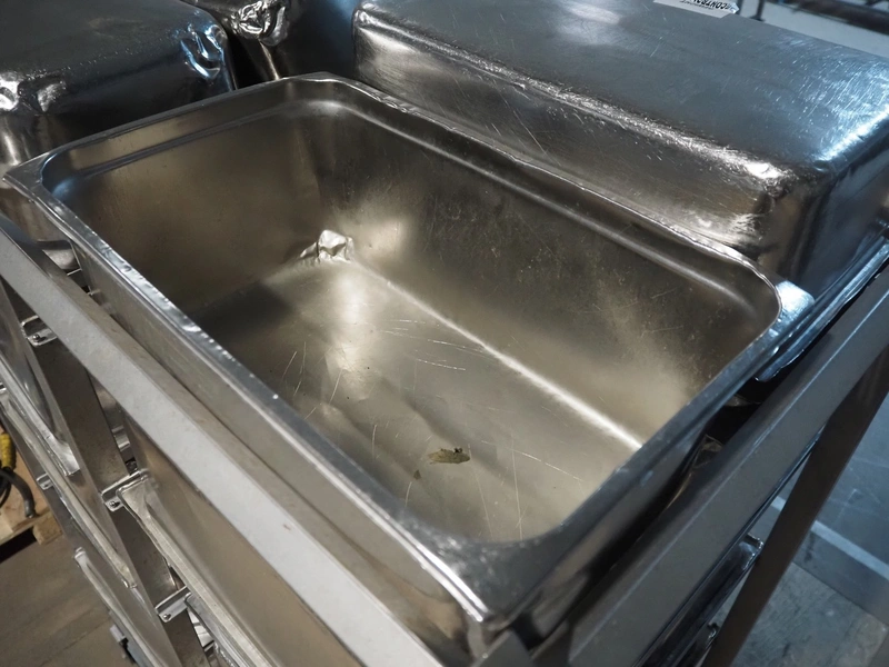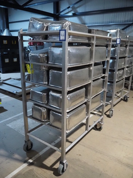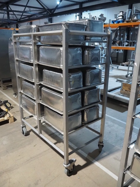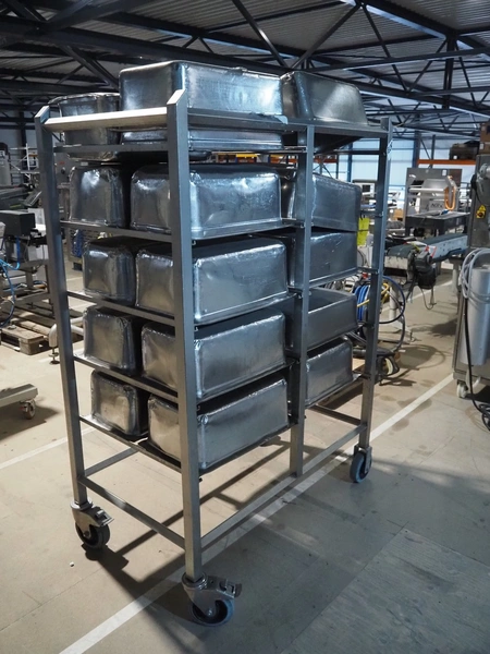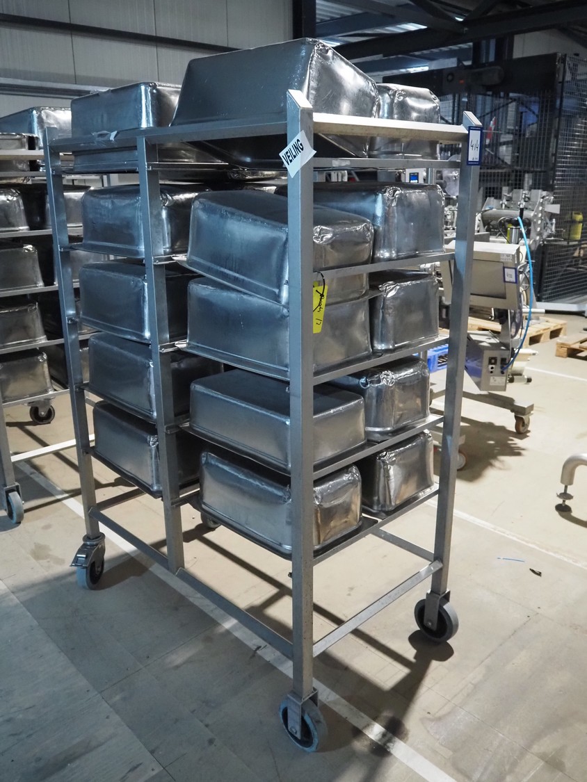 S/s trolley, 2x 5 floors, dimensions each floor: 700 mm x 540 mm, total dimensions: 1210 mm x 700 mm x 1710 mm. Including large amount of s/s 1/1 gastronorm bins.