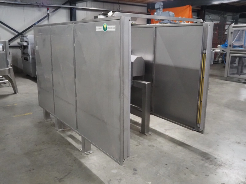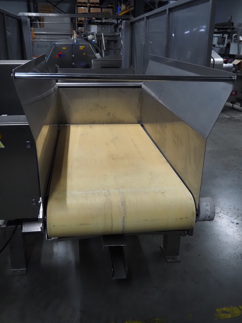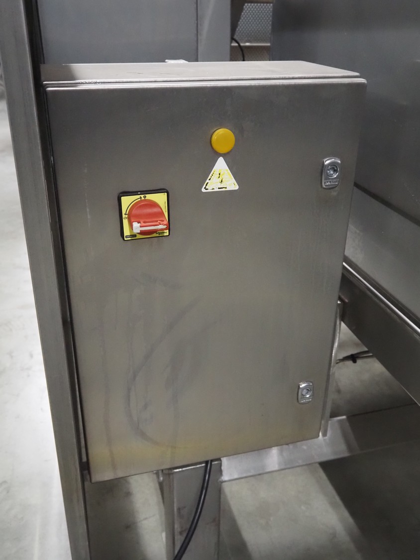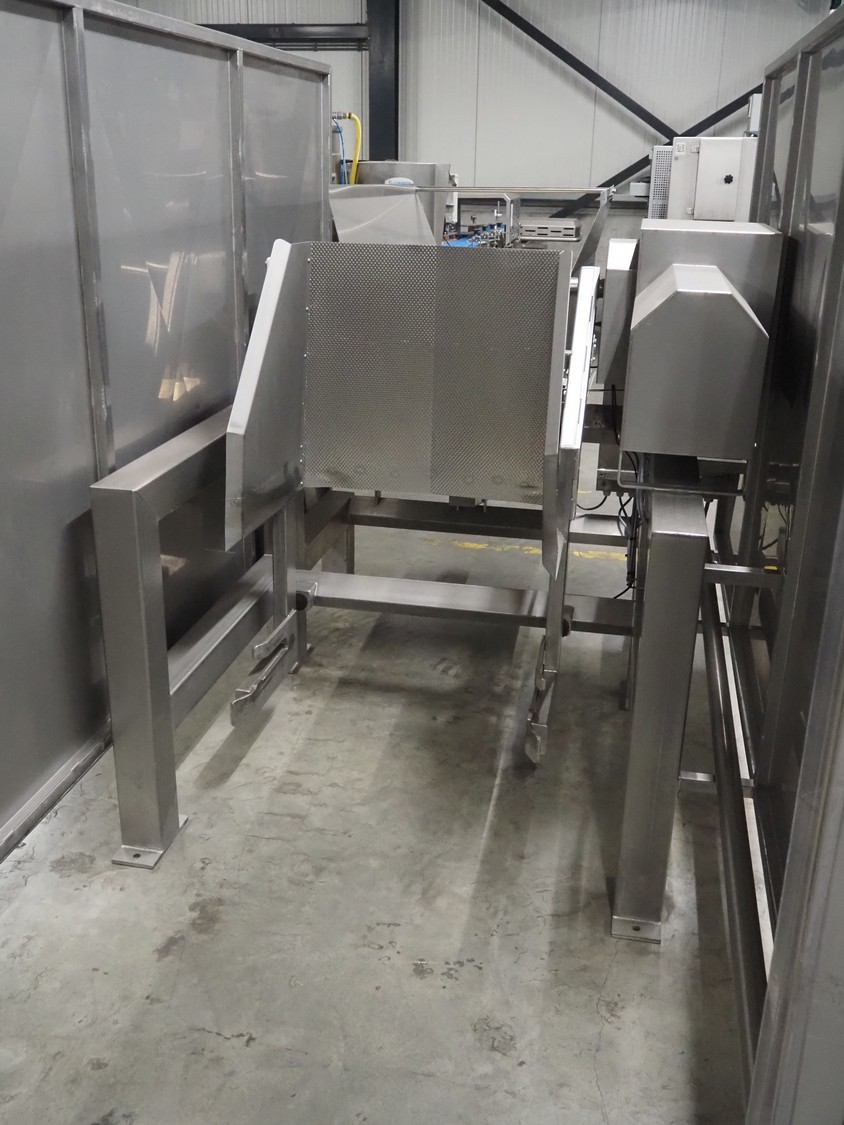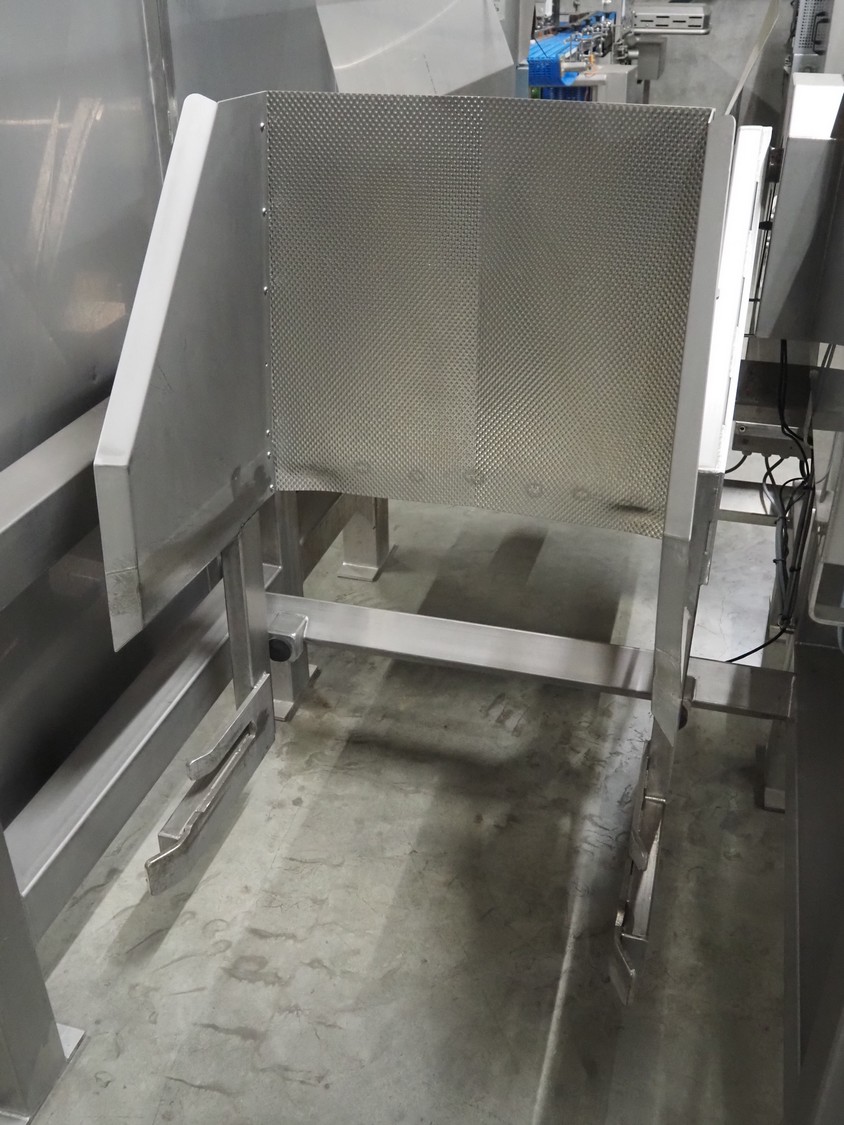 SAS DISPAC tilting device for 200 liter meat bins with outfeed belt, type: VIDEP, serial number: 08V26, year of construction: 06/08, plastic belt, belt width: 600 mm, total dimensions: 3400 mm x 1580 mm x 1810 mm.