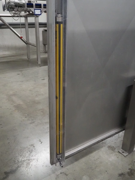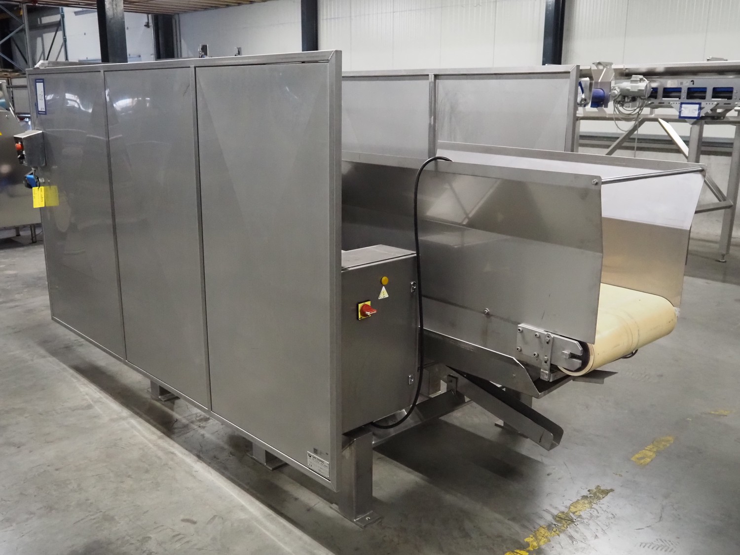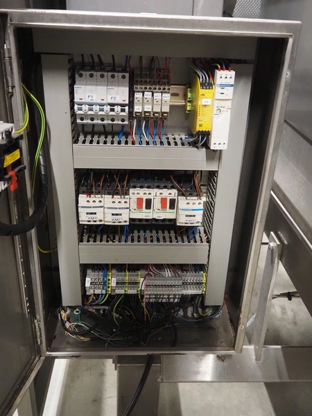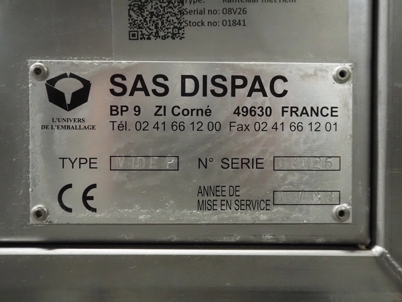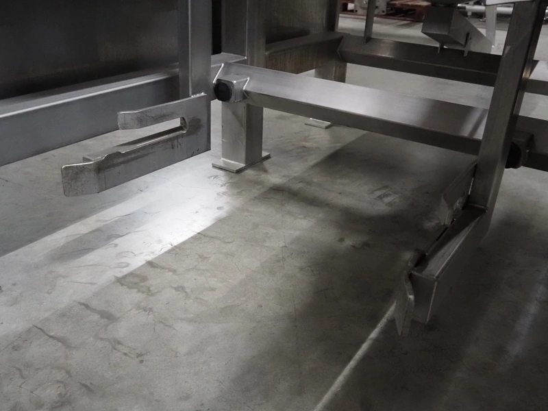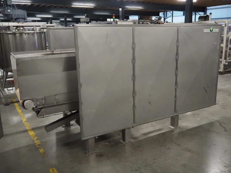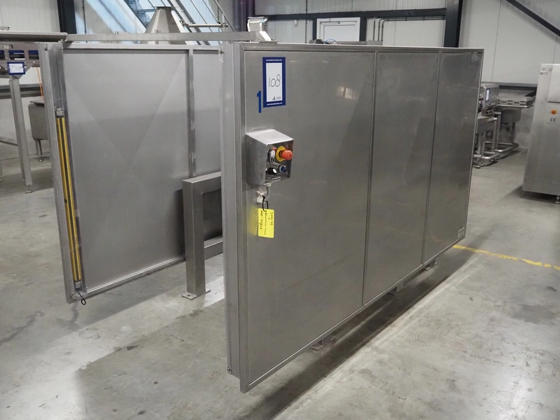 SAS DISPAC tilting device for 200 liter meat bins with outfeed belt, type: VIDEP, serial number: 08V26, year of construction: 06/08, plastic belt, belt width: 600 mm, total dimensions: 3400 mm x 1580 mm x 1810 mm.