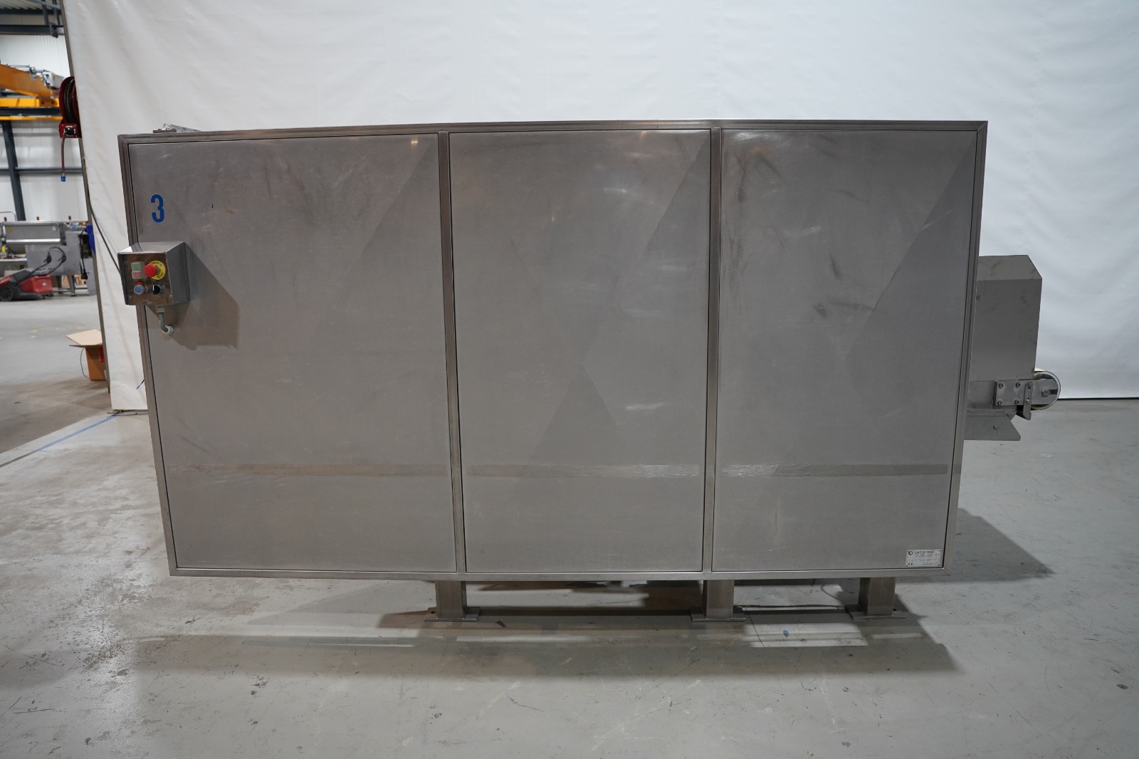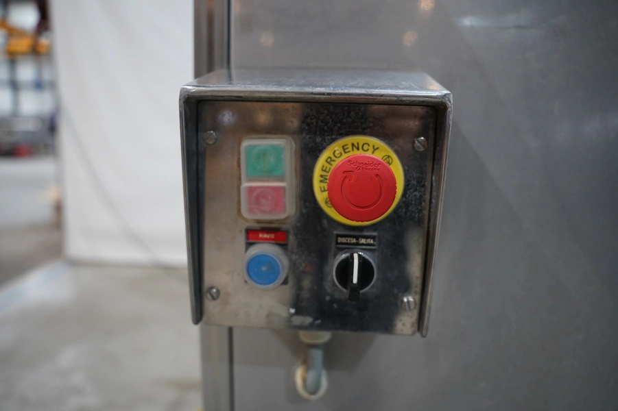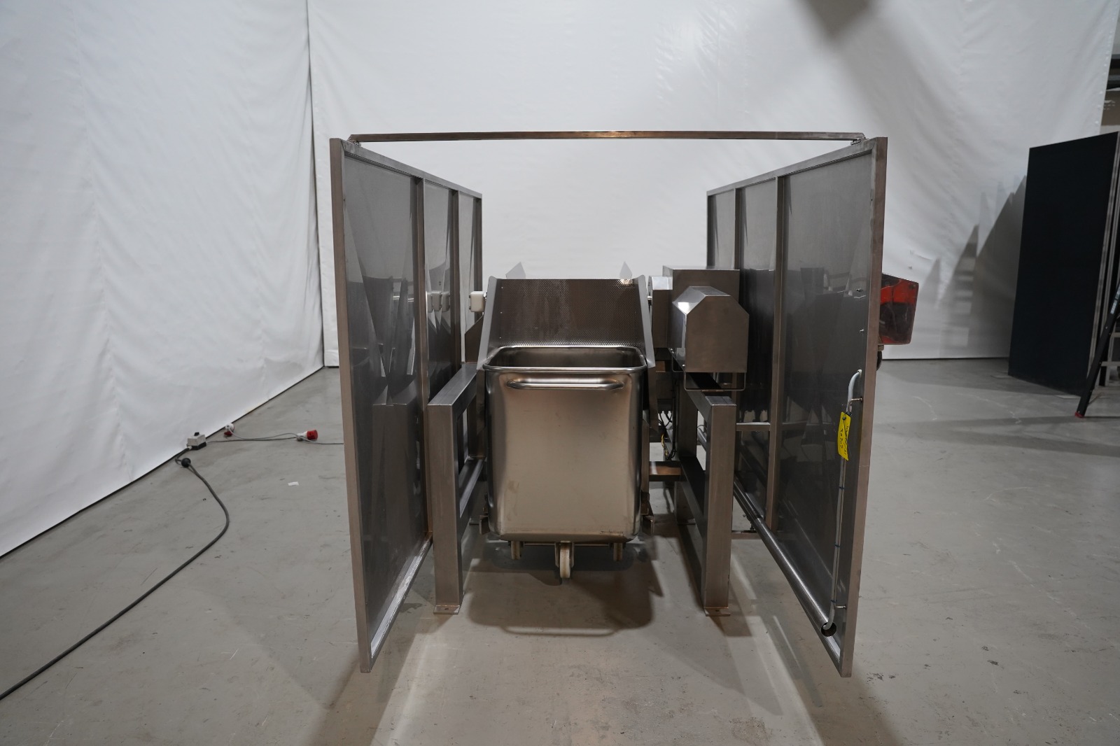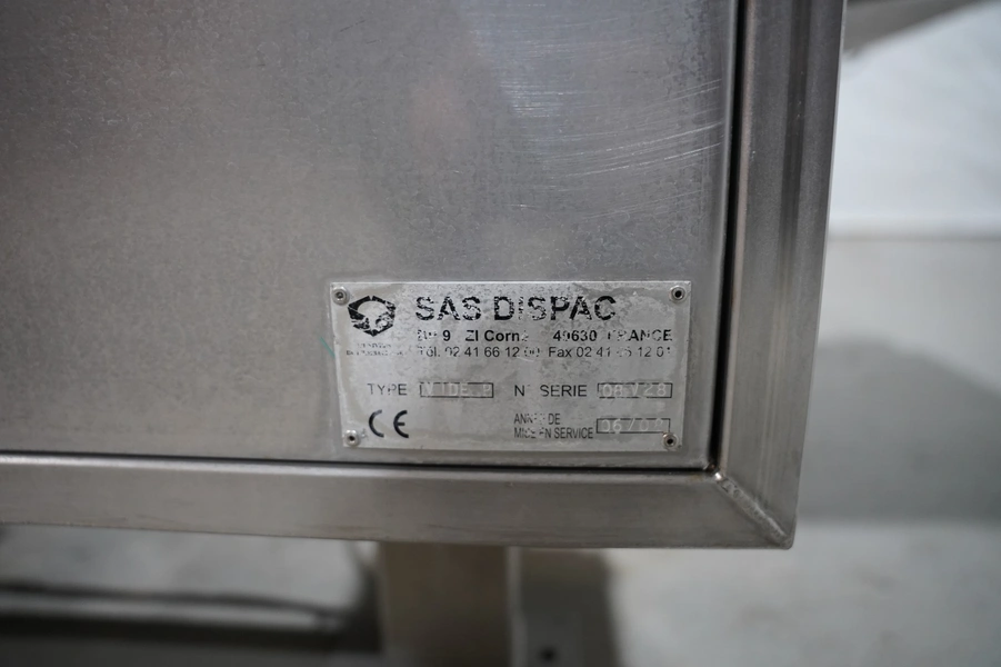 SAS DISPAC tilting device for 200 liter meat bins with outfeed belt, type: VIDEP, serial number: 08V28, year of construction: 06/08, plastic belt, belt width: 600 mm, total dimensions: 3400 mm x 1580 mm x 1810 mm.