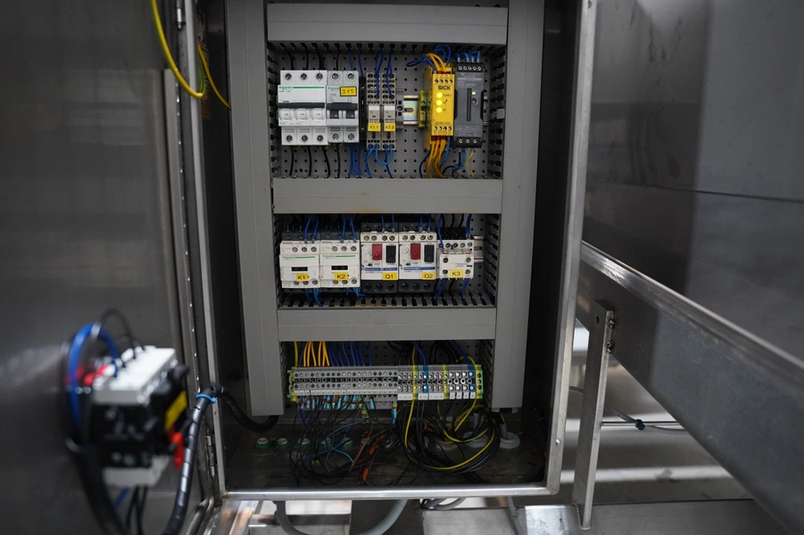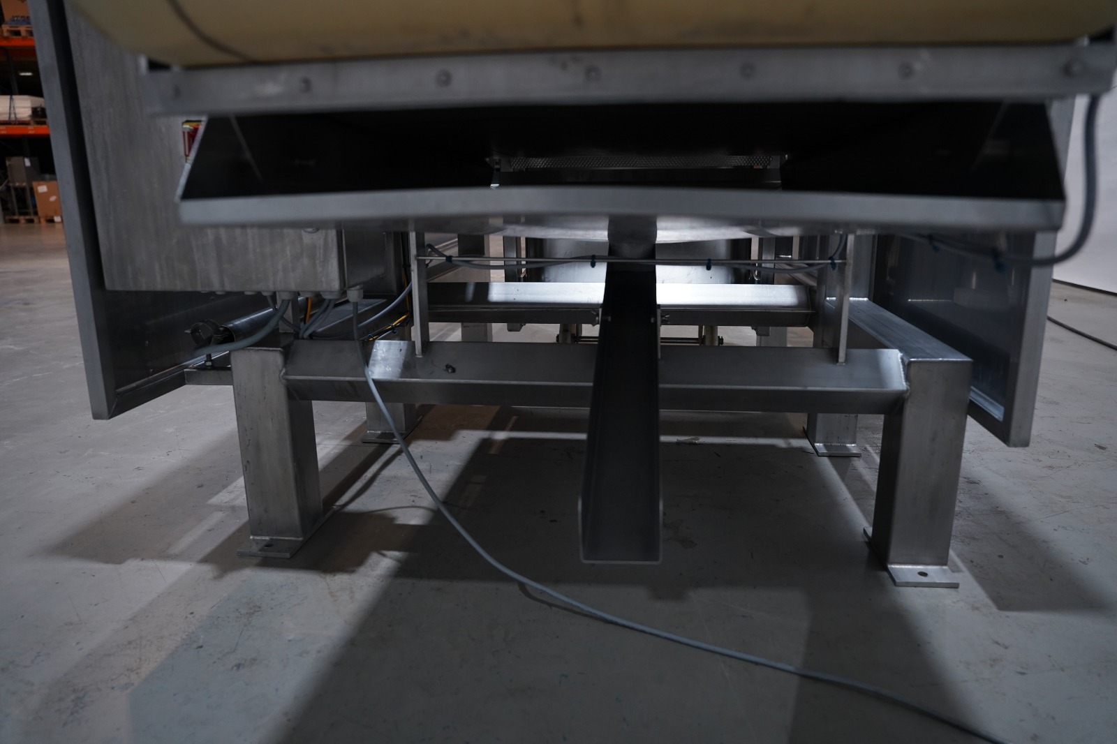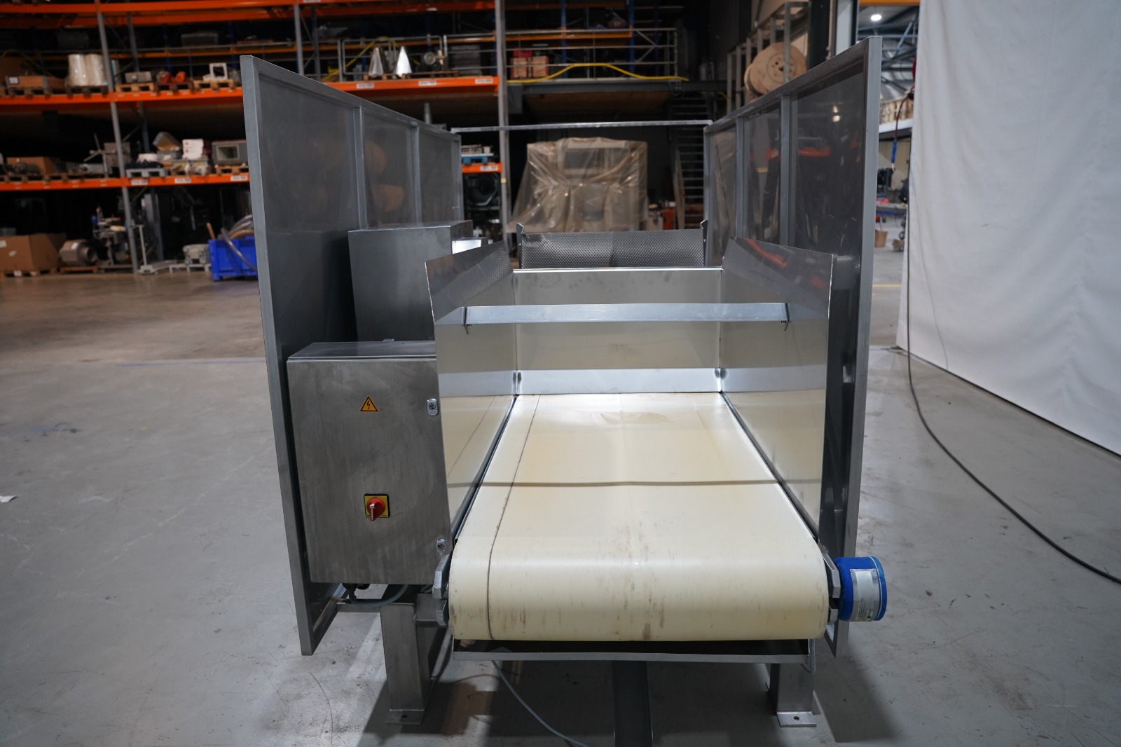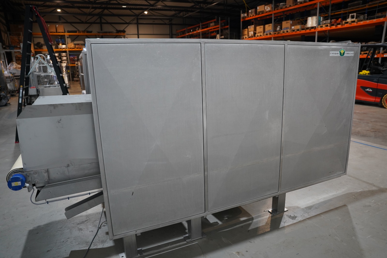 SAS DISPAC tilting device for 200 liter meat bins with outfeed belt, type: VIDEP, serial number: 08V28, year of construction: 06/08, plastic belt, belt width: 600 mm, total dimensions: 3400 mm x 1580 mm x 1810 mm.