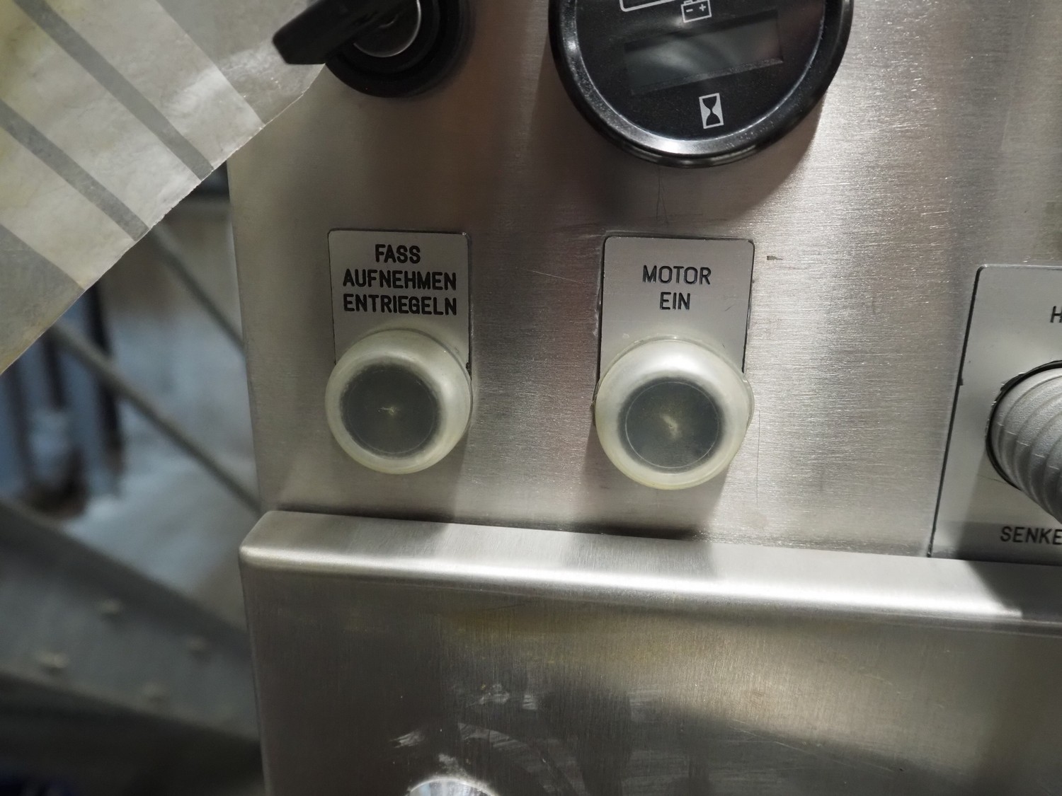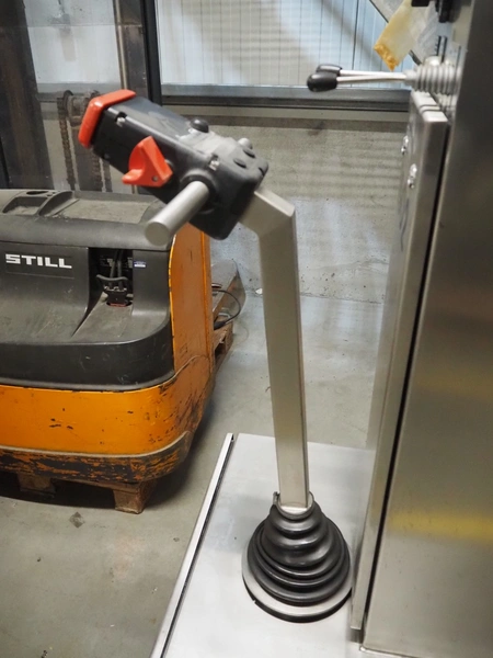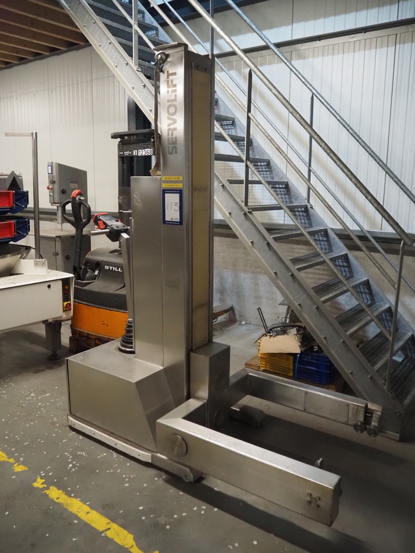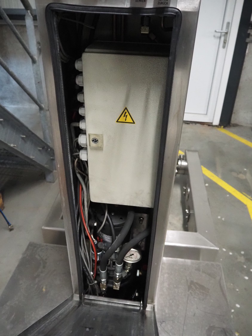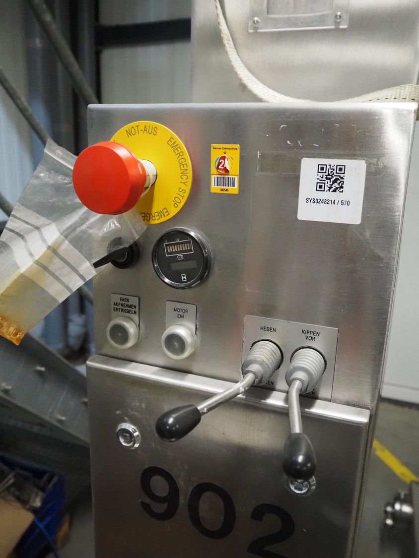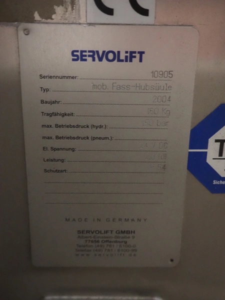 Servolift GmbH lifter for barrels, type: mob. Fass-Hubsäule, serial number: 10905, year of construction: 2004, capacity: 160 kg, lifting height: 2300 mm, total dimensions: 1850 mm x 800 mm x 2300 mm.