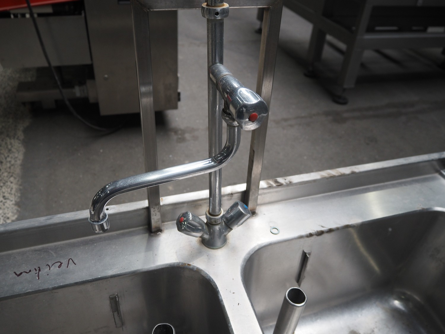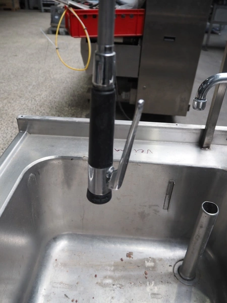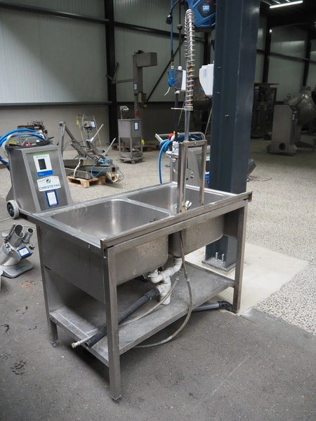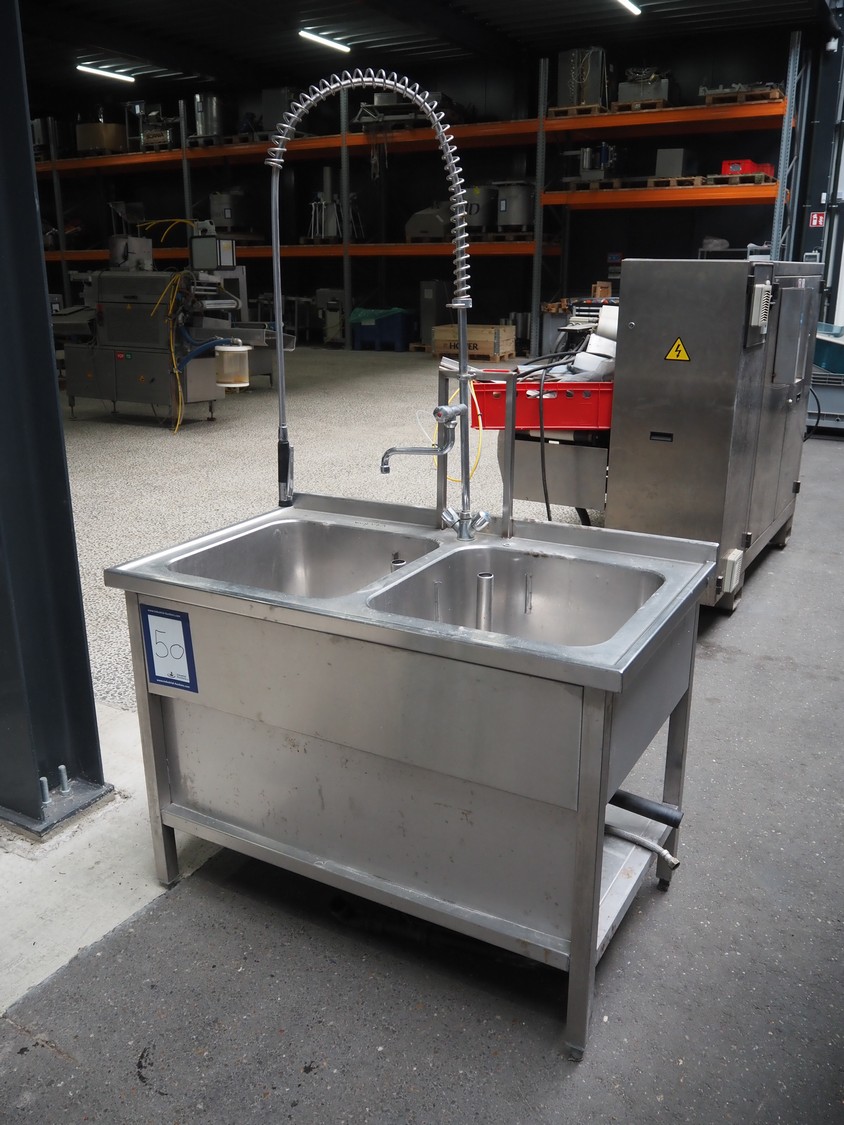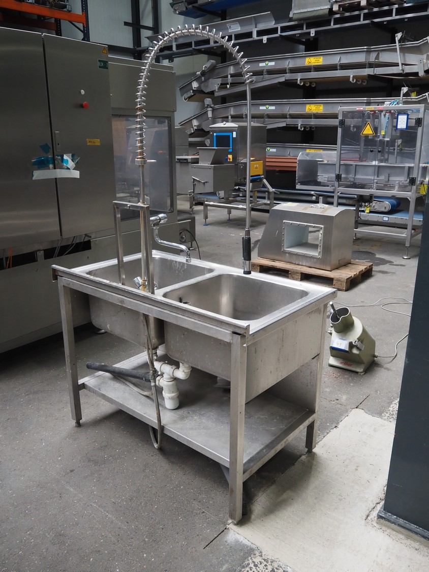 S/s double sink with faucet, dimensions: 1200 mm x 700 mm x 1940 mm.