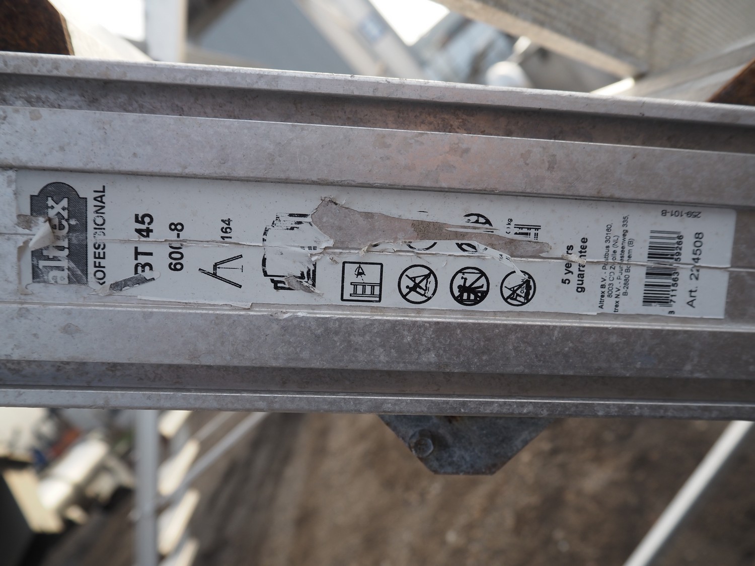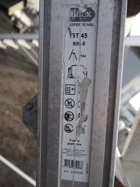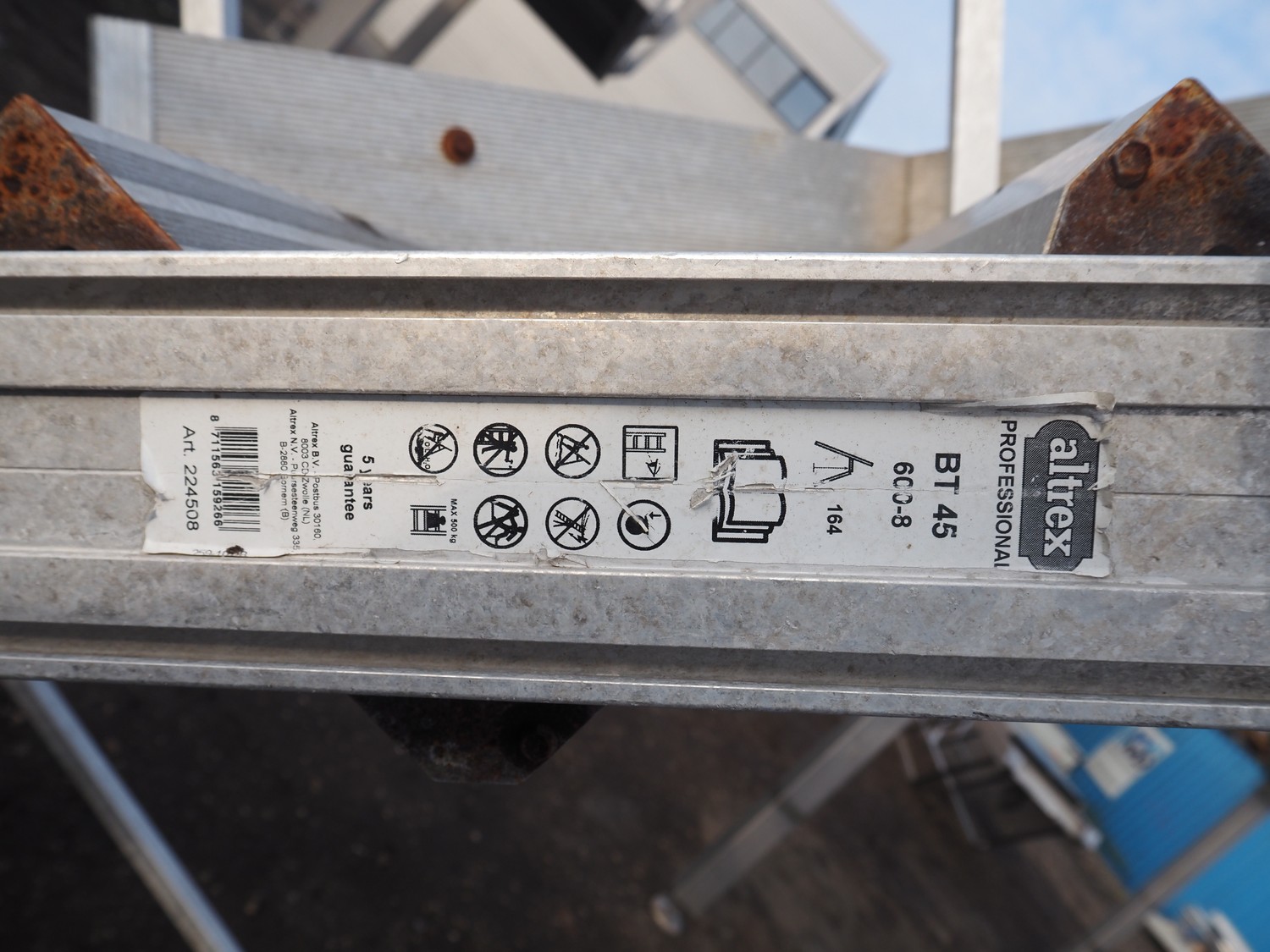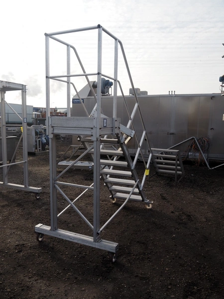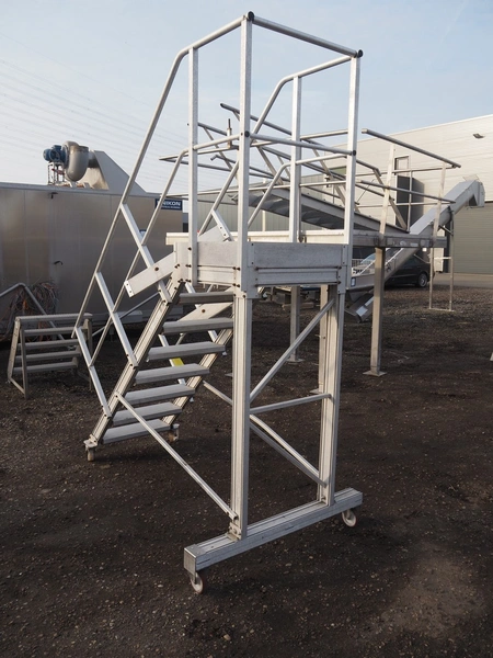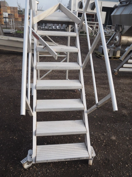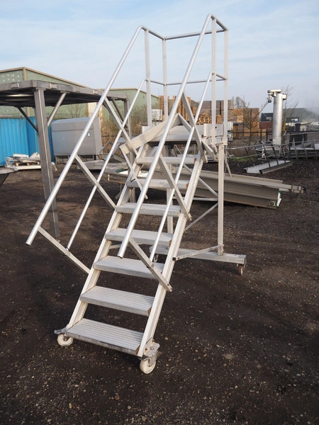 Mobile aluminium platform with stairs, 8 steps, working height: 1600 mm, total dimensions: 2350 mm x 1200 mm x 2700 mm.