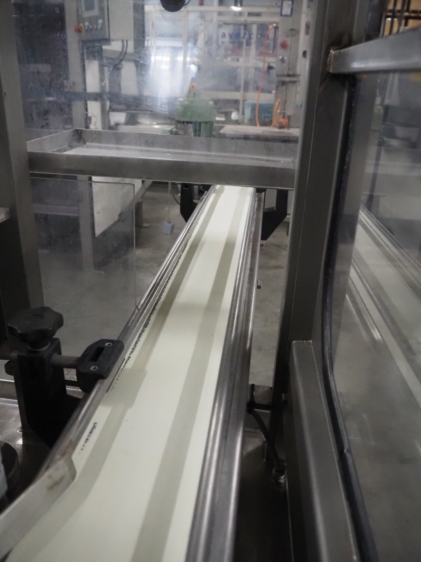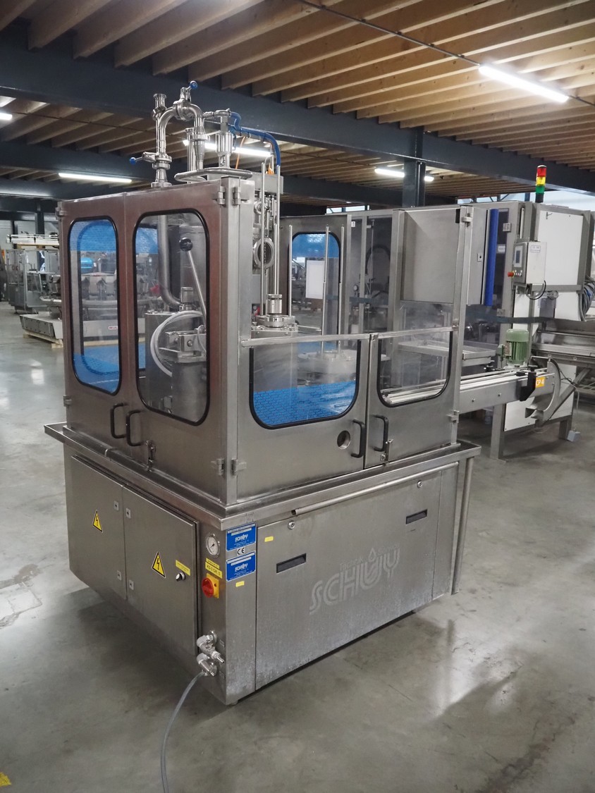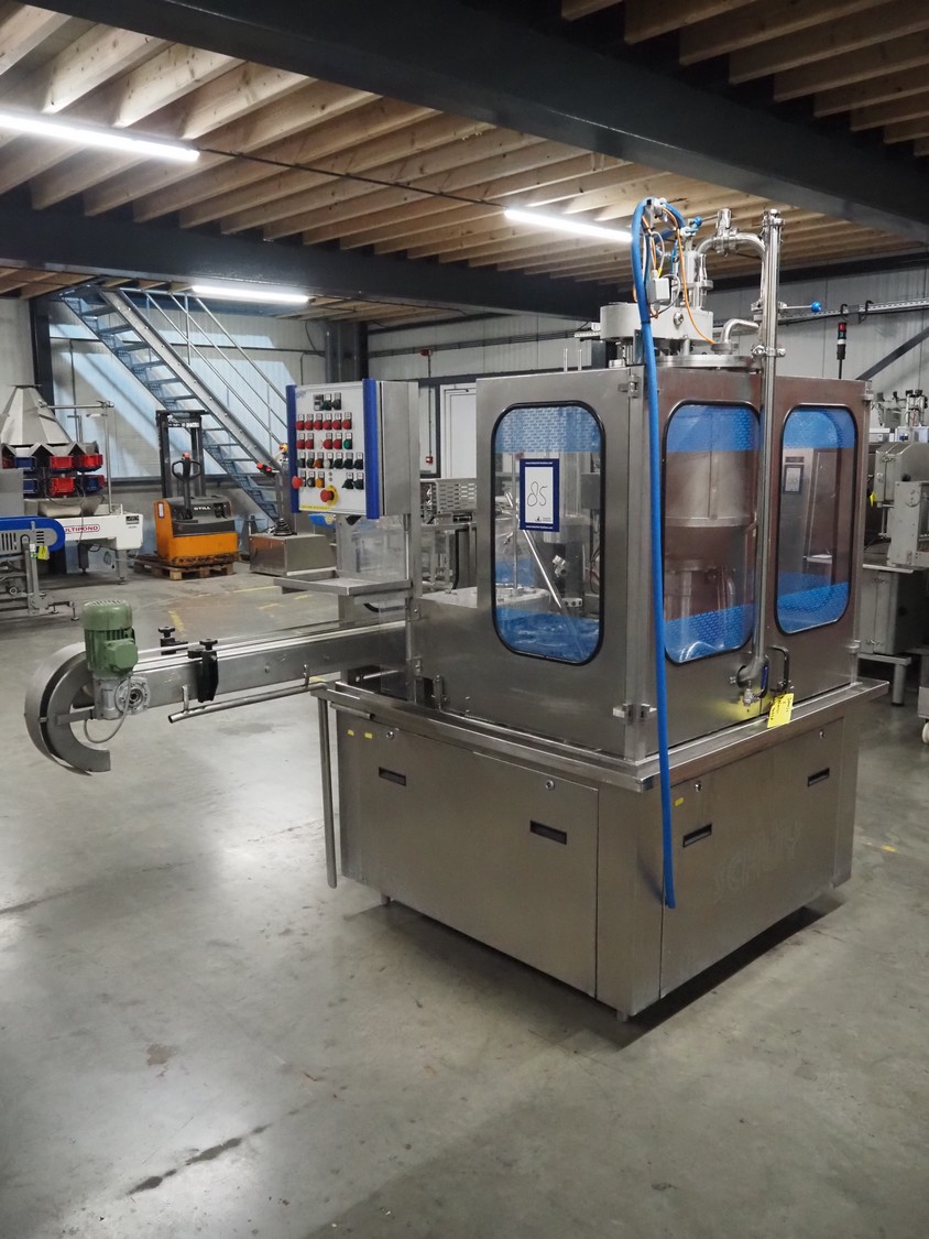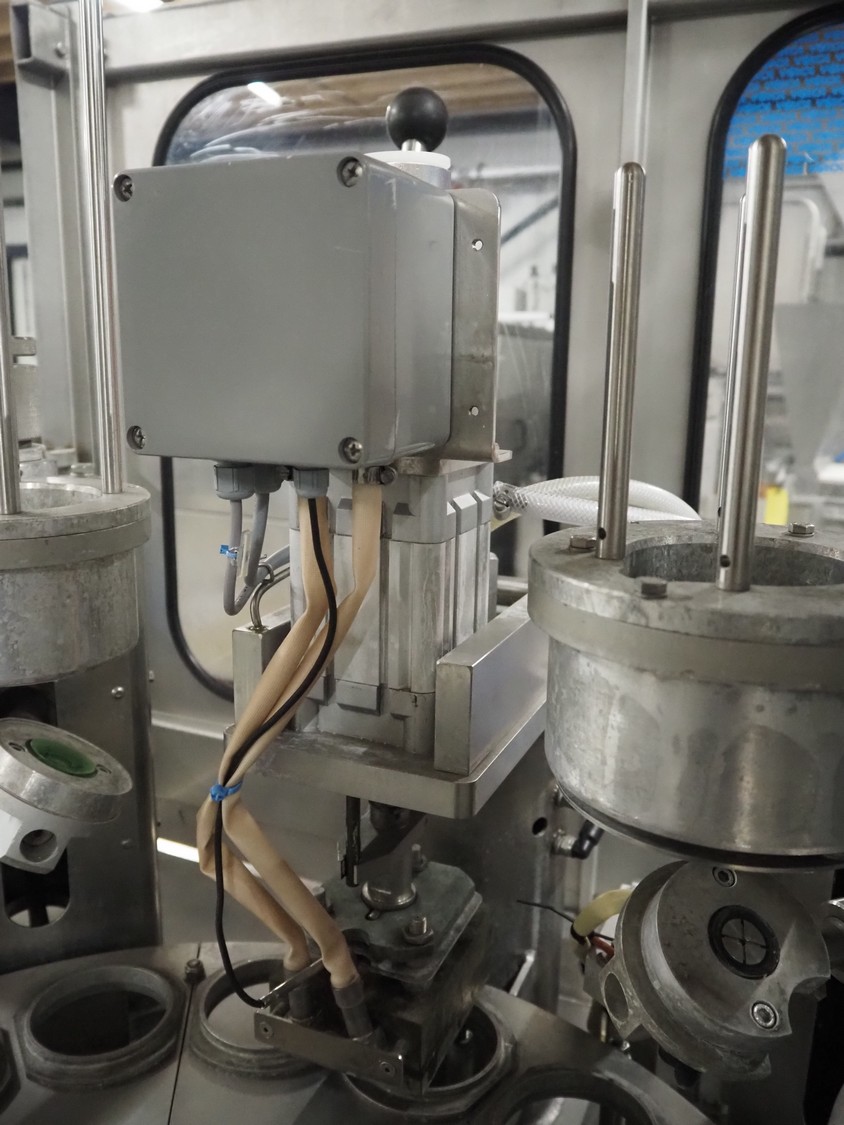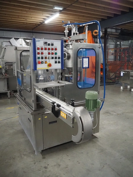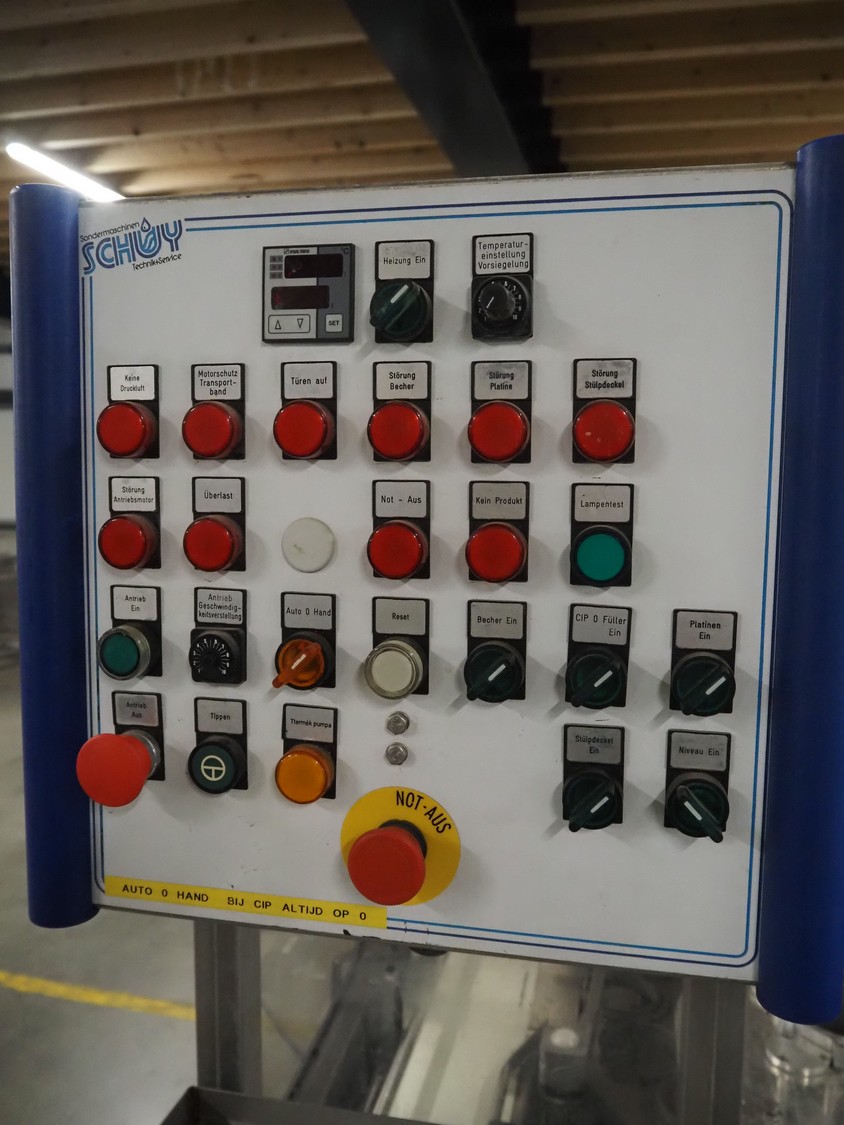 Schuy cup filling and closing machine, type: SchuCup 3000, machine number: 6727, diameter cups: 95 mm, plastic outfeed belt, belt width: 120 mm, total dimensions: 2400 mm x 1440 mm x 2350 mm.