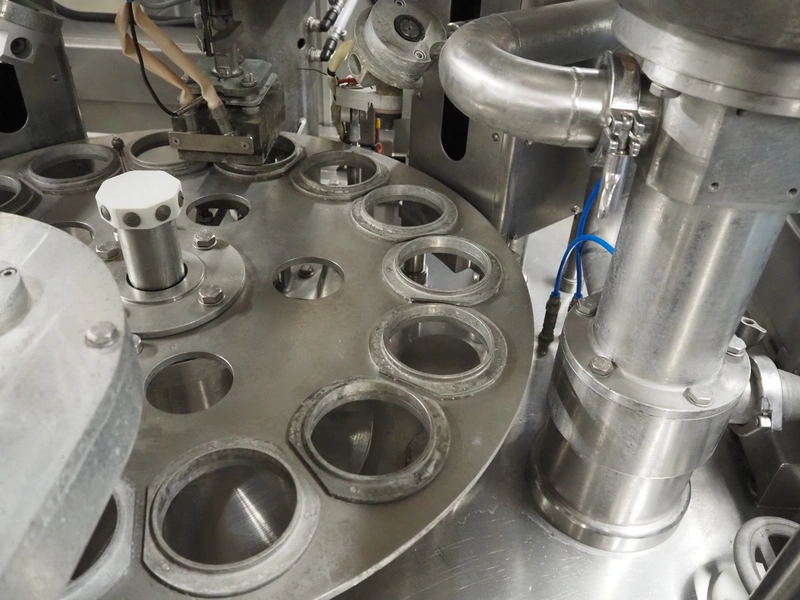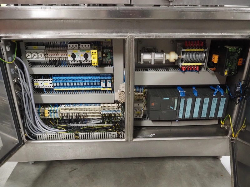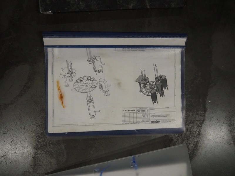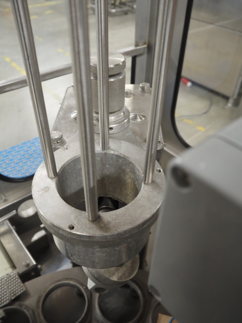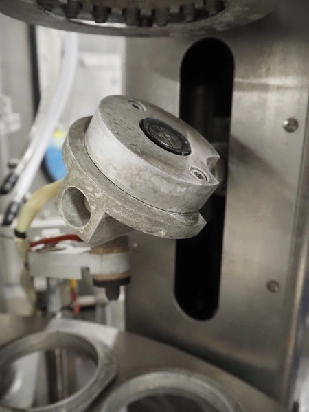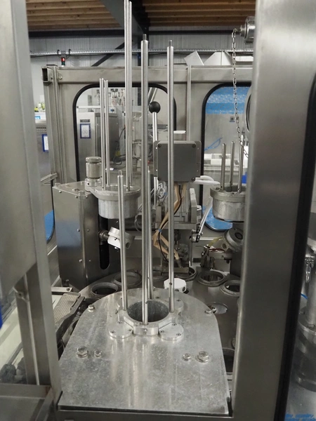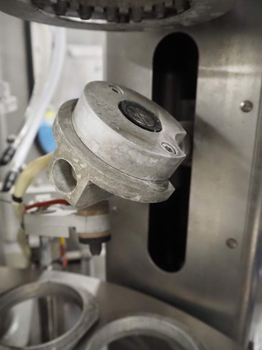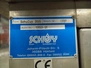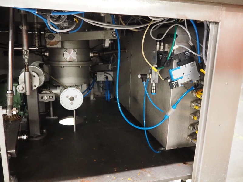 Schuy cup filling and closing machine, type: SchuCup 3000, machine number: 6727, diameter cups: 95 mm, plastic outfeed belt, belt width: 120 mm, total dimensions: 2400 mm x 1440 mm x 2350 mm.