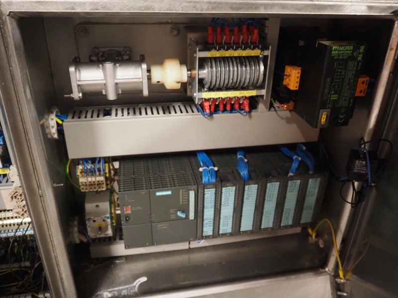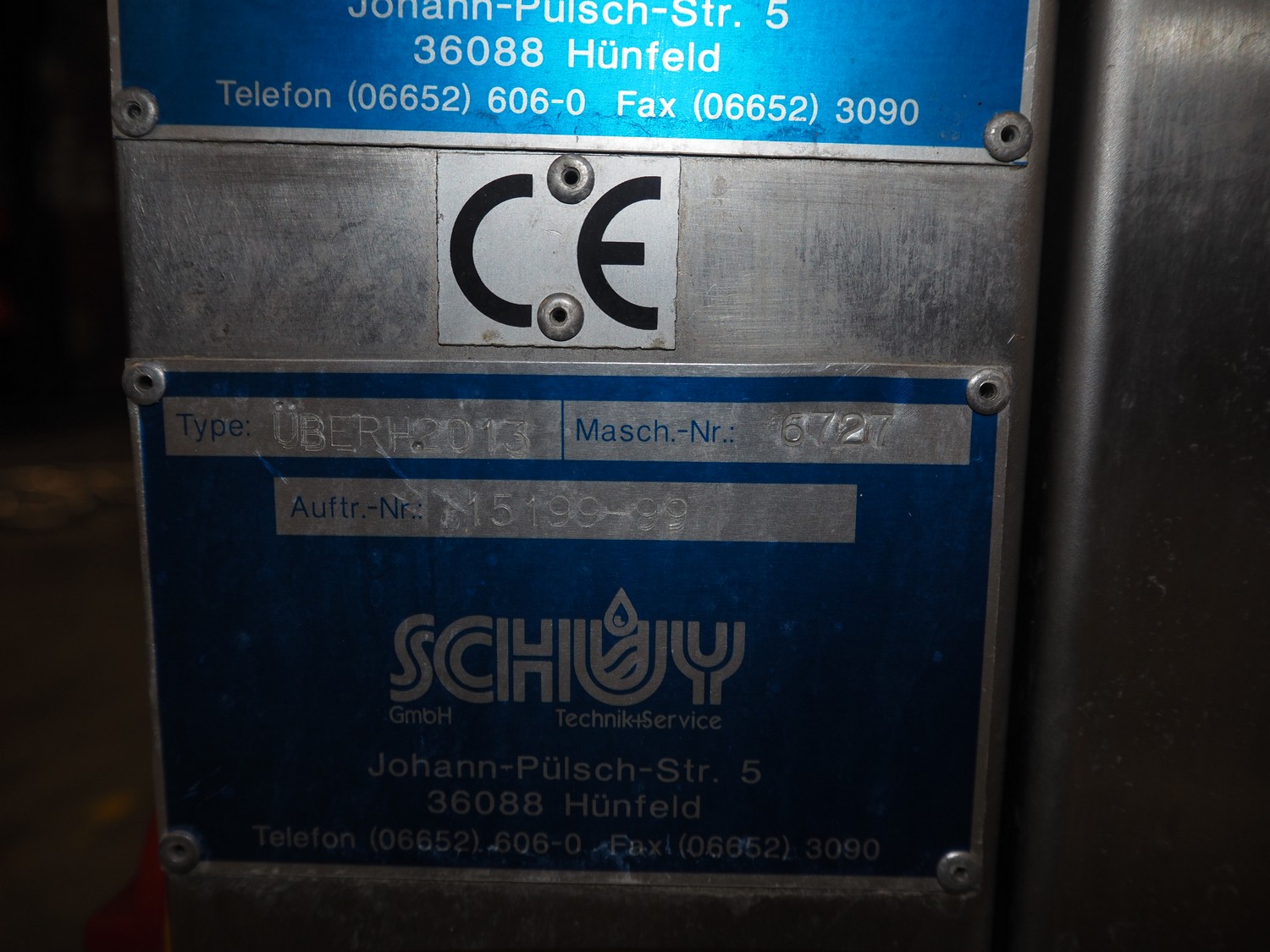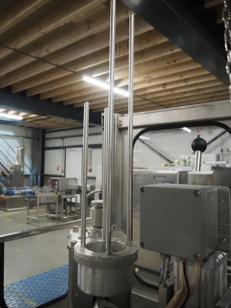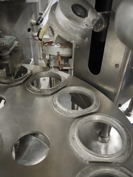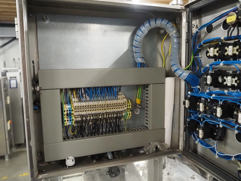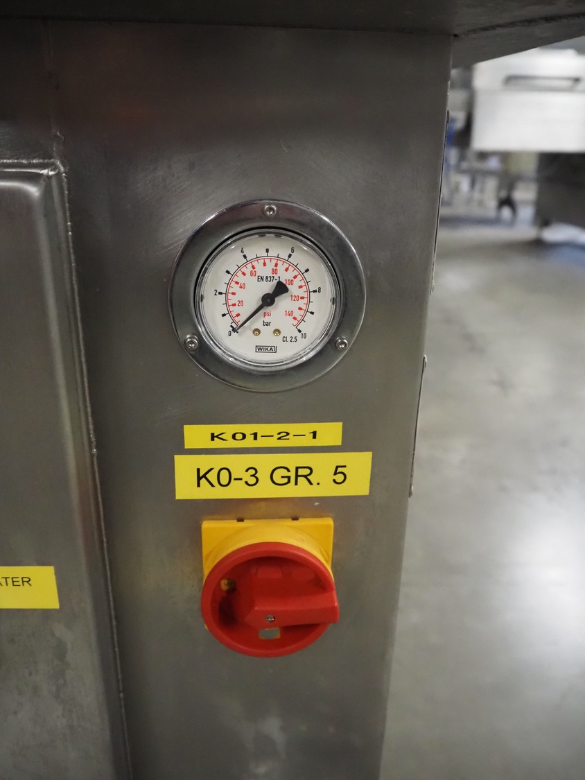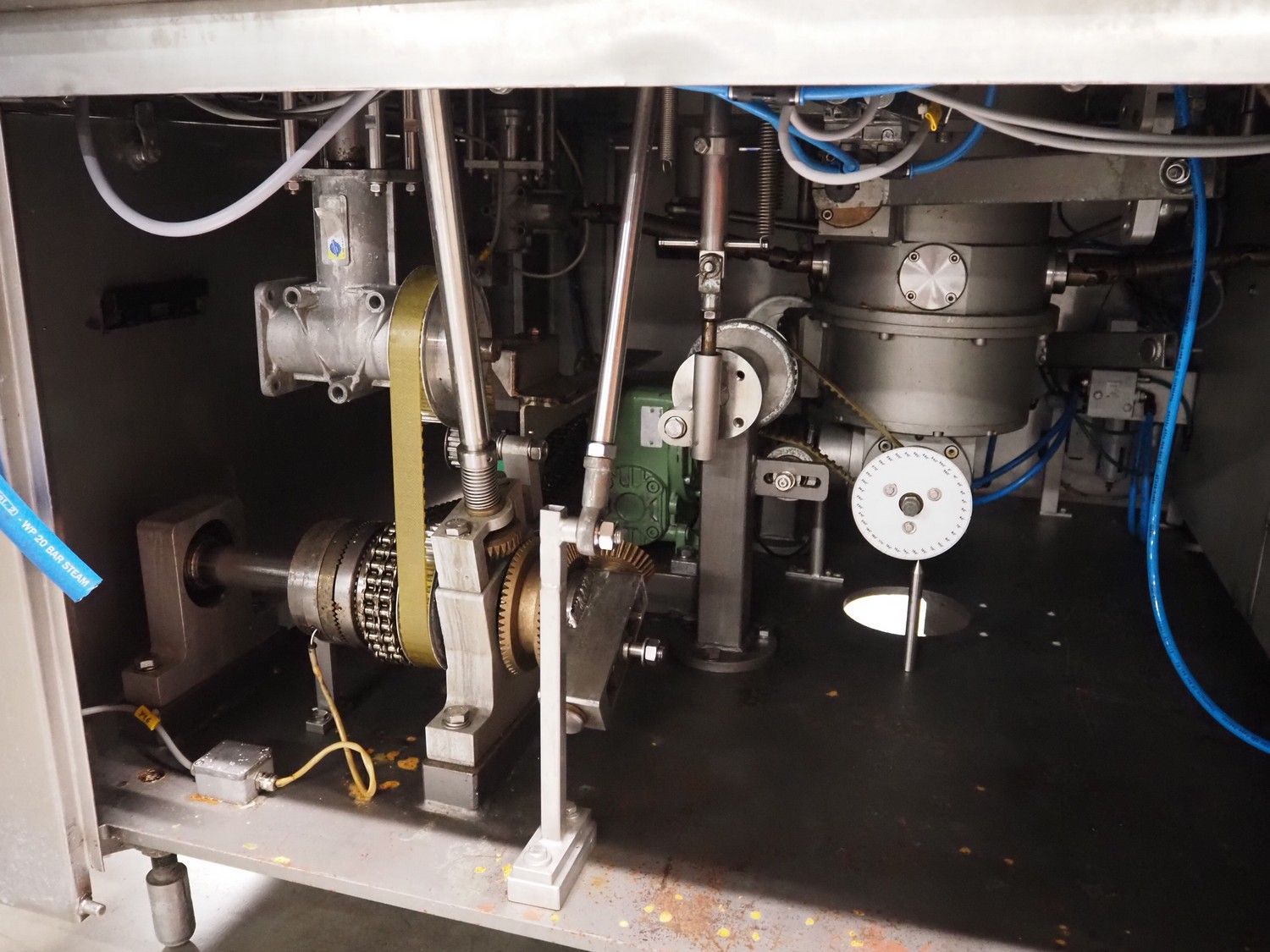 Schuy cup filling and closing machine, type: SchuCup 3000, machine number: 6727, diameter cups: 95 mm, plastic outfeed belt, belt width: 120 mm, total dimensions: 2400 mm x 1440 mm x 2350 mm.