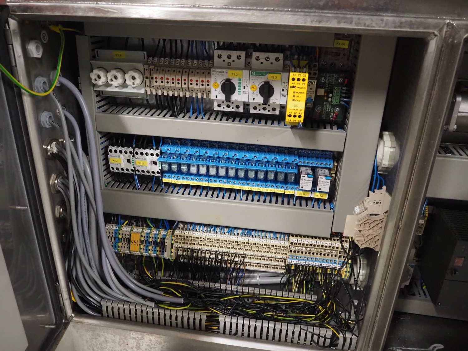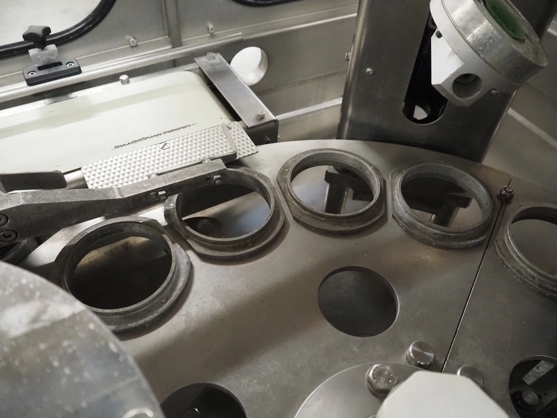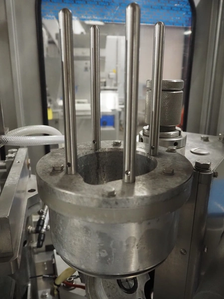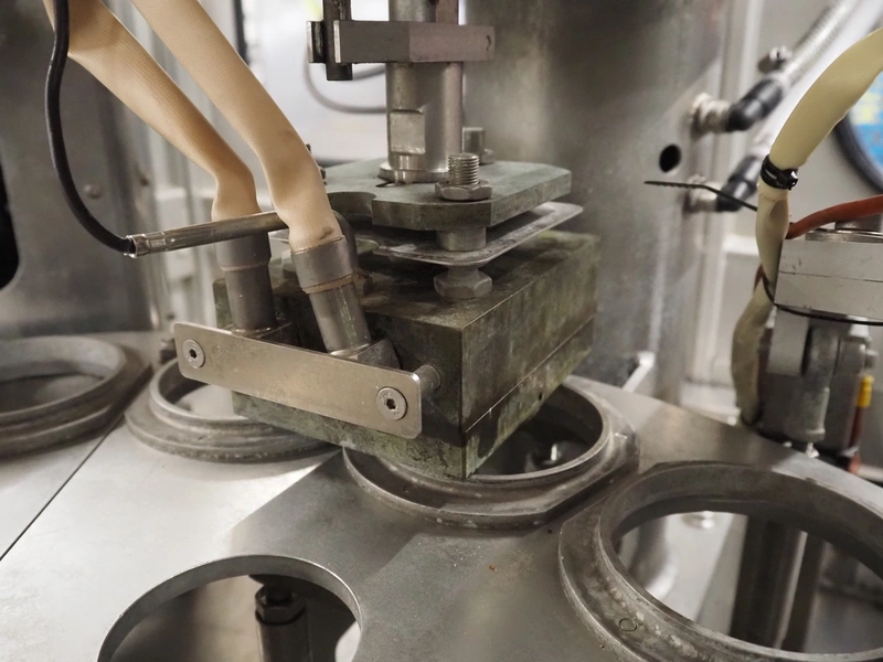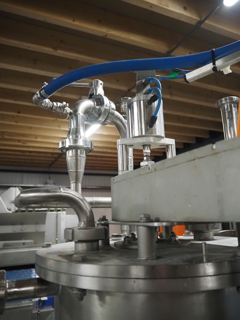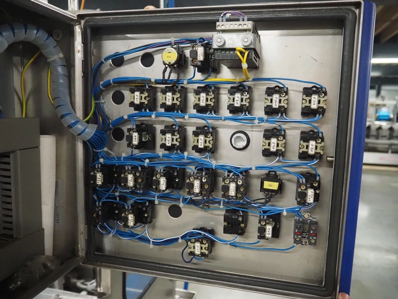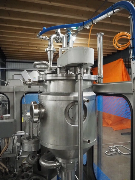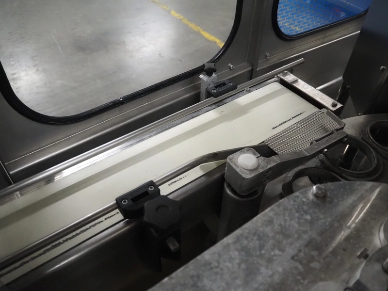 Schuy cup filling and closing machine, type: SchuCup 3000, machine number: 6727, diameter cups: 95 mm, plastic outfeed belt, belt width: 120 mm, total dimensions: 2400 mm x 1440 mm x 2350 mm.