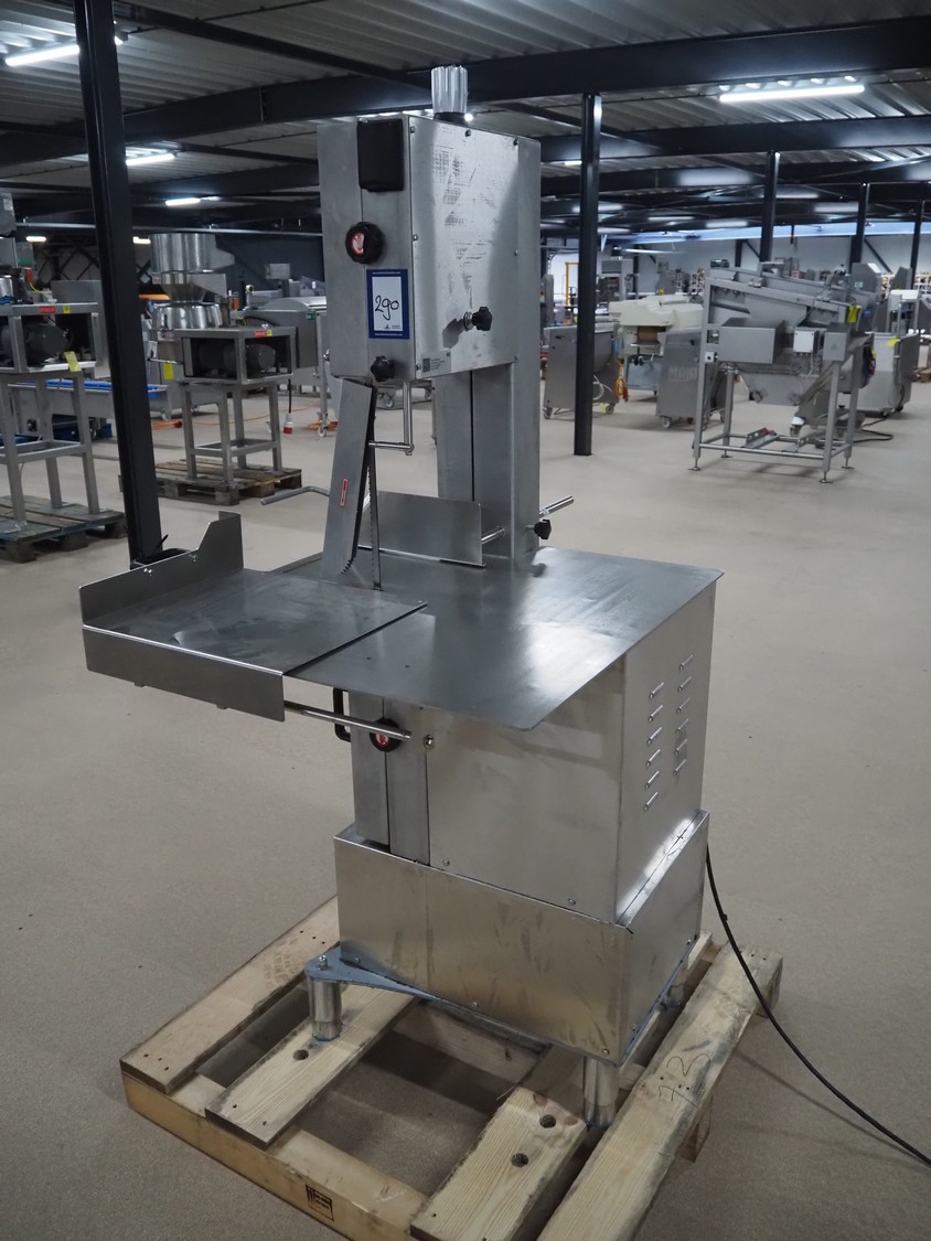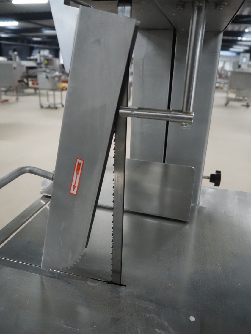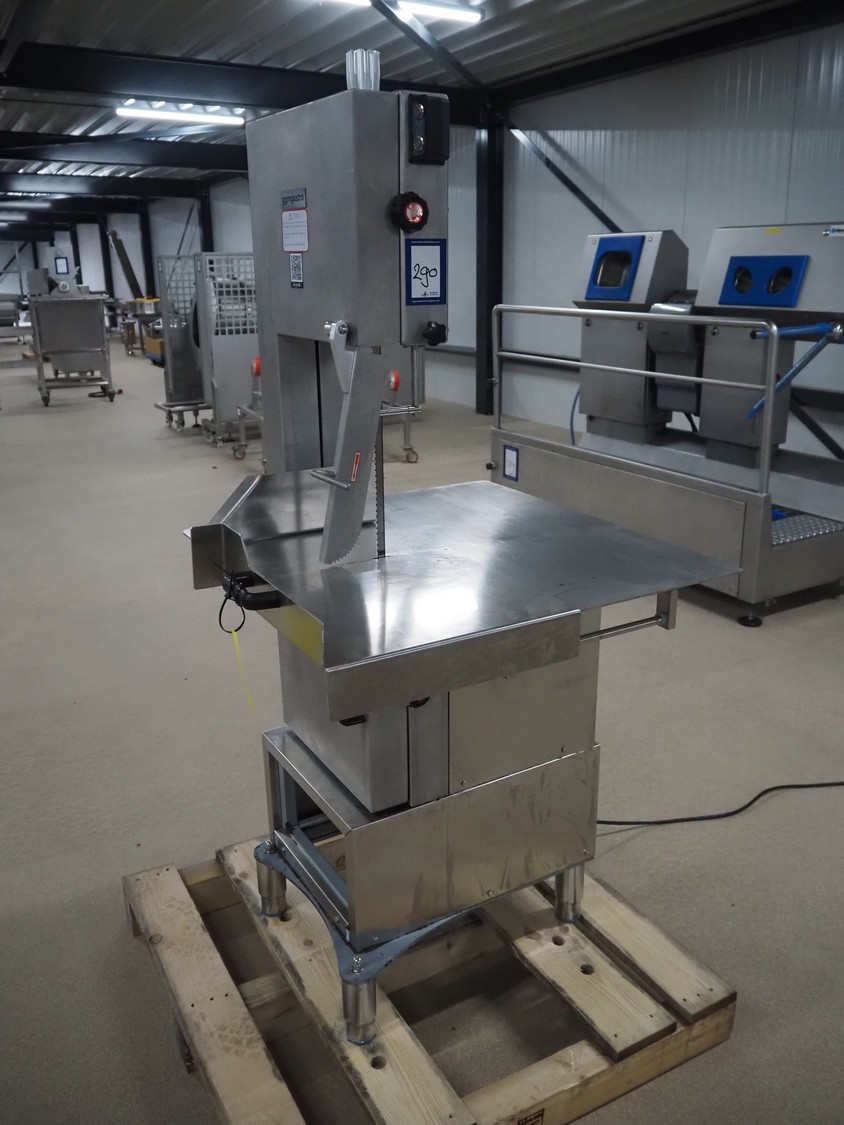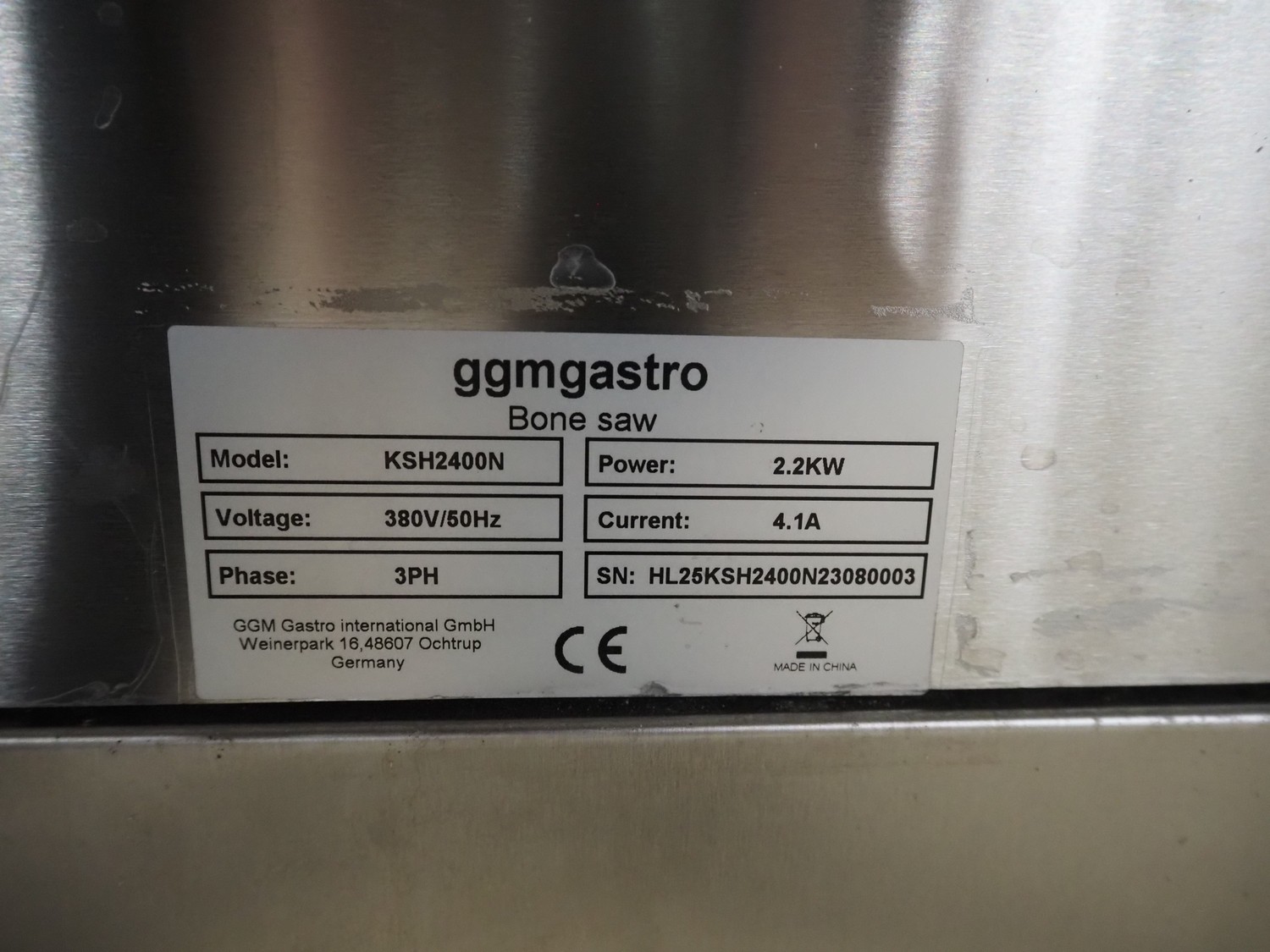 GGM Gastro International GmbH bandsaw, model: KSH2400N, serial number: HL25KSH2400N23080003, 380 V, 3 Ph, 50 Hz, 4.1 A, 2.2 kW, dimensions table: 770 mm x 760 mm, total dimensions: 960 mm x 840 mm x 1740 mm.
