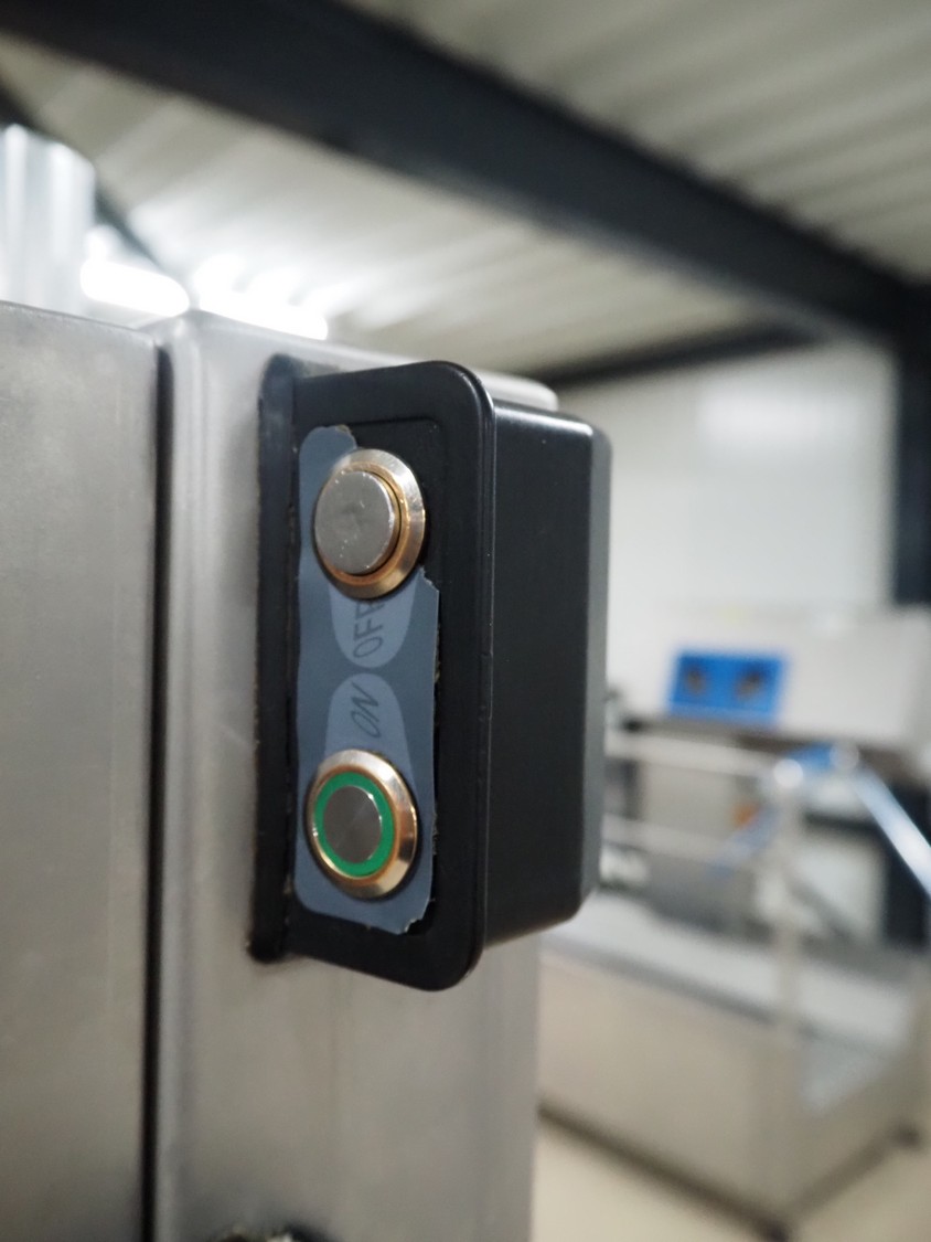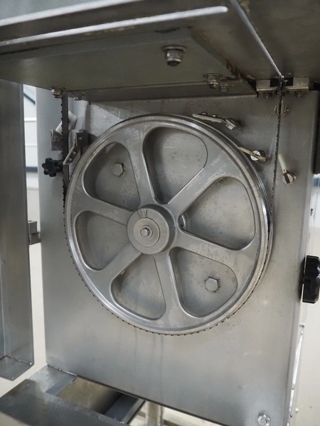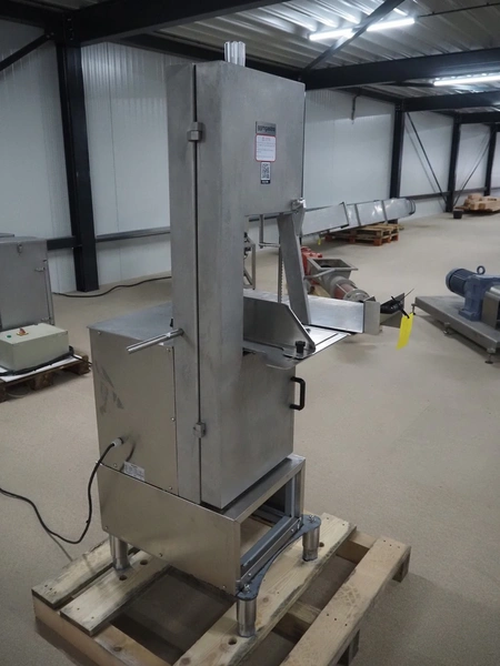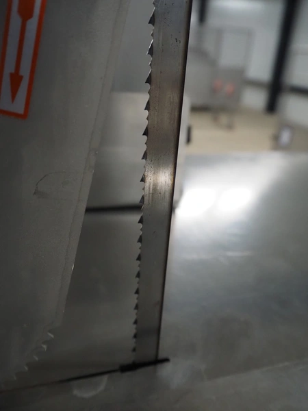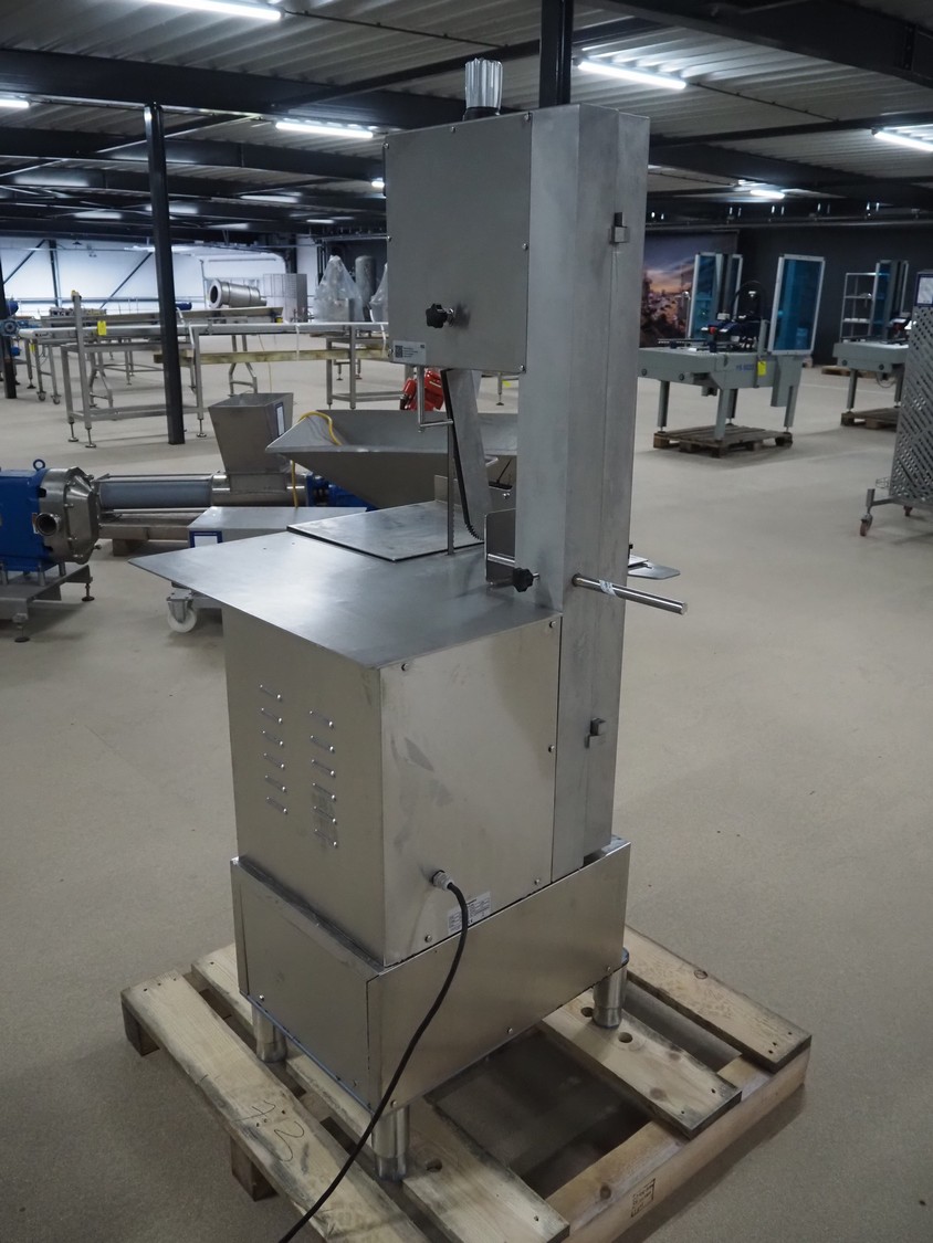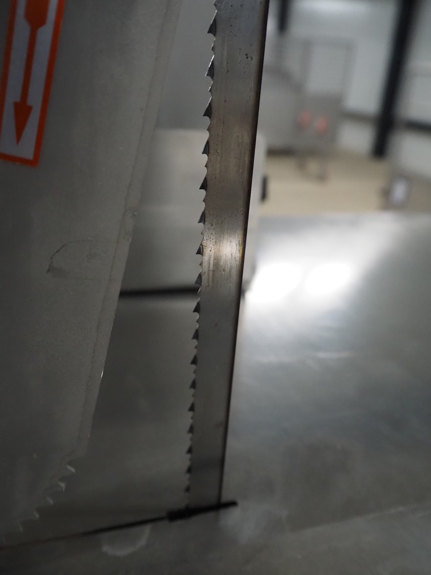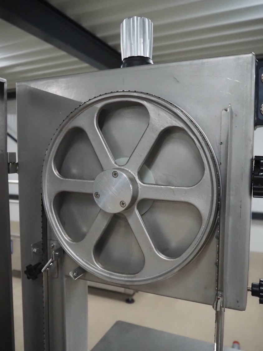 GGM Gastro International GmbH bandsaw, model: KSH2400N, serial number: HL25KSH2400N23080003, 380 V, 3 Ph, 50 Hz, 4.1 A, 2.2 kW, dimensions table: 770 mm x 760 mm, total dimensions: 960 mm x 840 mm x 1740 mm.