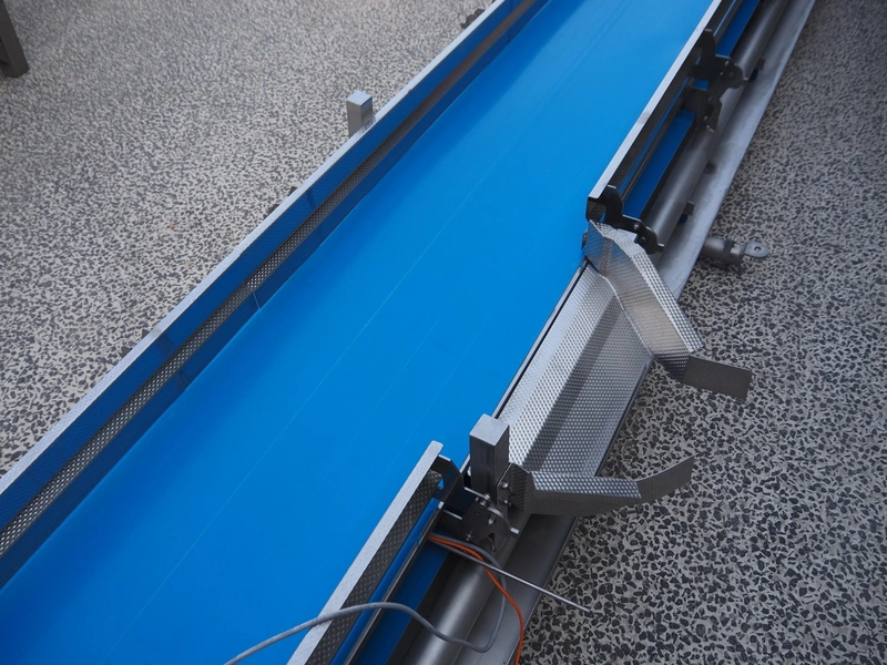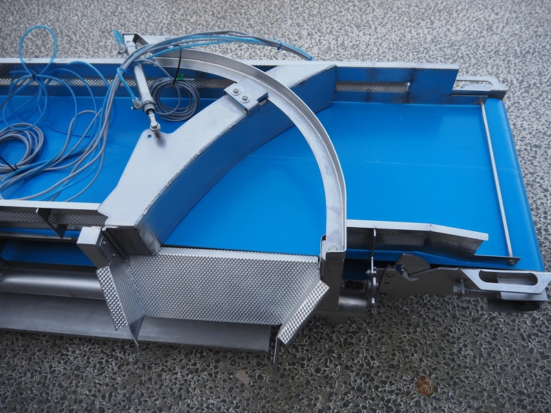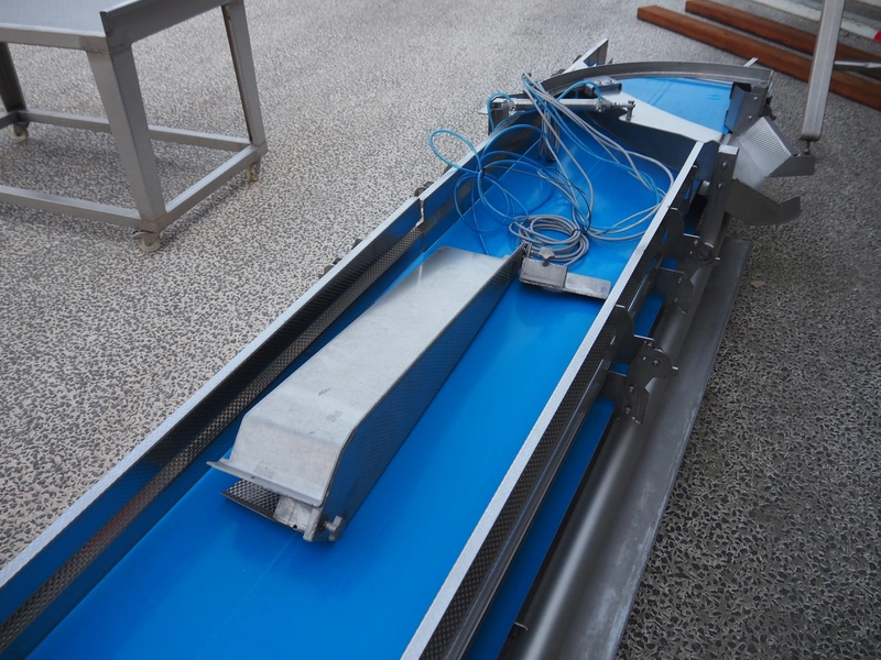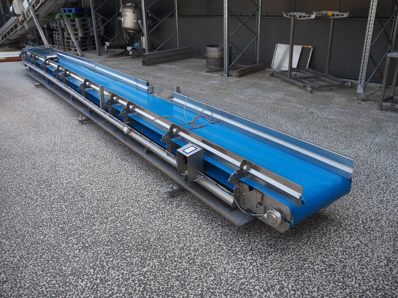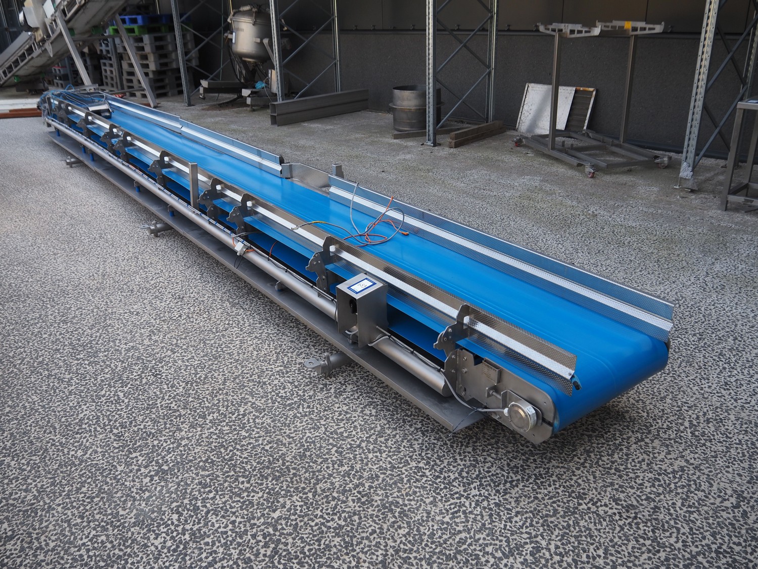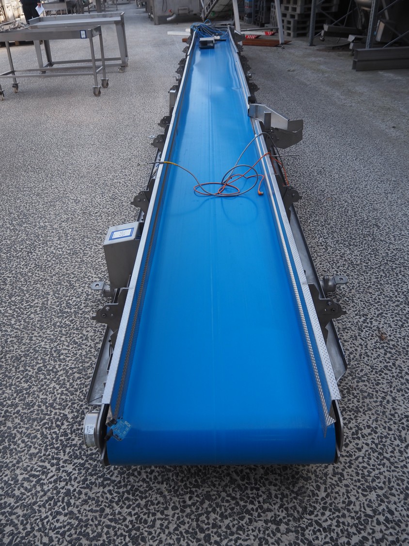 Feltracon transport belt, s/s frame, plastic belt, belt width: 600 mm, total dimensions: 9150 mm x 1100 mm x 650 mm.