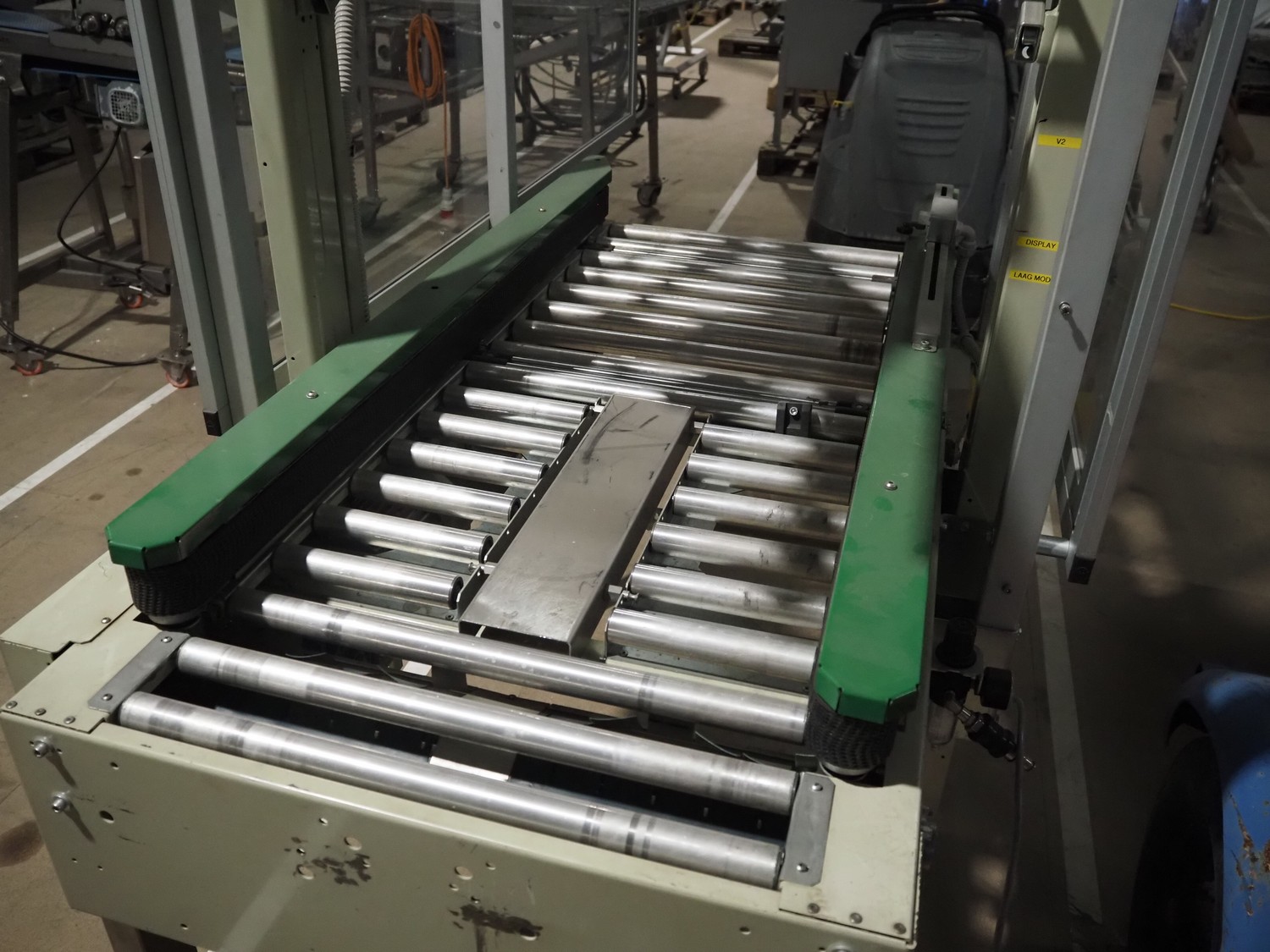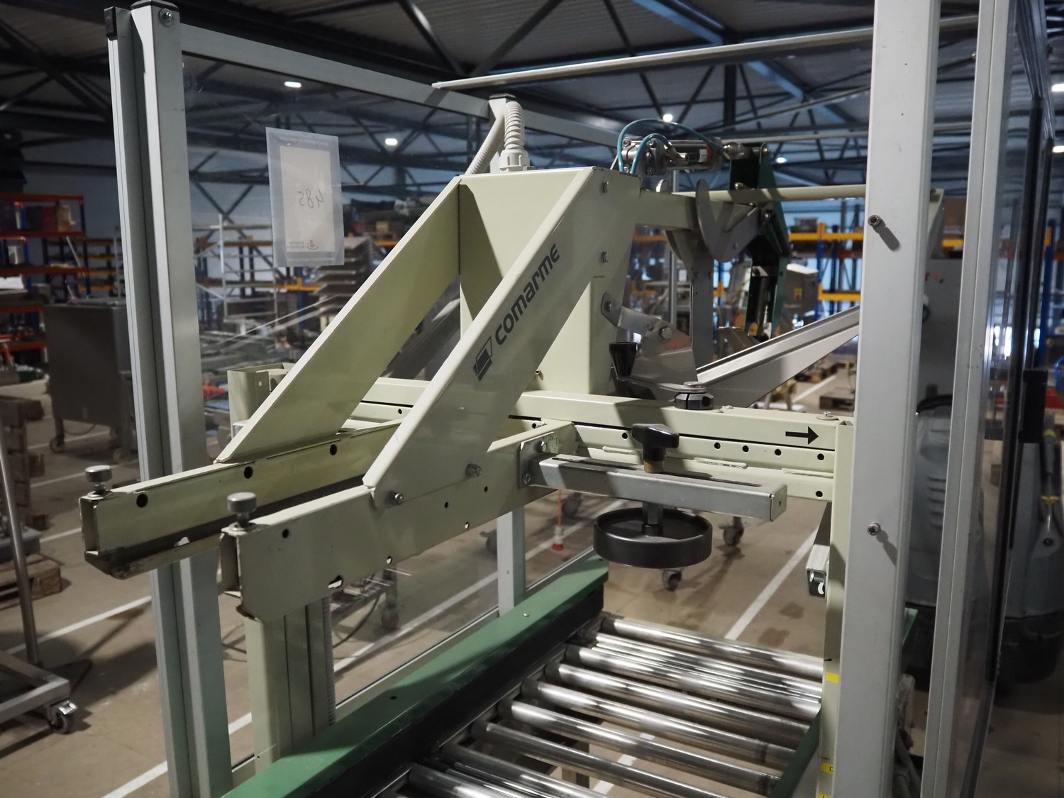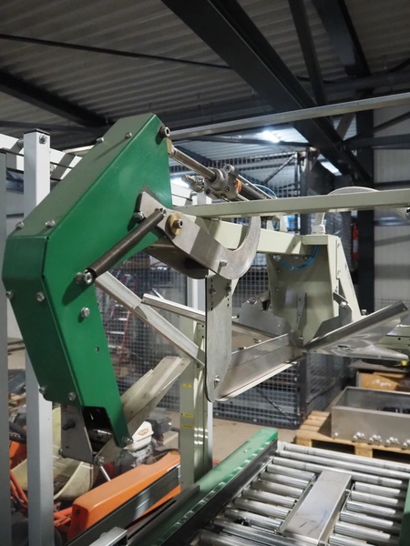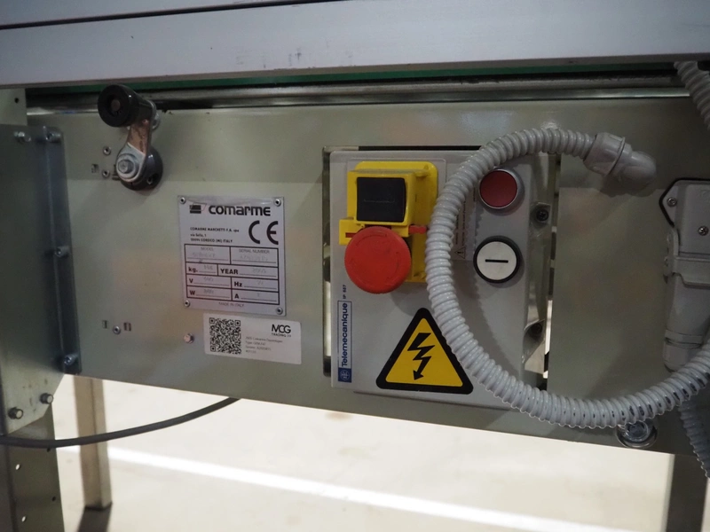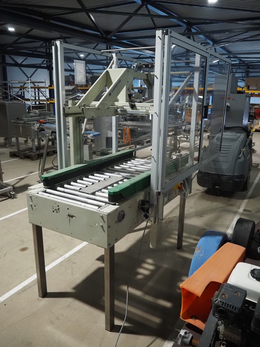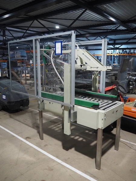 Comarme box closing machine with top taper, model: GEM-f47, serial number: AZ025815, year of construction: 2005, 400 V, 50 Hz. 1 A, 280 W, weight: 186 kg, steel rollers, roller width: 520 mm, plastic belt, belt width: 50 mm, total dimensions: 2200 mm x 980 mm x 1960 mm.