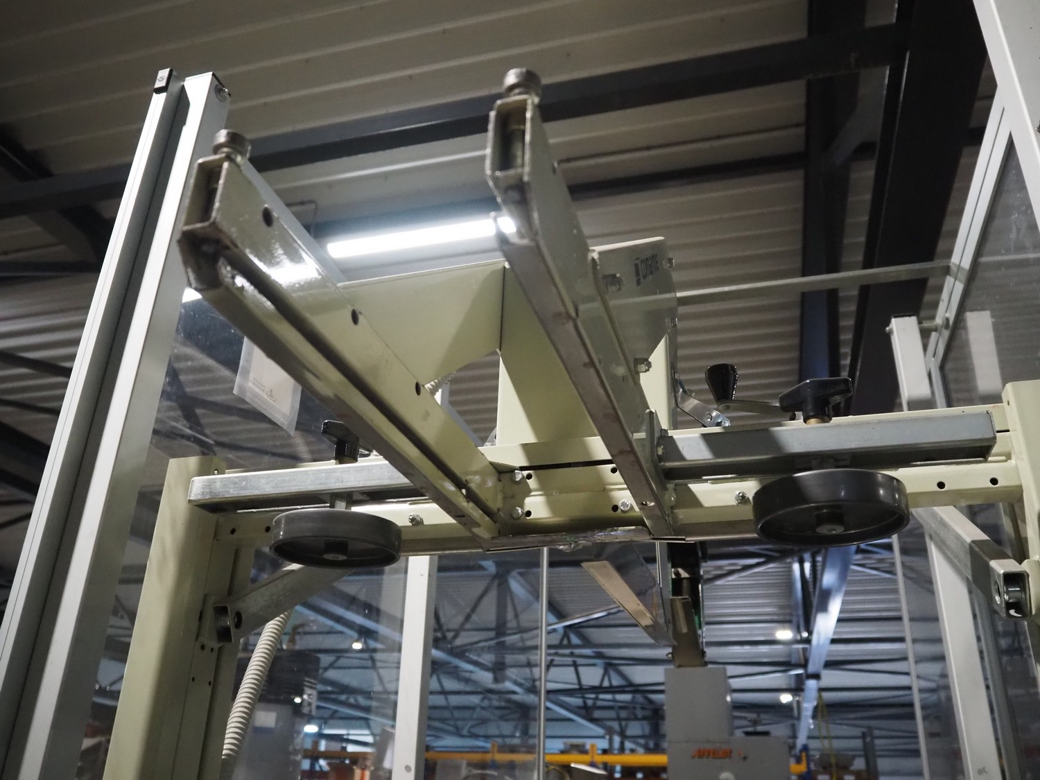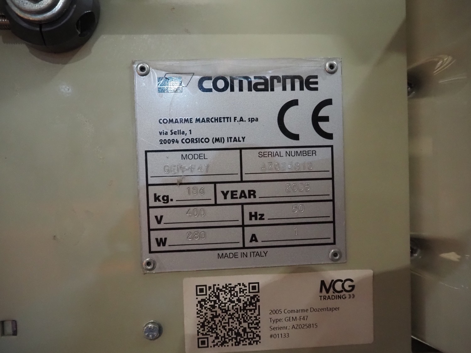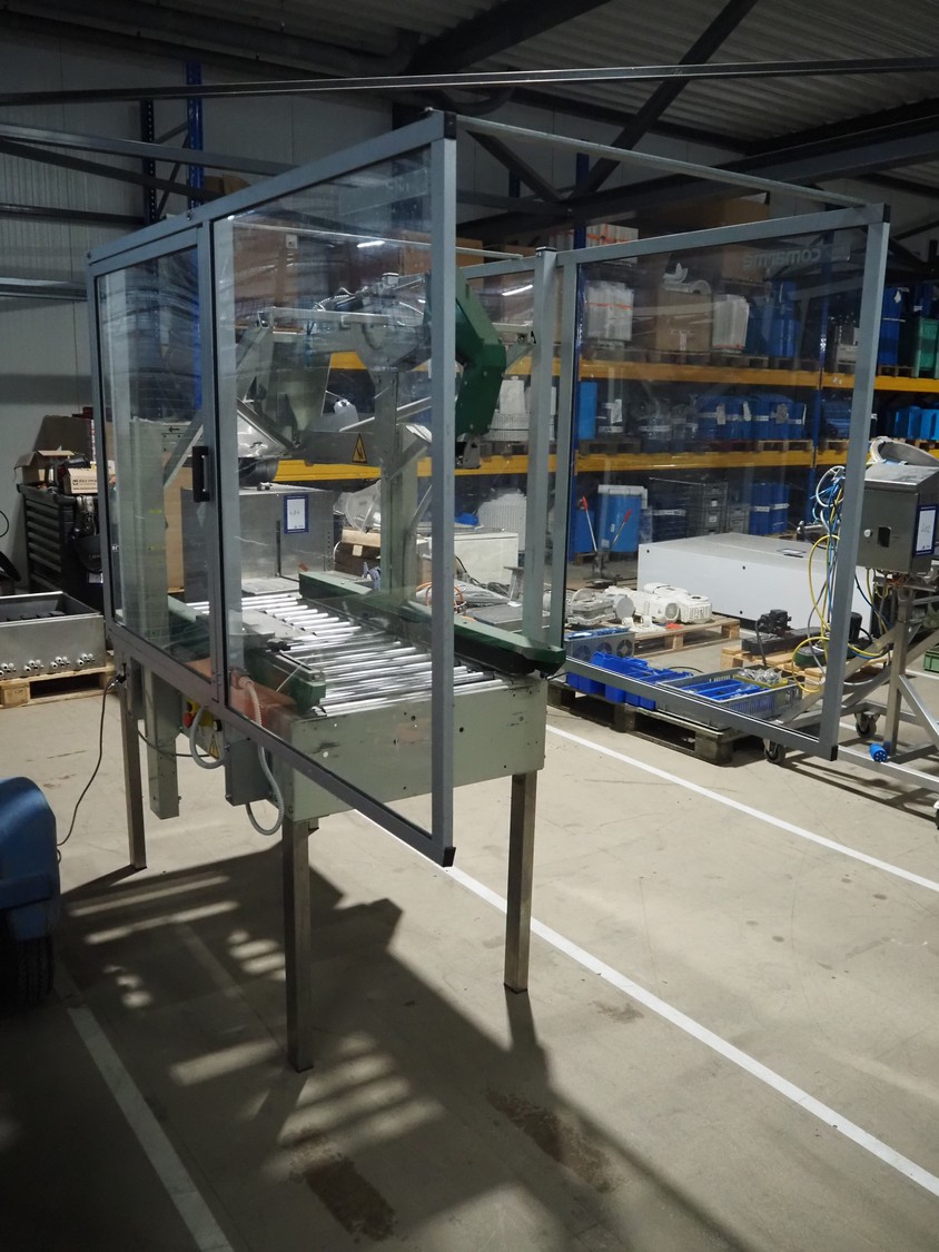 Comarme box closing machine with top taper, model: GEM-f47, serial number: AZ025815, year of construction: 2005, 400 V, 50 Hz. 1 A, 280 W, weight: 186 kg, steel rollers, roller width: 520 mm, plastic belt, belt width: 50 mm, total dimensions: 2200 mm x 980 mm x 1960 mm.
