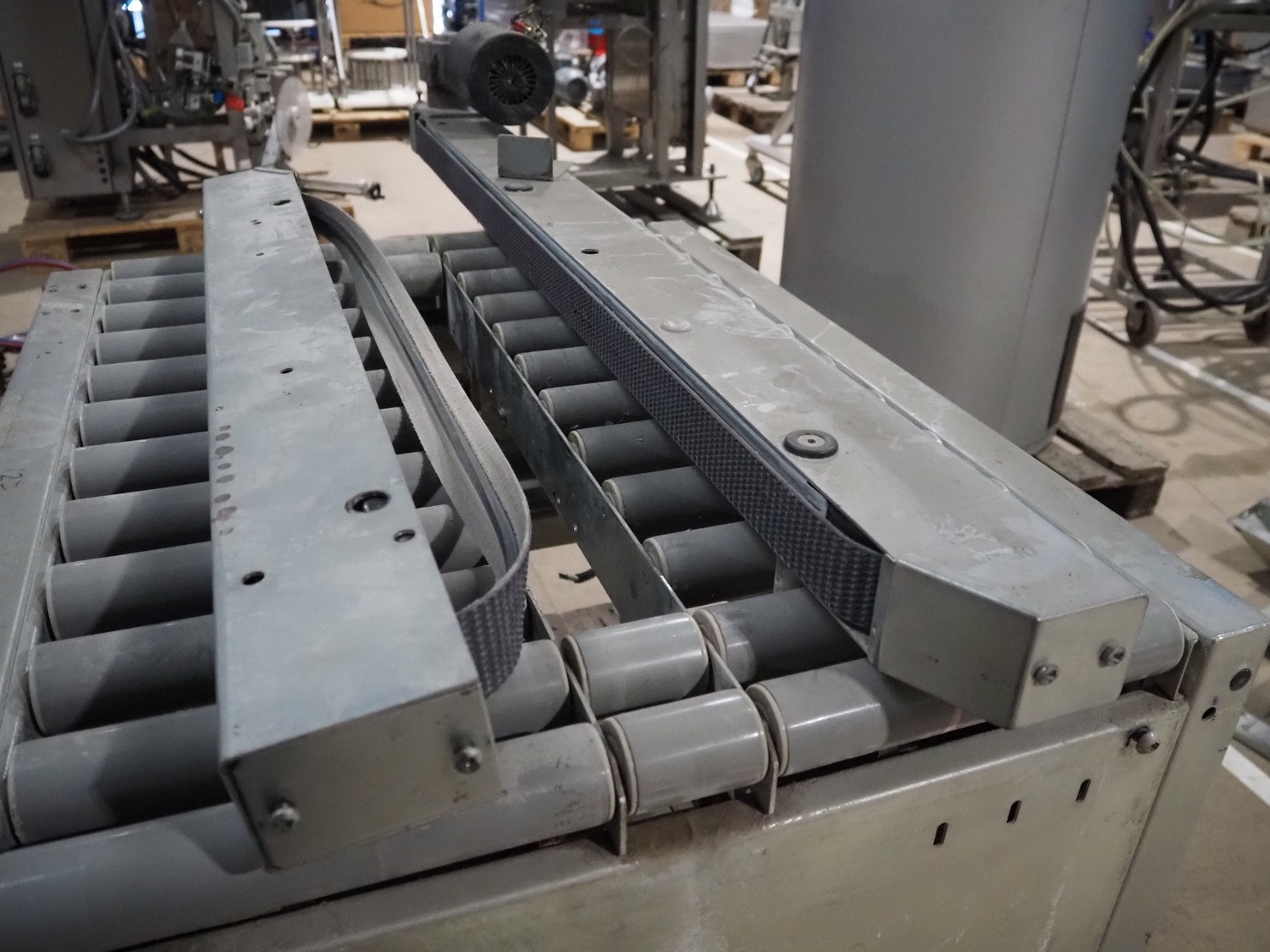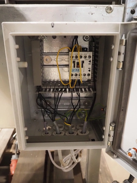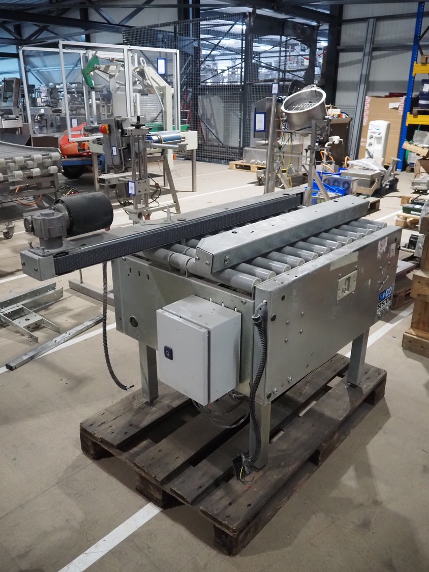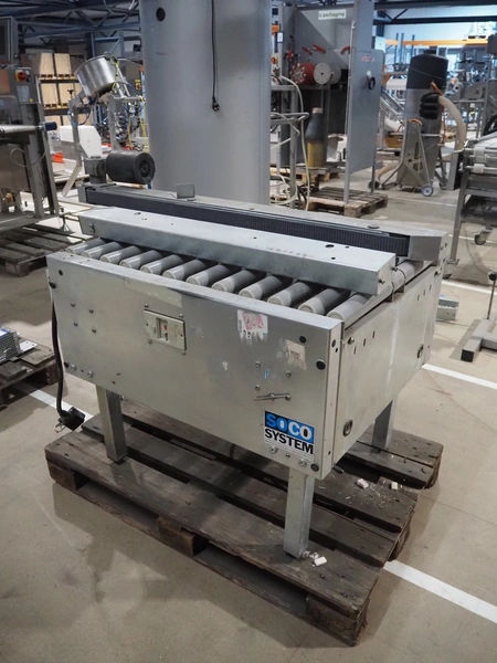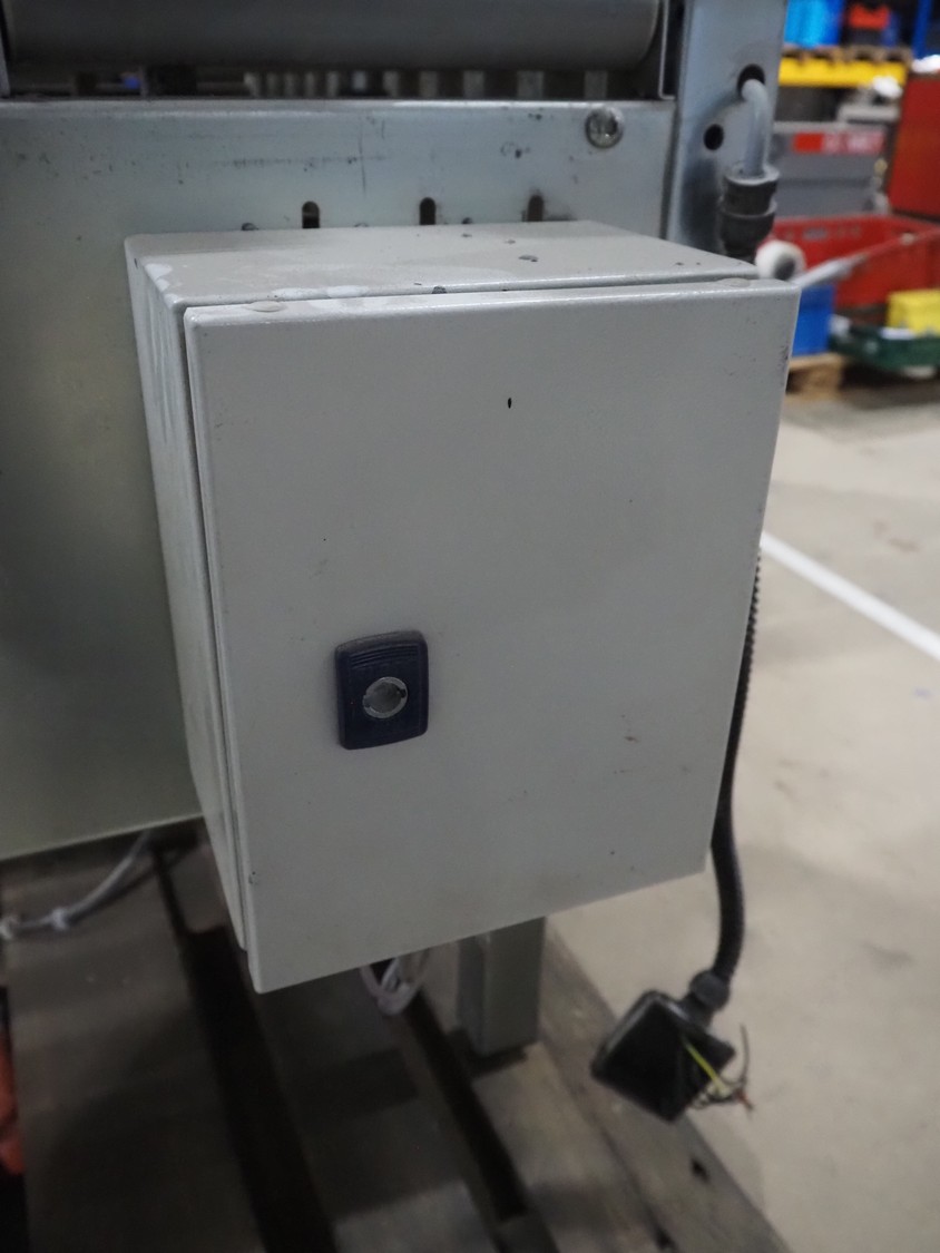 Soco System box taping machine, model: T-10, number: 621-88, 380 V, 3 Ph, plastic rollers, roller width: (2x) 260 mm, 70 mm, total dimensions: 1400 mm x 800 mm x 930 mm. Incomplete.