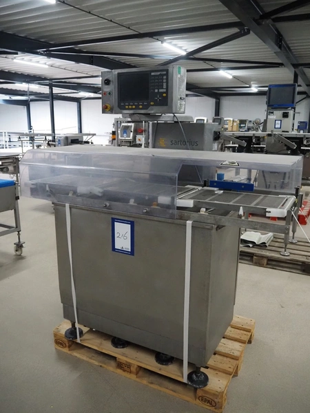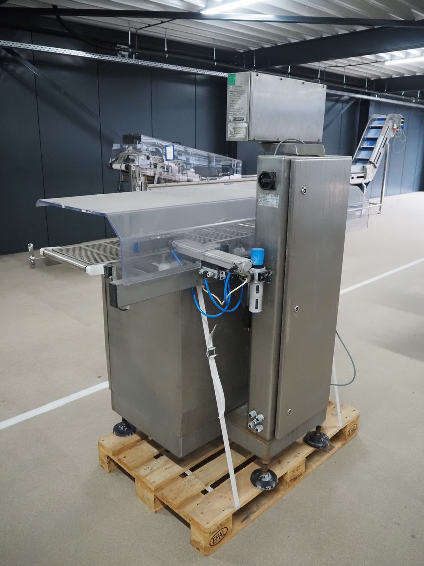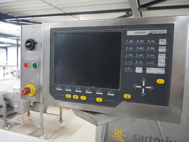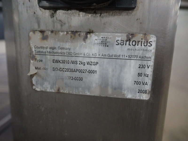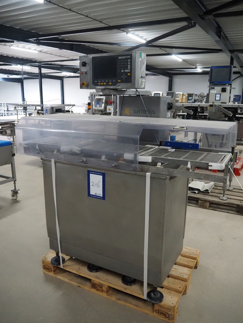 Sartorius checkweigher with rejector, type: EWK3010, number: BO-GC2038AP0027-001, year of construction: 2008, 230 V, 50 Hz, 700 vA, e=d= 0.2 gram, belt width: 300 mm, total dimensions: 1600 mm x 900 mm x 1700 mm. Missing belt.