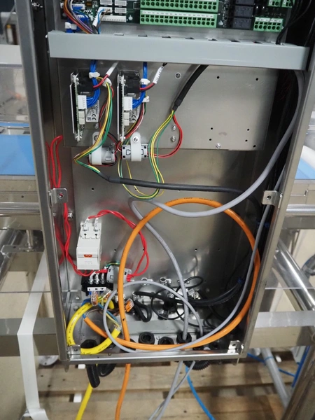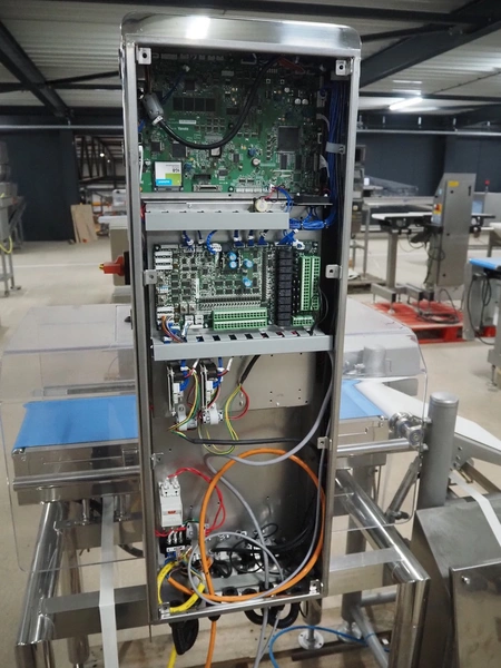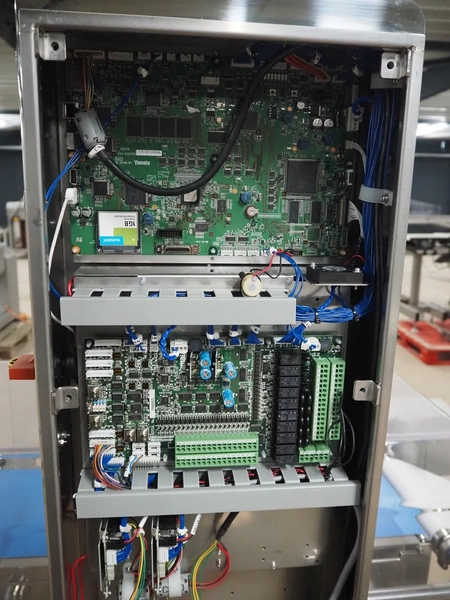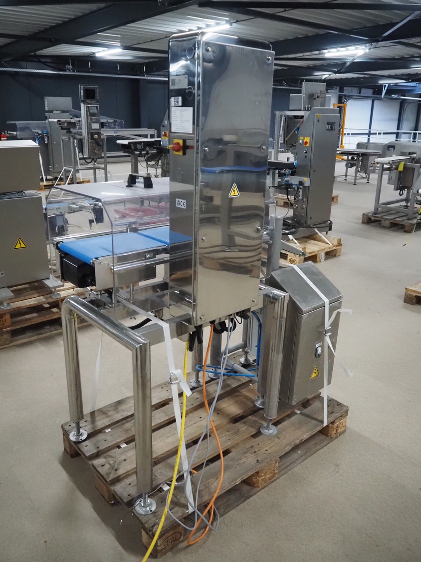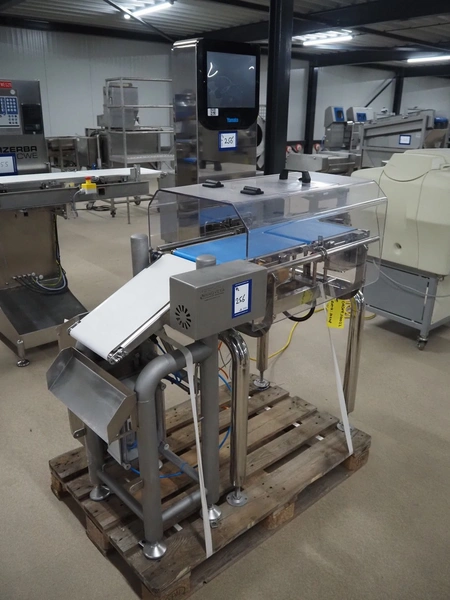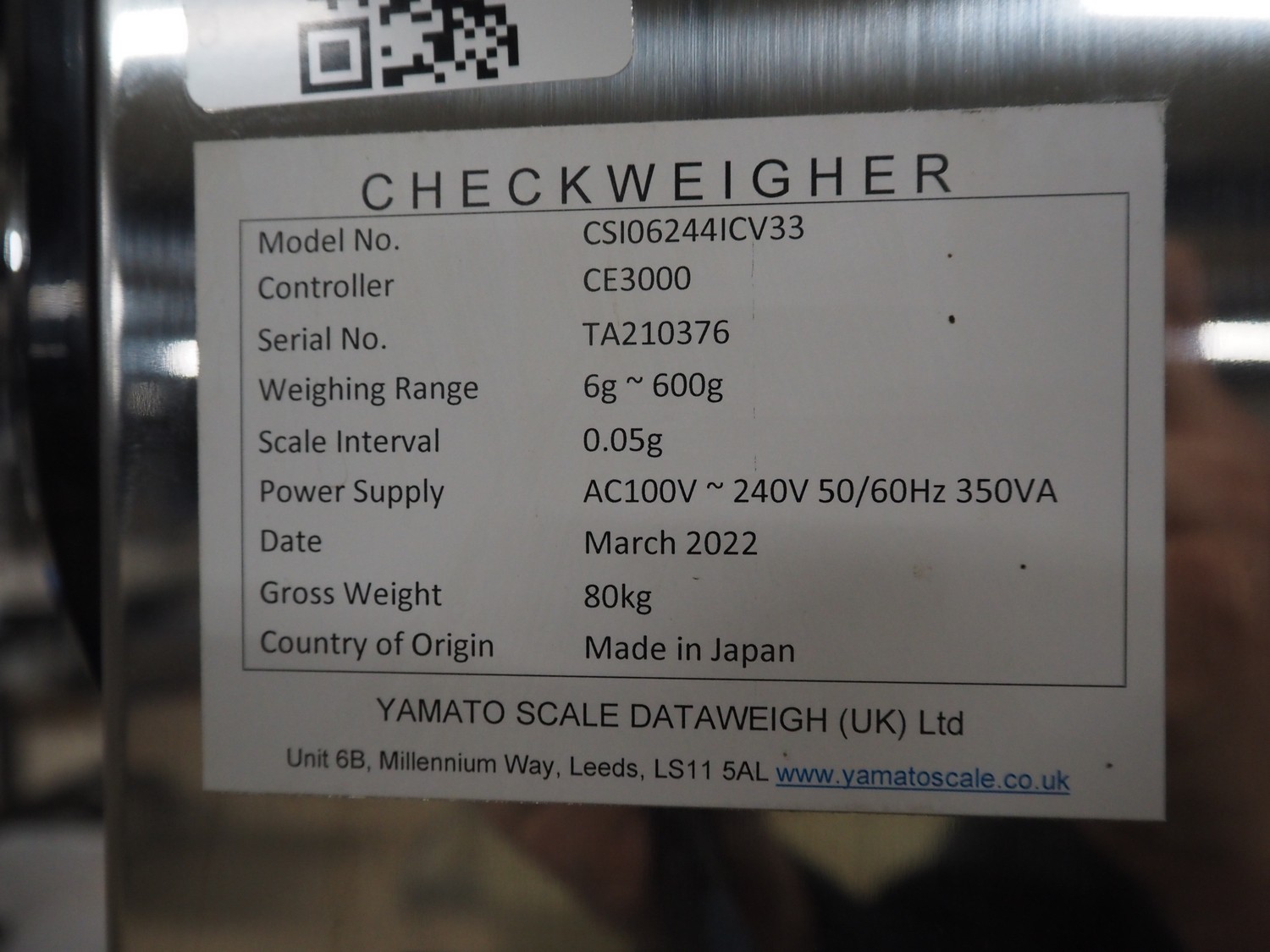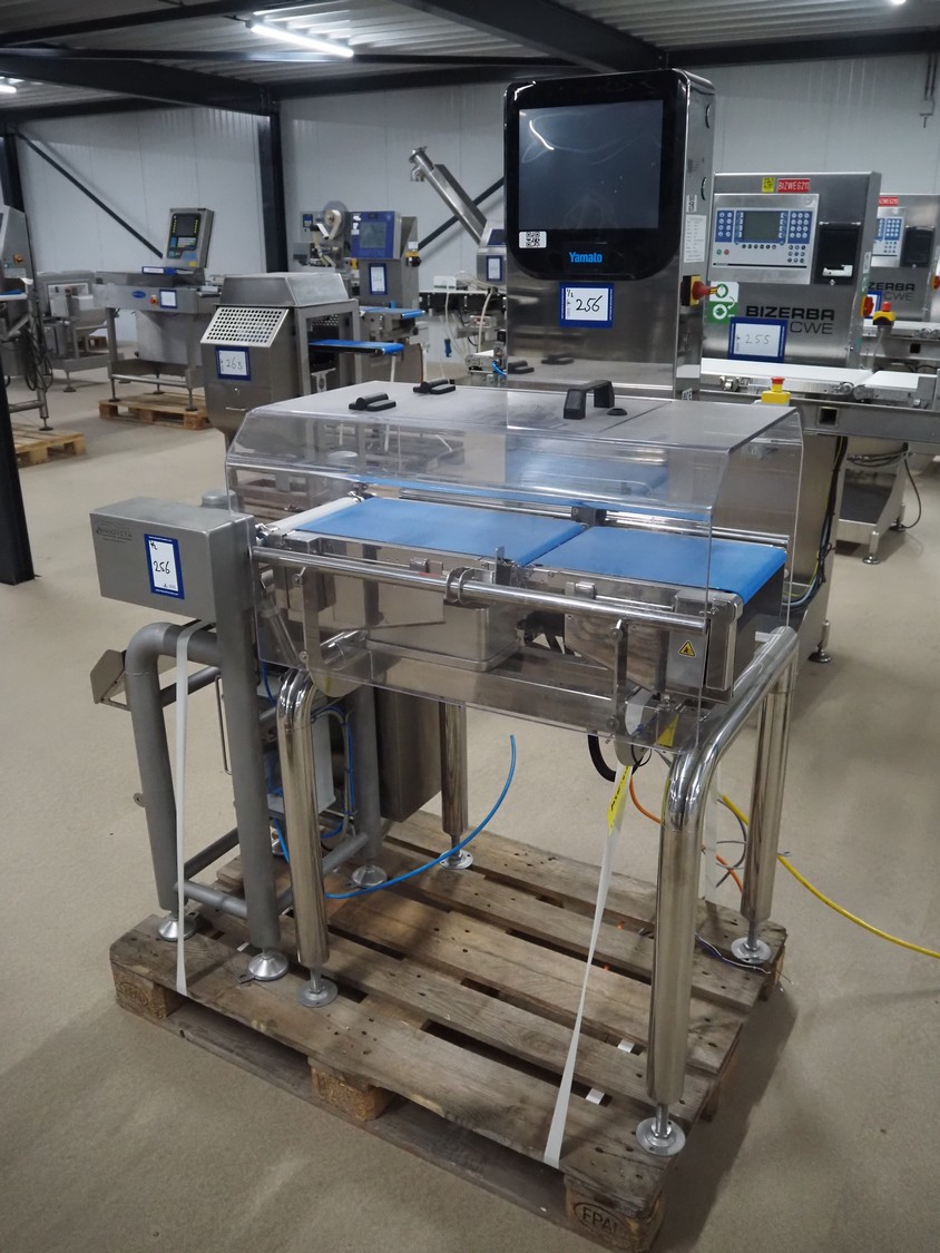Yamato checkweigher with rejecting belt, model: CSI06244ICV33, serial number: TA210376, year of construction: 03/2022, 100/240 V, 1 Ph, 50/60 Hz, maximum weight: 600 g, minimum weight: 6 g, plastic belts, belt width: 240 mm, total dimensions: 1250 mm x 750 mm x 1630 mm.