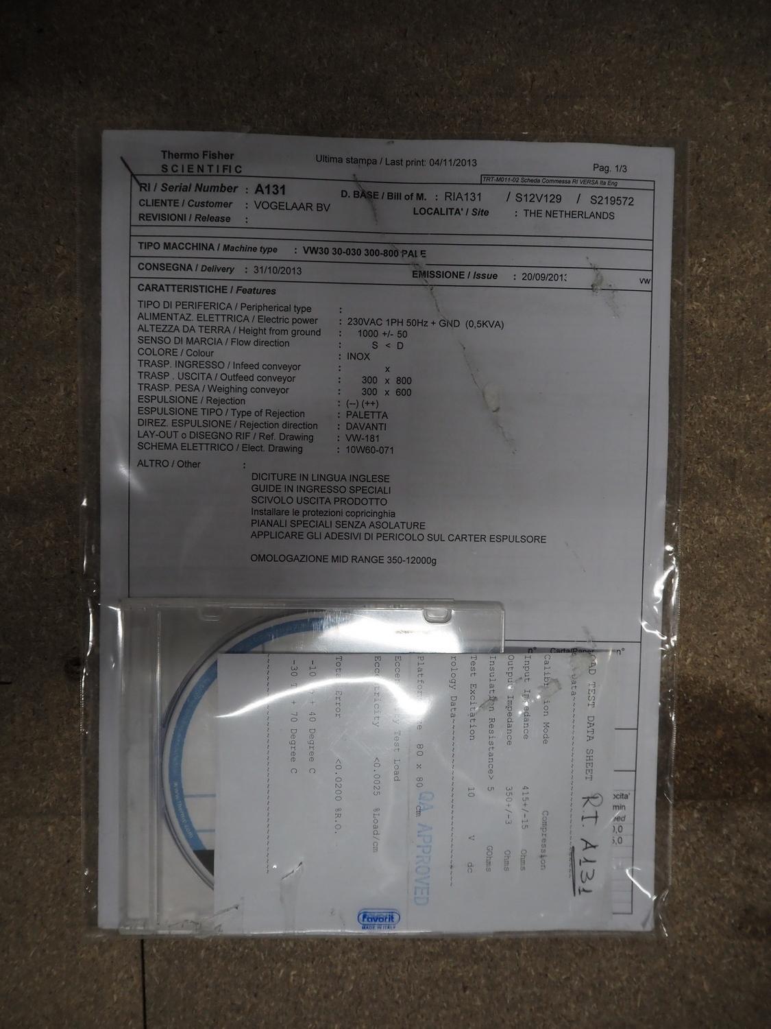 Thermo Scientific checkweigher, model: VersaWeigh, serial number: A132, year of construction: 2013, 230 V, 50-60 Hz, minimum weight: 350 gram, maximum weight: 12000 gram, e=d= 5 gram, plastic belt, belt width: 300 mm, total dimensions: 1420 mm x 850 mm x 1570 mm.