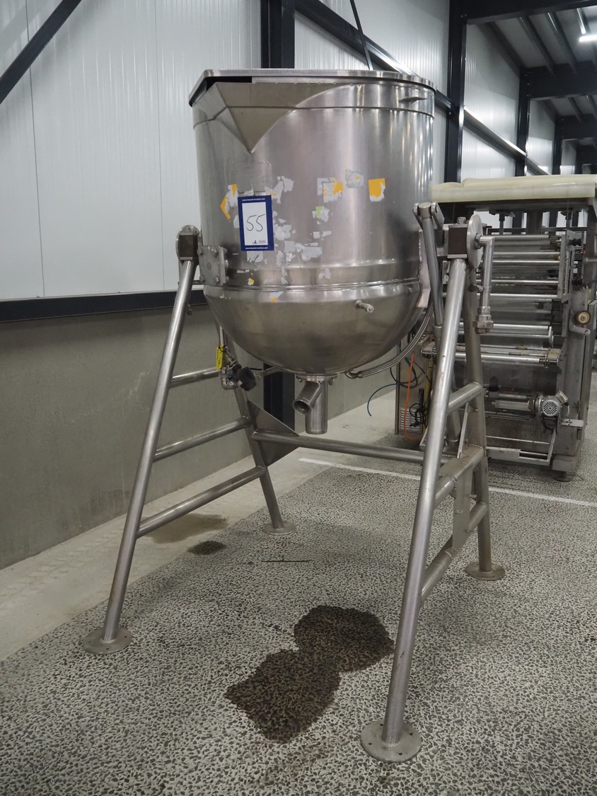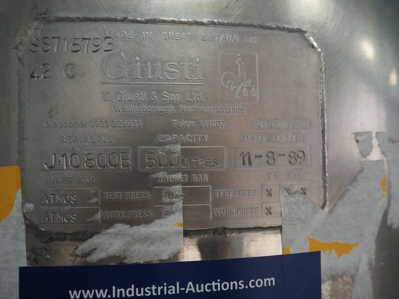 T. Giusti & Son Ltd tiltable vessel, serial number: J-10800B, capacity: 500 liter, dimensions: 1680 mm x 1500 mm x 2280 mm.