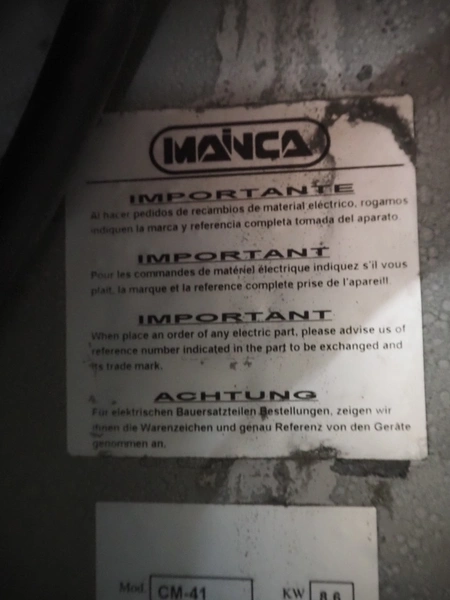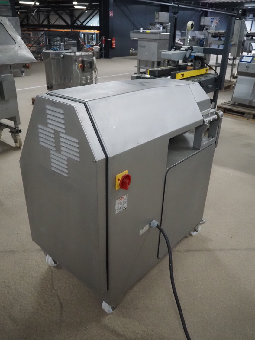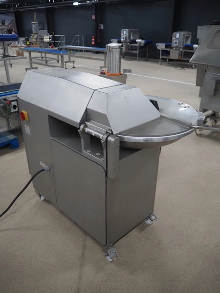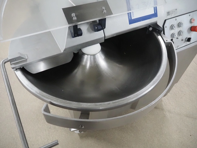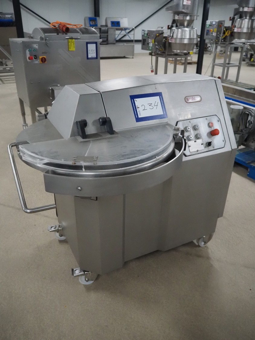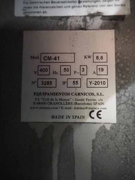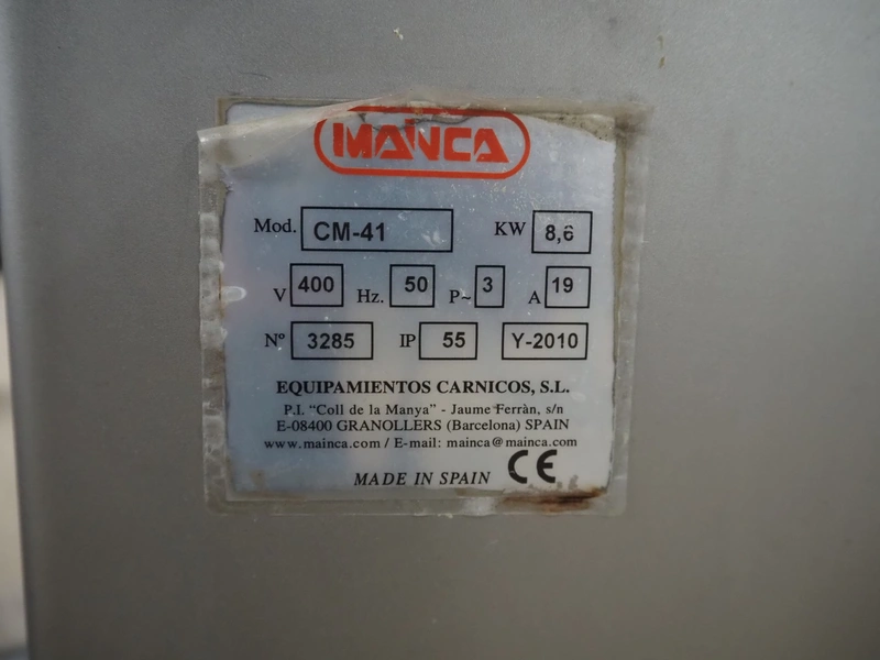Mainca mobile cutter, model: CM-41, number: 3285, year of construction: 2010, 400 V, 3 Ph, 50 Hz, 19 A, 8.6 kW, s/s bowl, volume bowl: 40 liter, s/s knives, 2 speeds, dimensions: 1300 mm x 900 mm x 1100 mm. Including extra knife set.