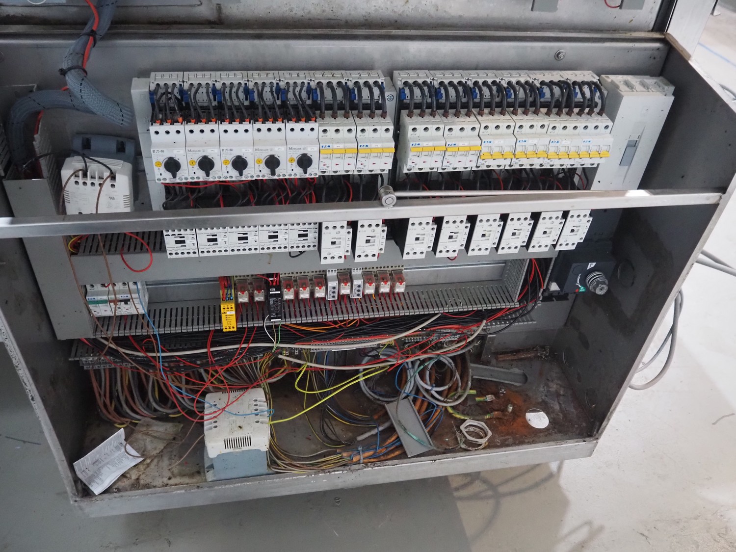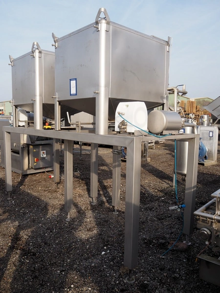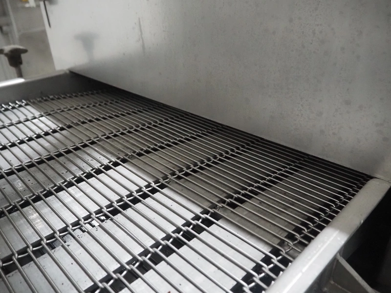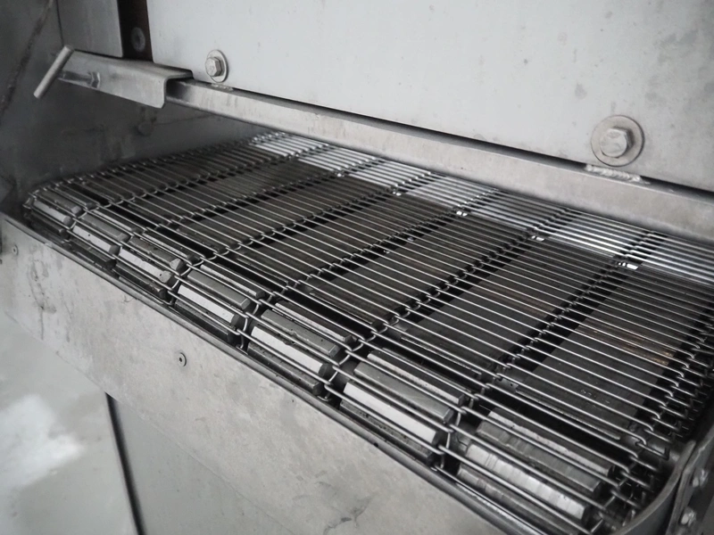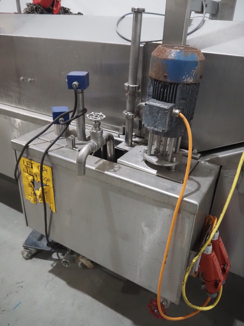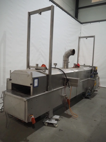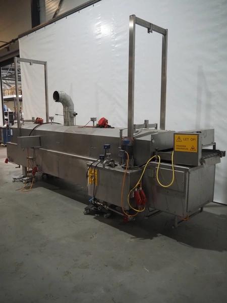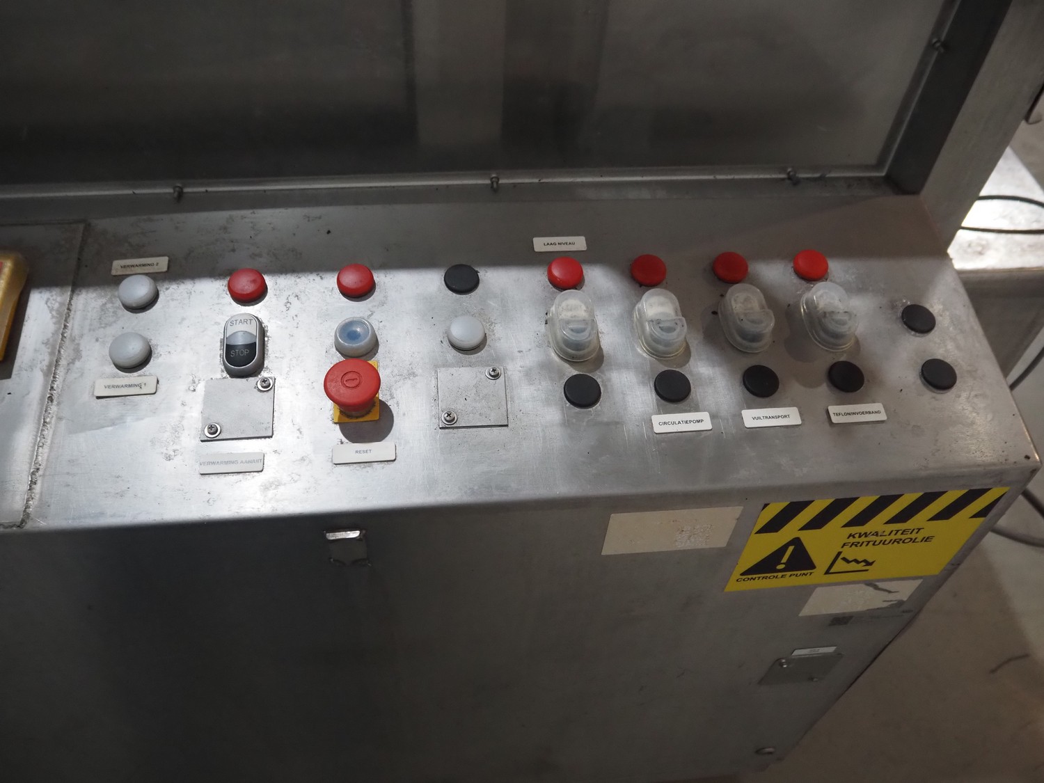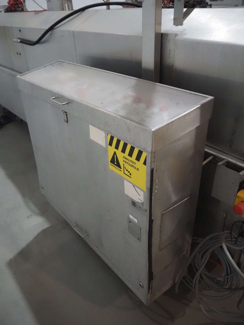Koppens belt fryer, s/s mesh belt, belt width: 600 mm, total dimensions: 5500 mm x 1400 mm x 2950 mm. With Buls system and s/s frame with 2 silos for oil and pallet with switch cabinet and hoists, without rollies.