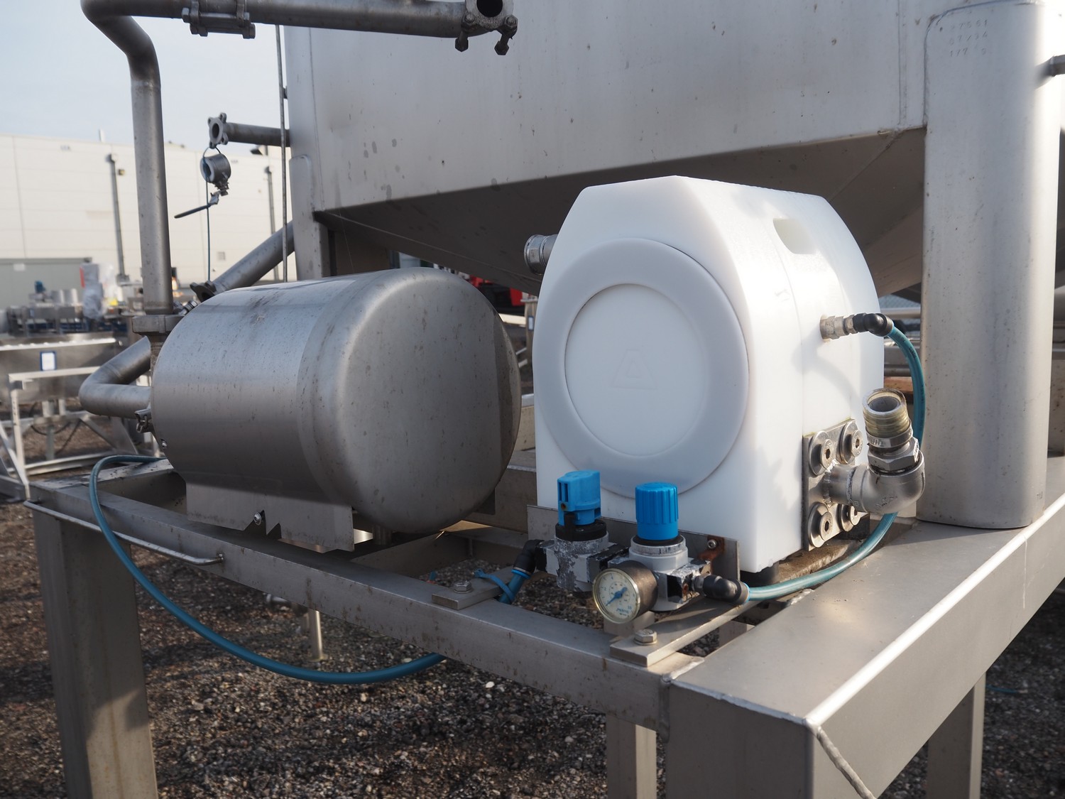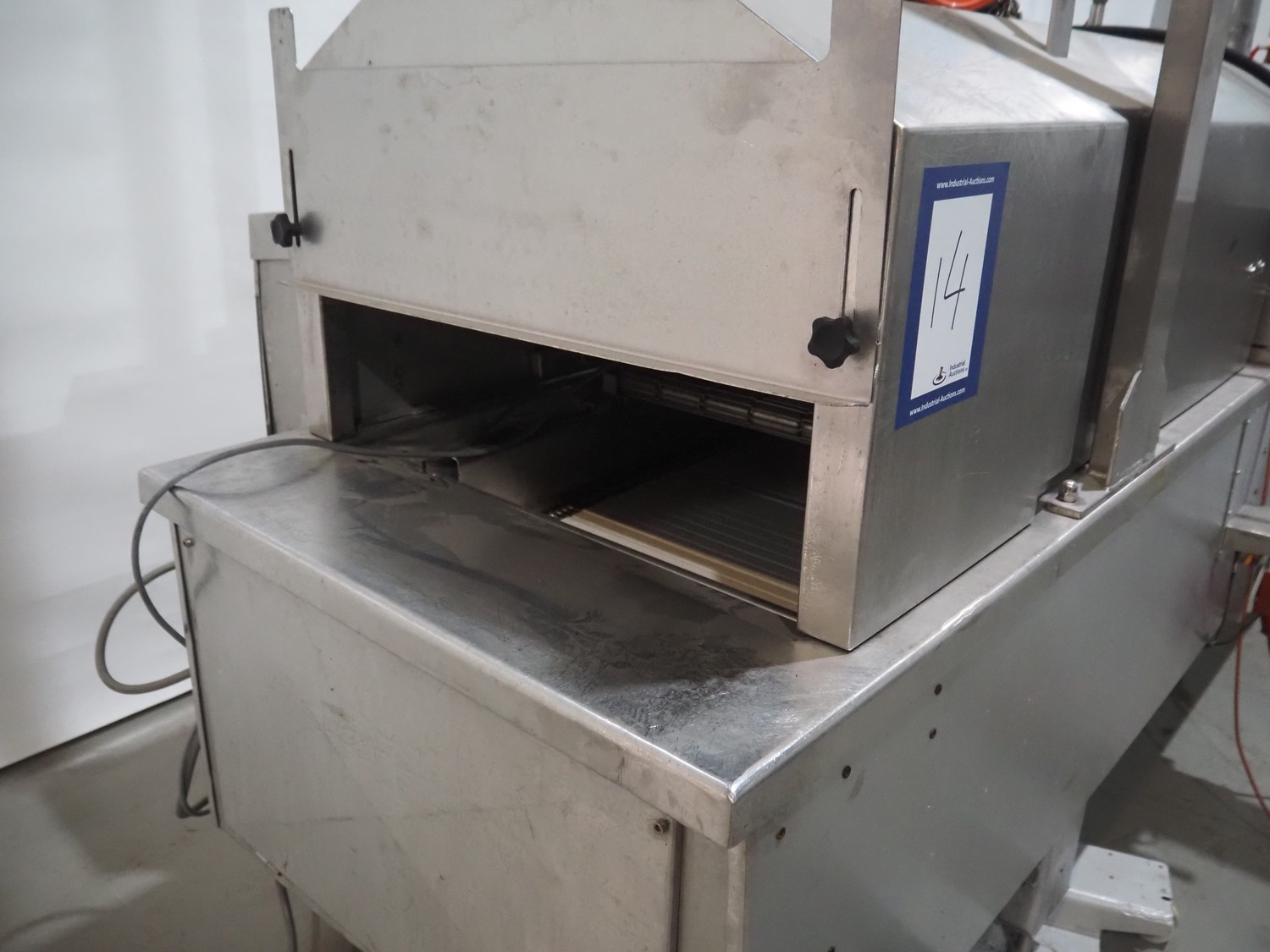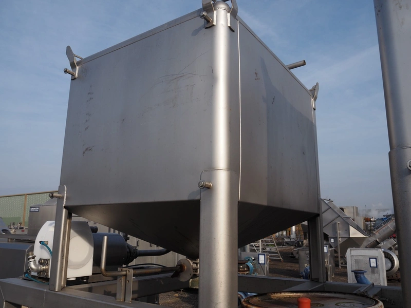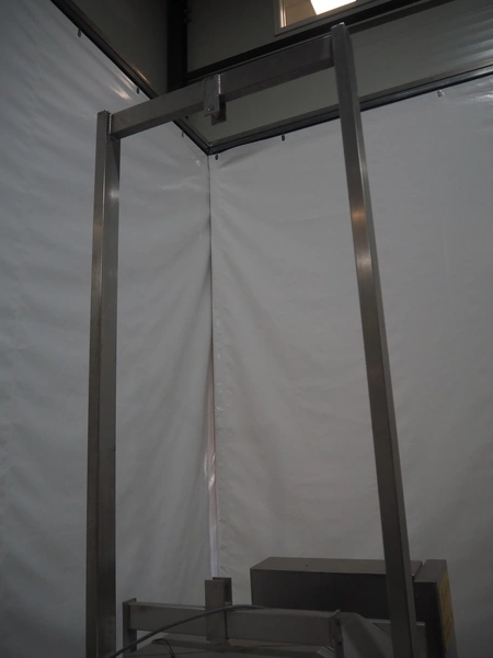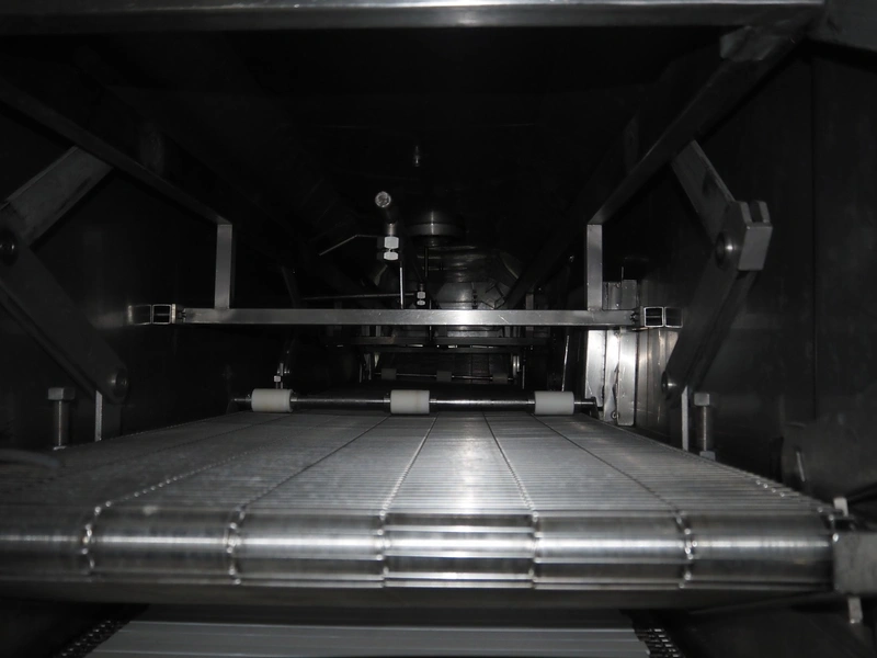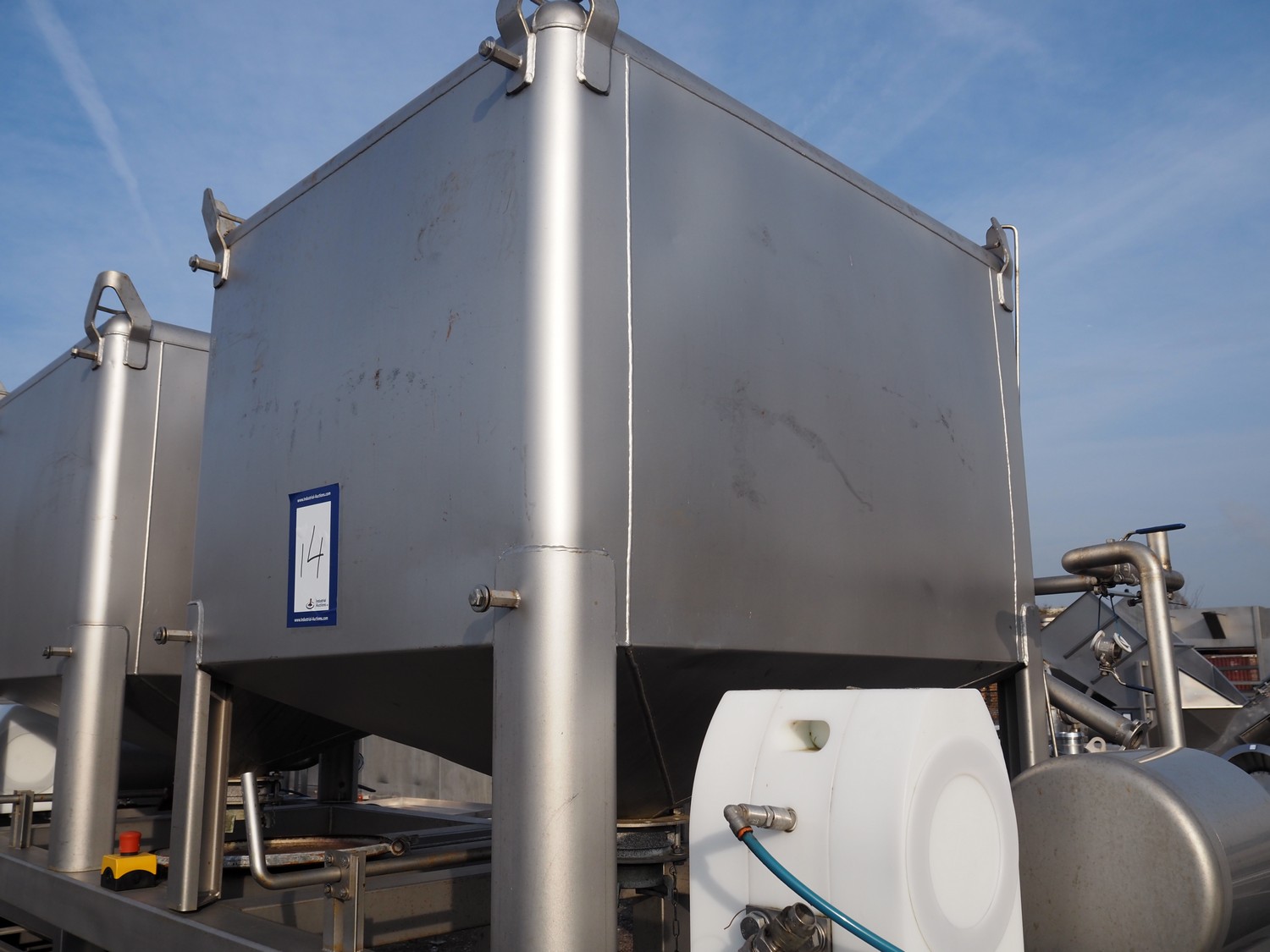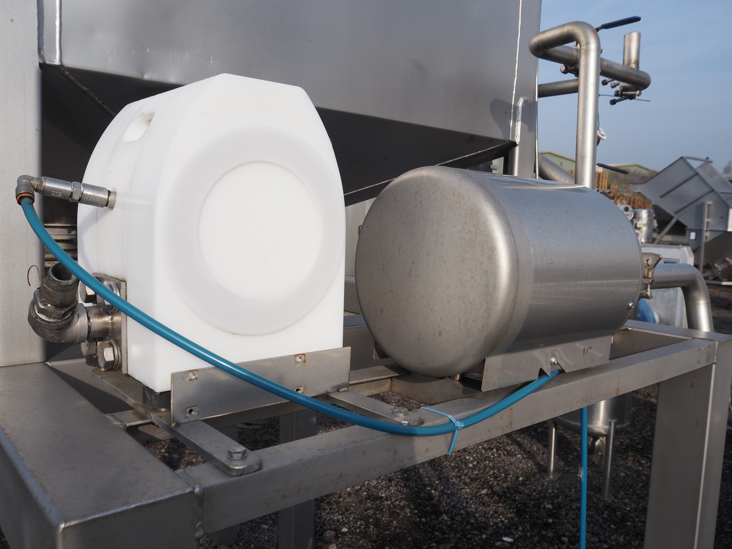 Koppens belt fryer, s/s mesh belt, belt width: 600 mm, total dimensions: 5500 mm x 1400 mm x 2950 mm. With Buls system and s/s frame with 2 silos for oil and pallet with switch cabinet and hoists, without rollies.