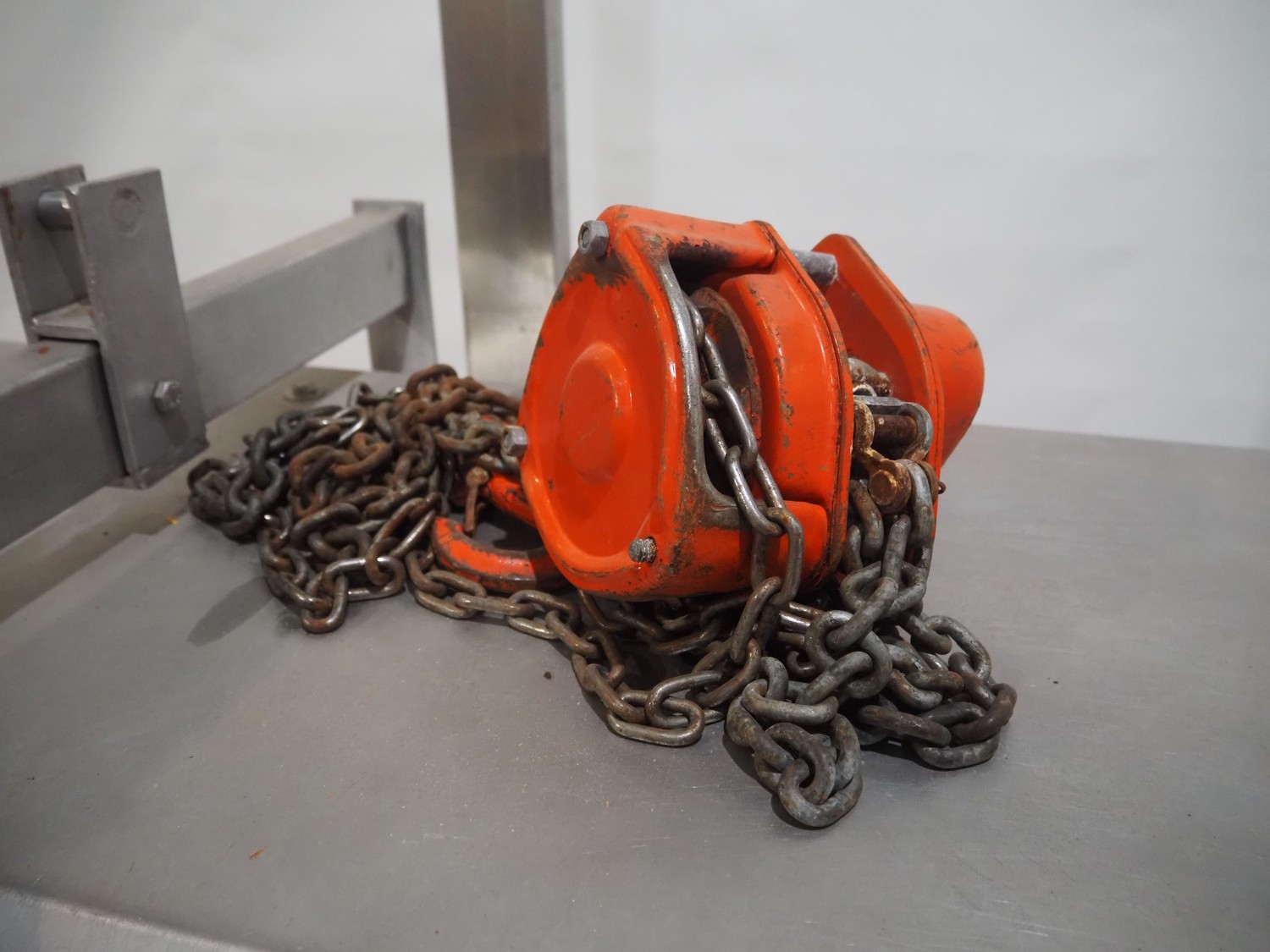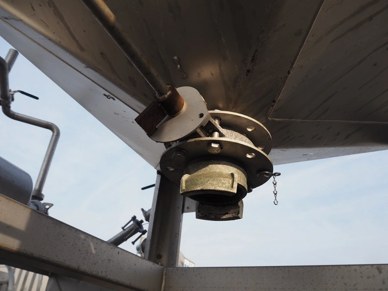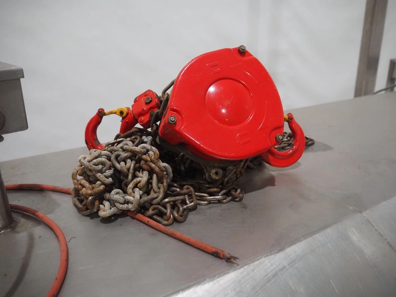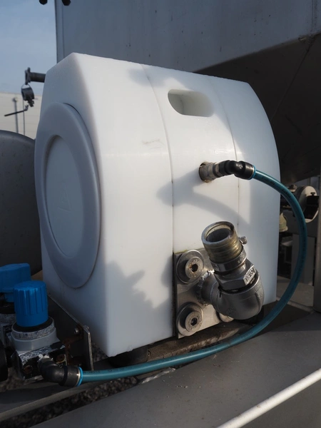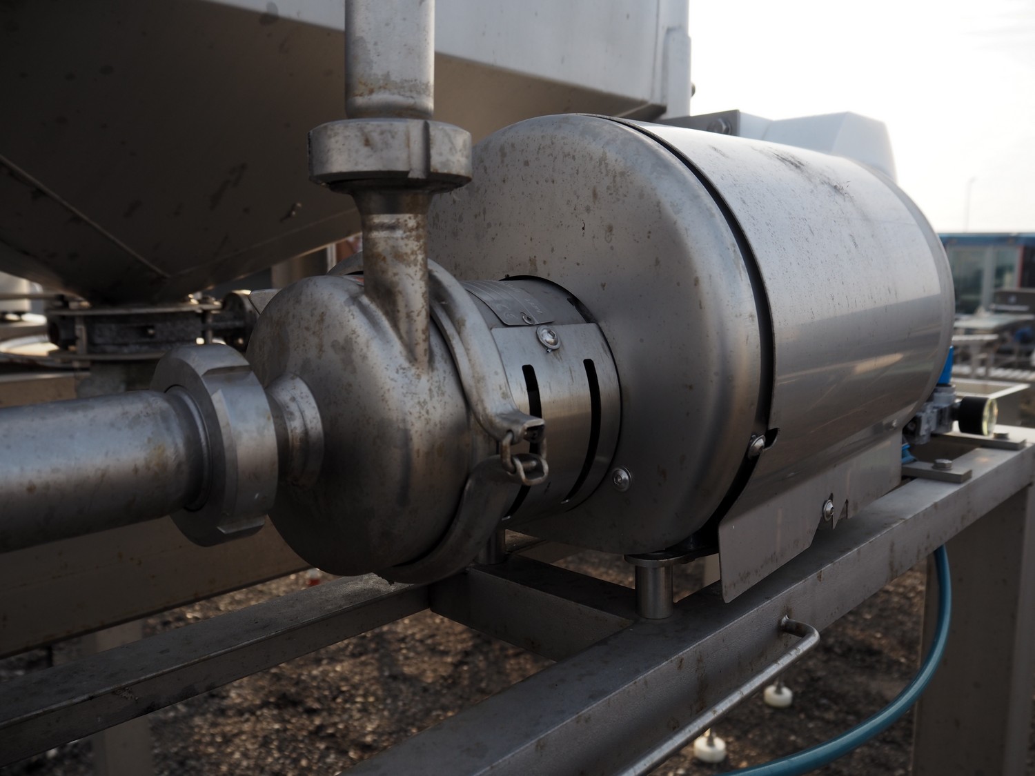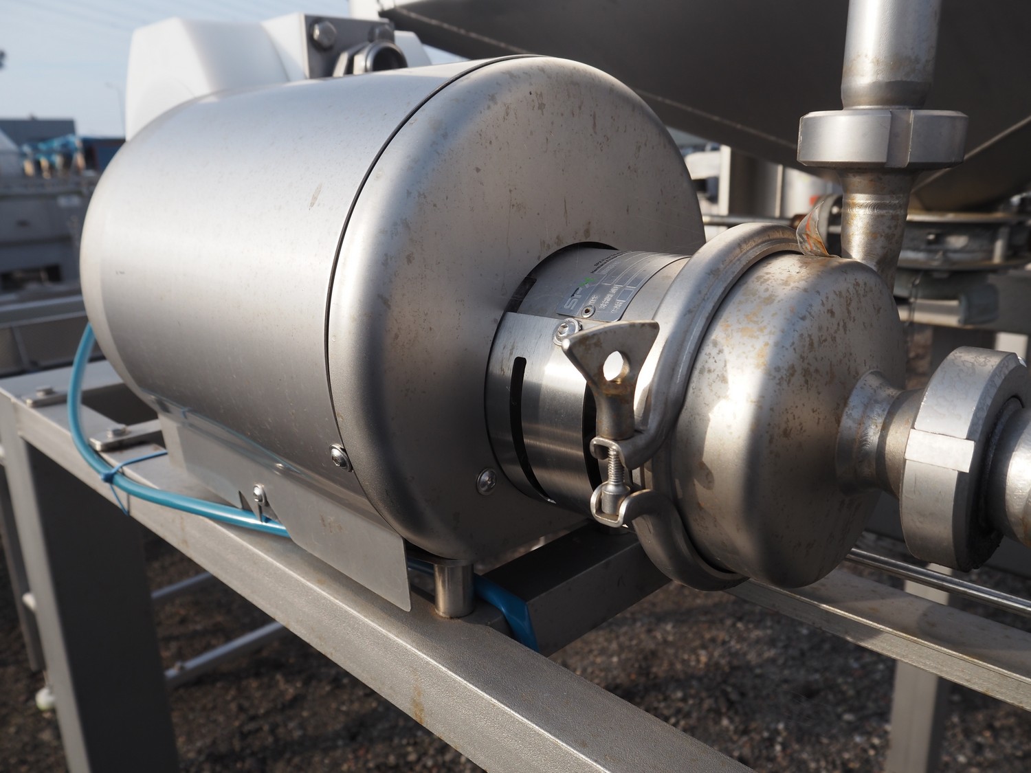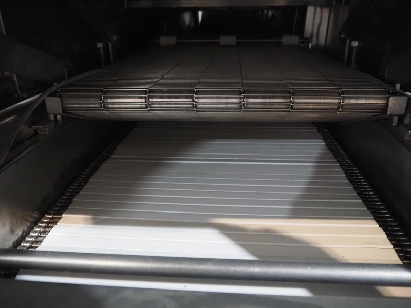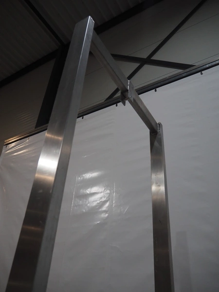 Koppens belt fryer, s/s mesh belt, belt width: 600 mm, total dimensions: 5500 mm x 1400 mm x 2950 mm. With Buls system and s/s frame with 2 silos for oil and pallet with switch cabinet and hoists, without rollies.