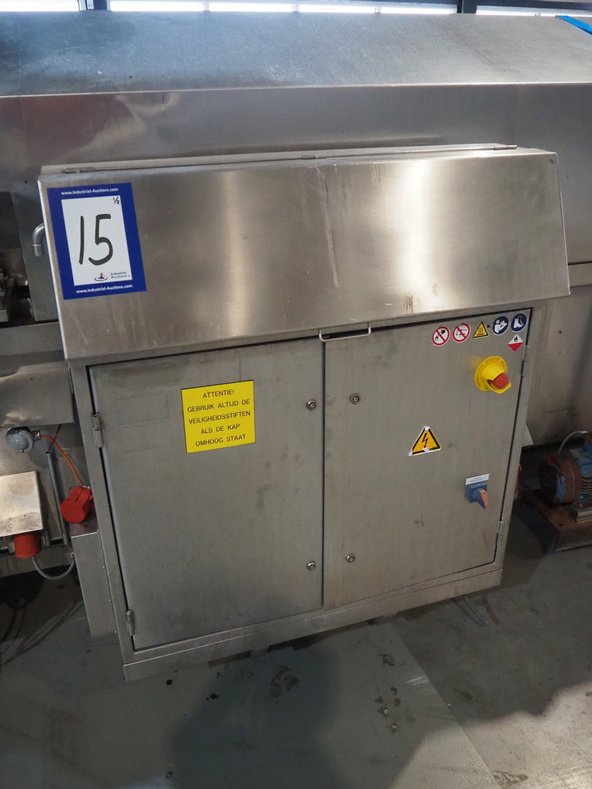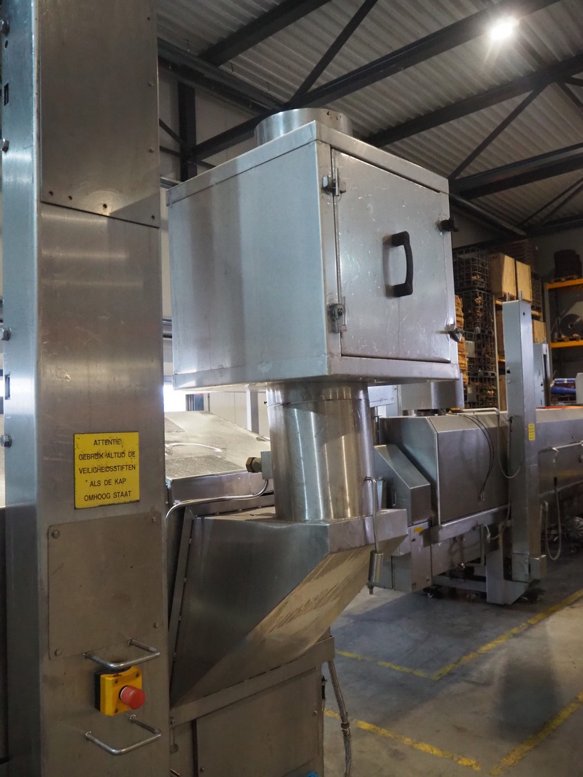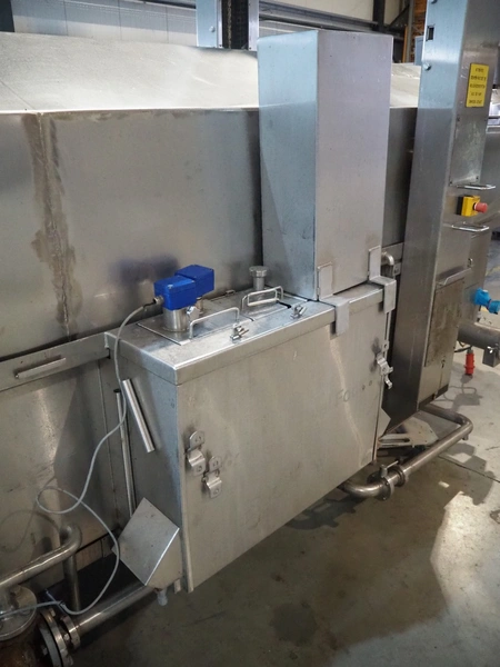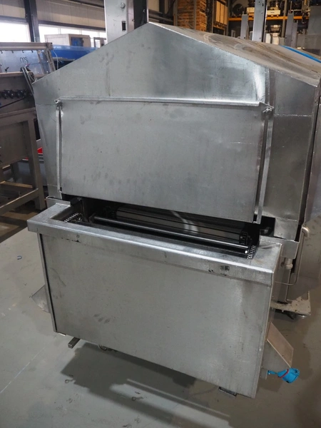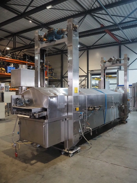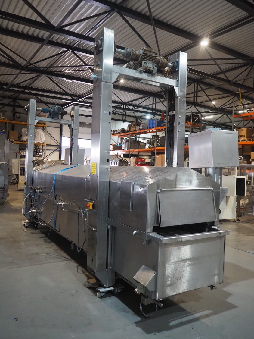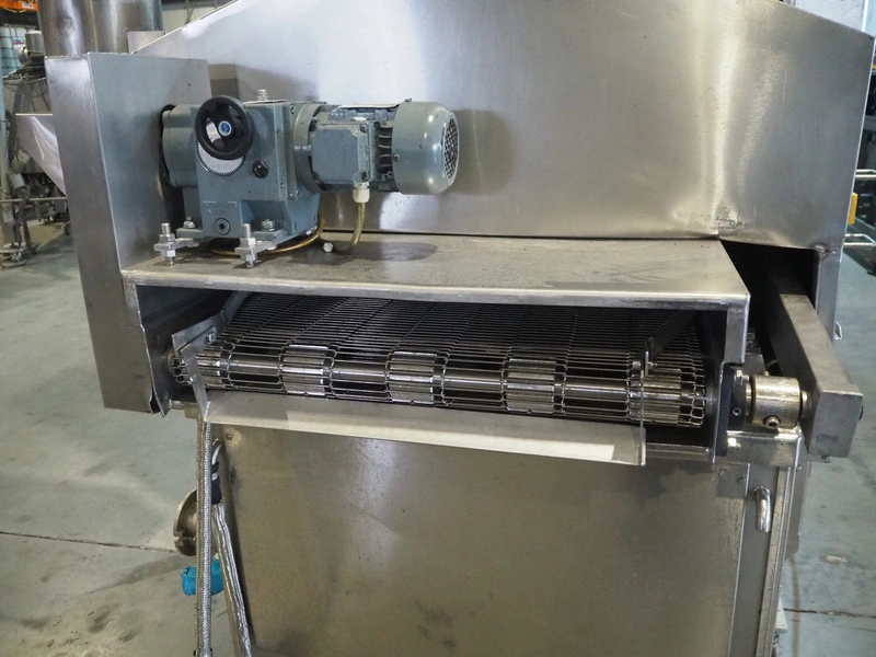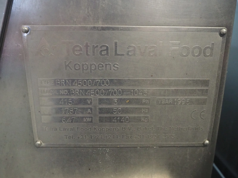 Tetra Laval Food belt fryer, type: BRN 4500/700, machine number: BRN4500/700-1046, year of construction: 1995, 415 V, 3 Ph, 50 Hz, 17.87 A, 6.47 kW, weight: 4140 kg, s/s belt, belt width: 700 mm, total dimensions: 8300 mm x 2000 mm x 3450 mm. Including s/s mobile filter tub, dimensions: 1300 mm x 750 mm x 500 mm. Without rollies.